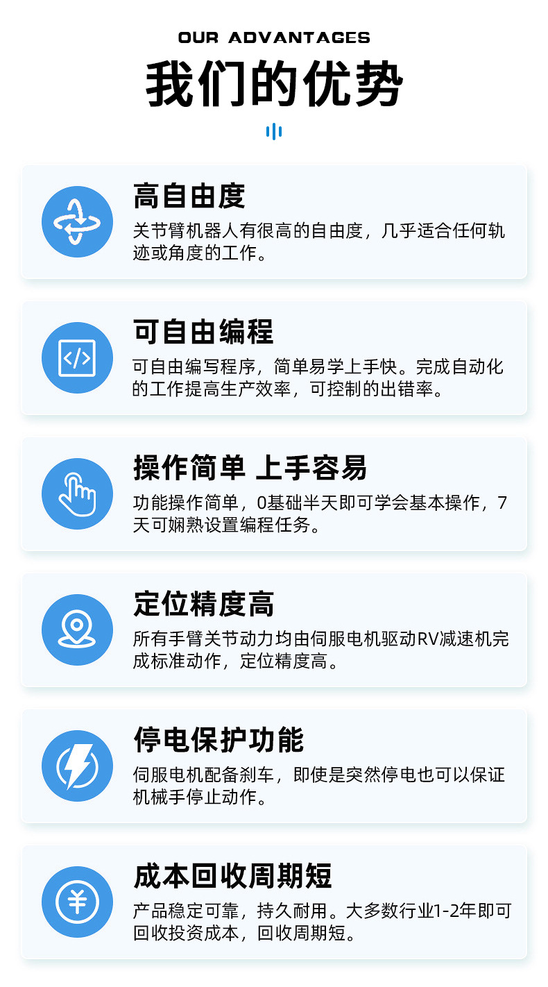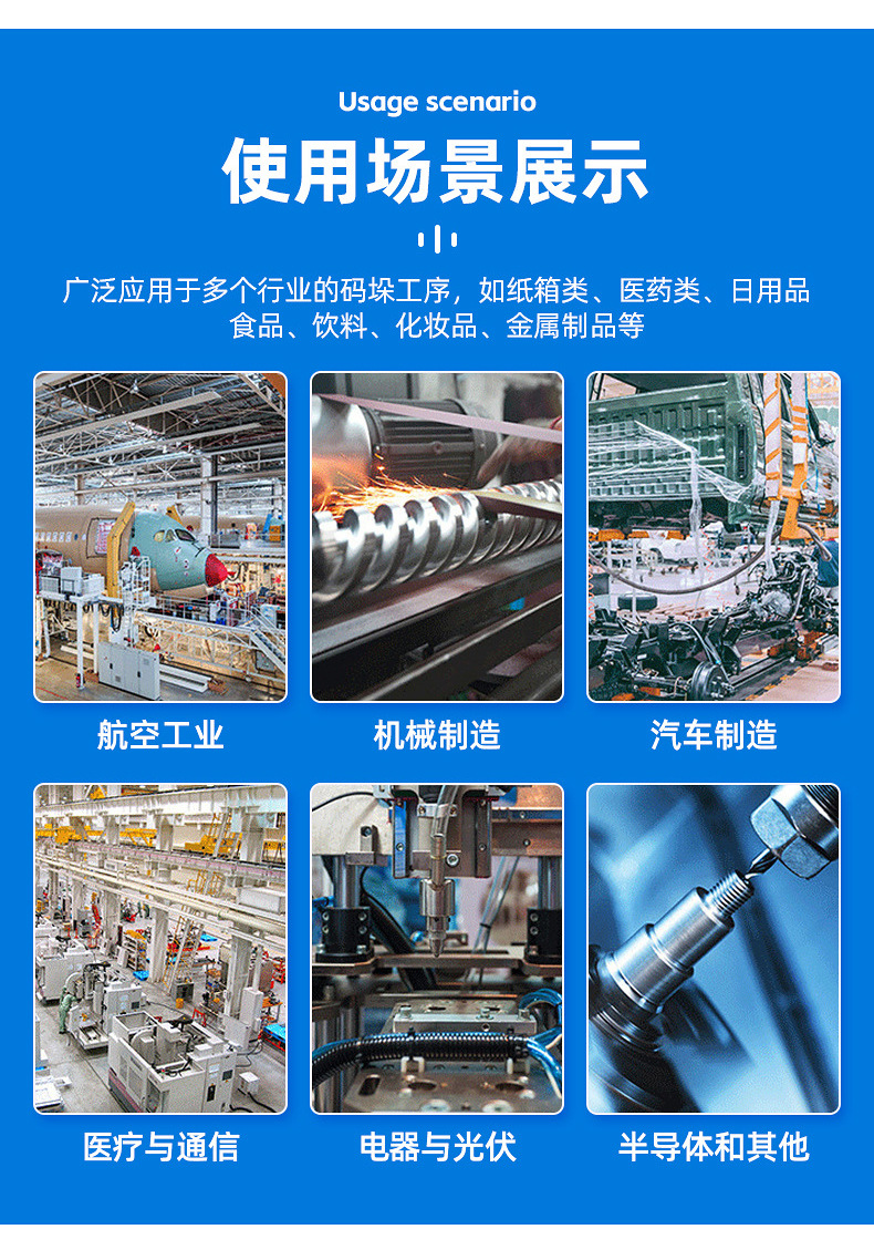 适用行业:可应用于装配、物料搬运、上下料、抛光打磨、去毛刺、涂胶、包装、激光切割等场景