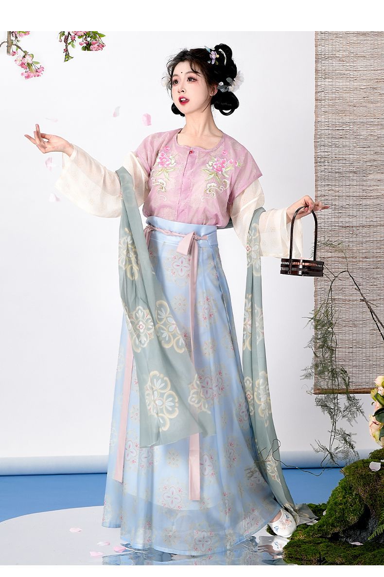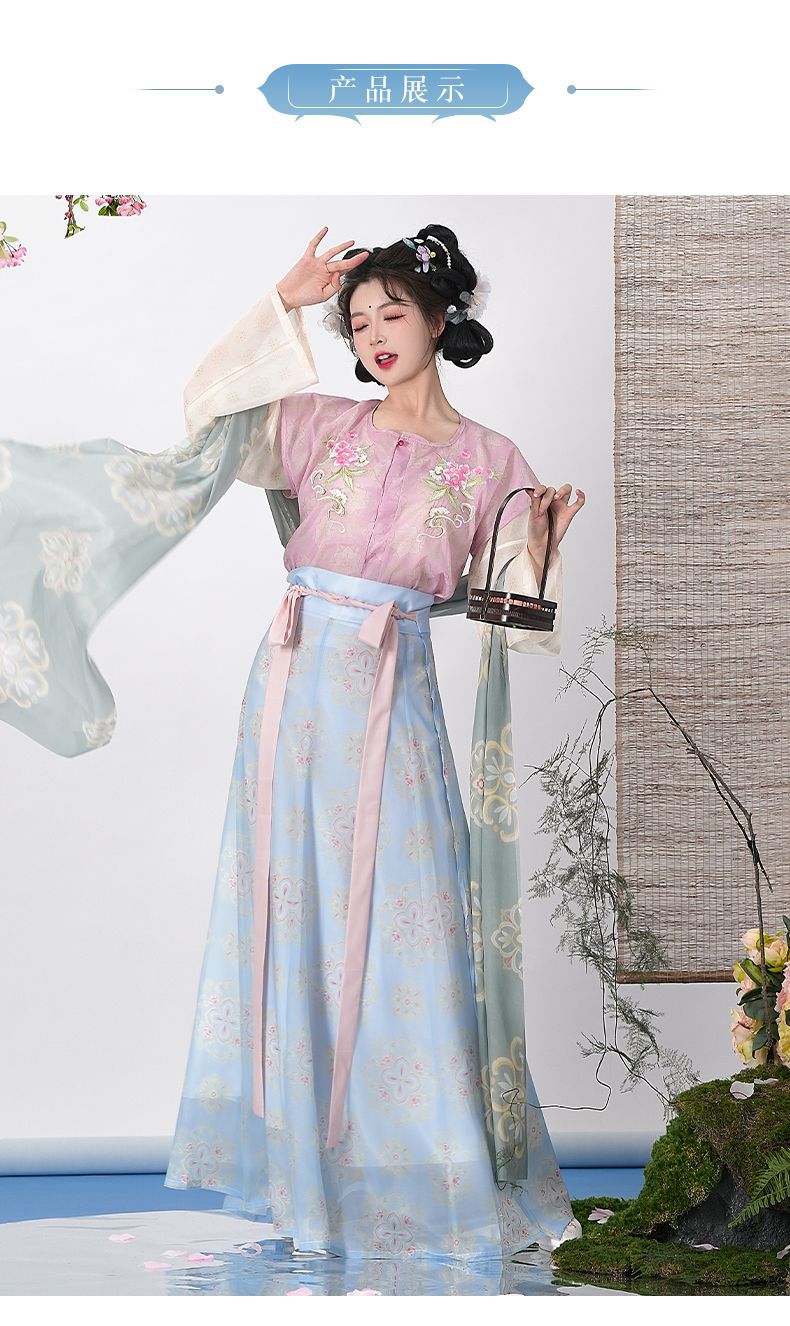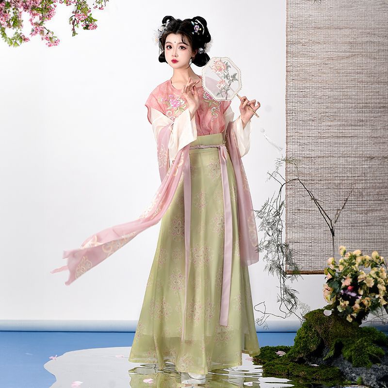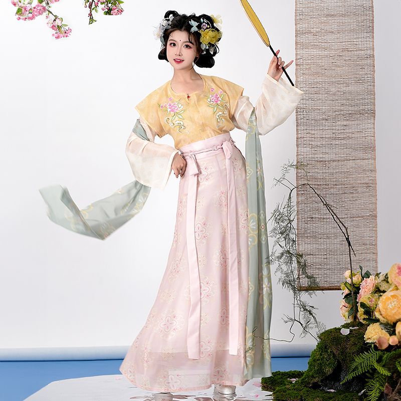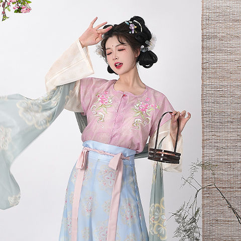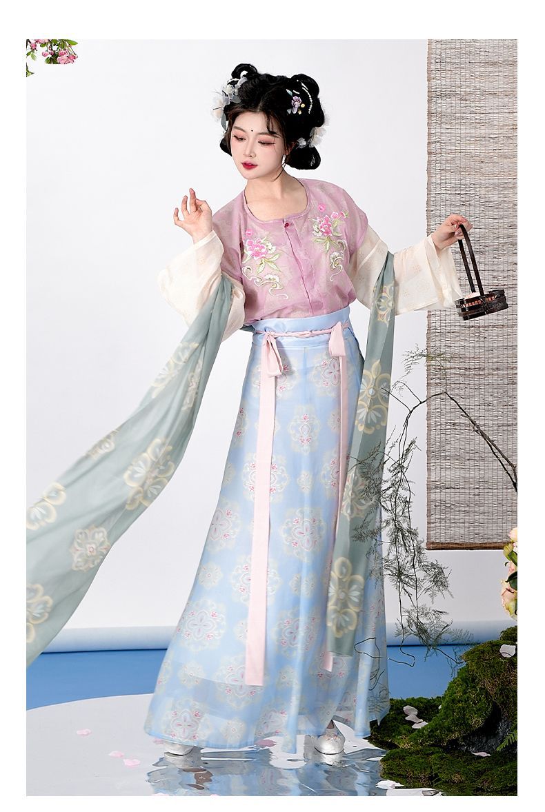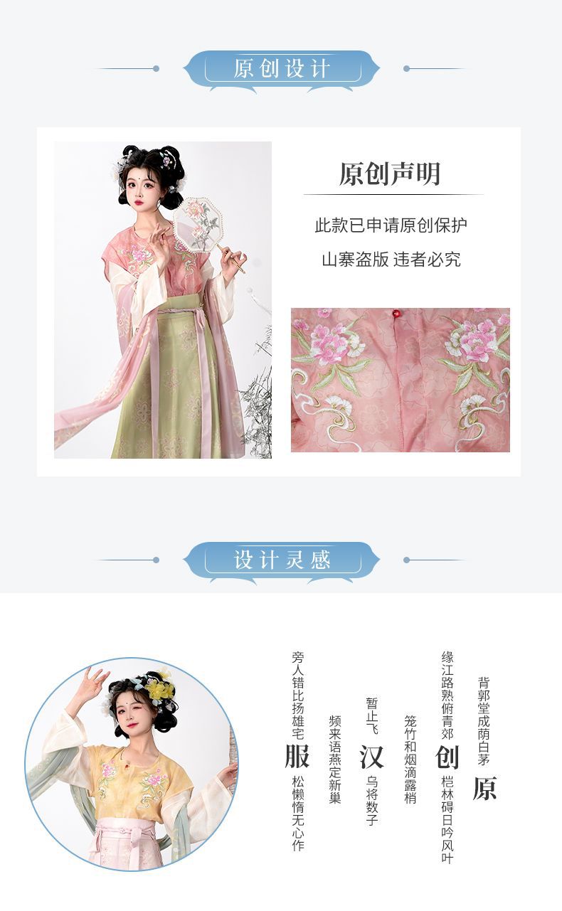 Lingxi Pavilion [Shao Hua] Оригинальная рубашка с круглым вырезом в стиле Тан с вышивкой Ханьфу и восьмипанельной юбкой длиной до талии для повседневной носки весной и летом.