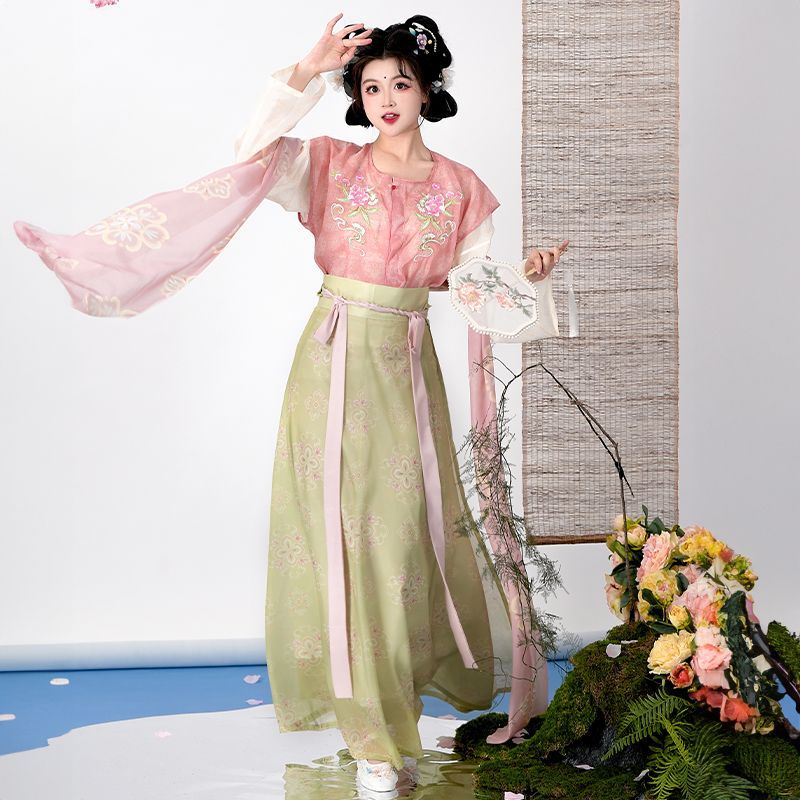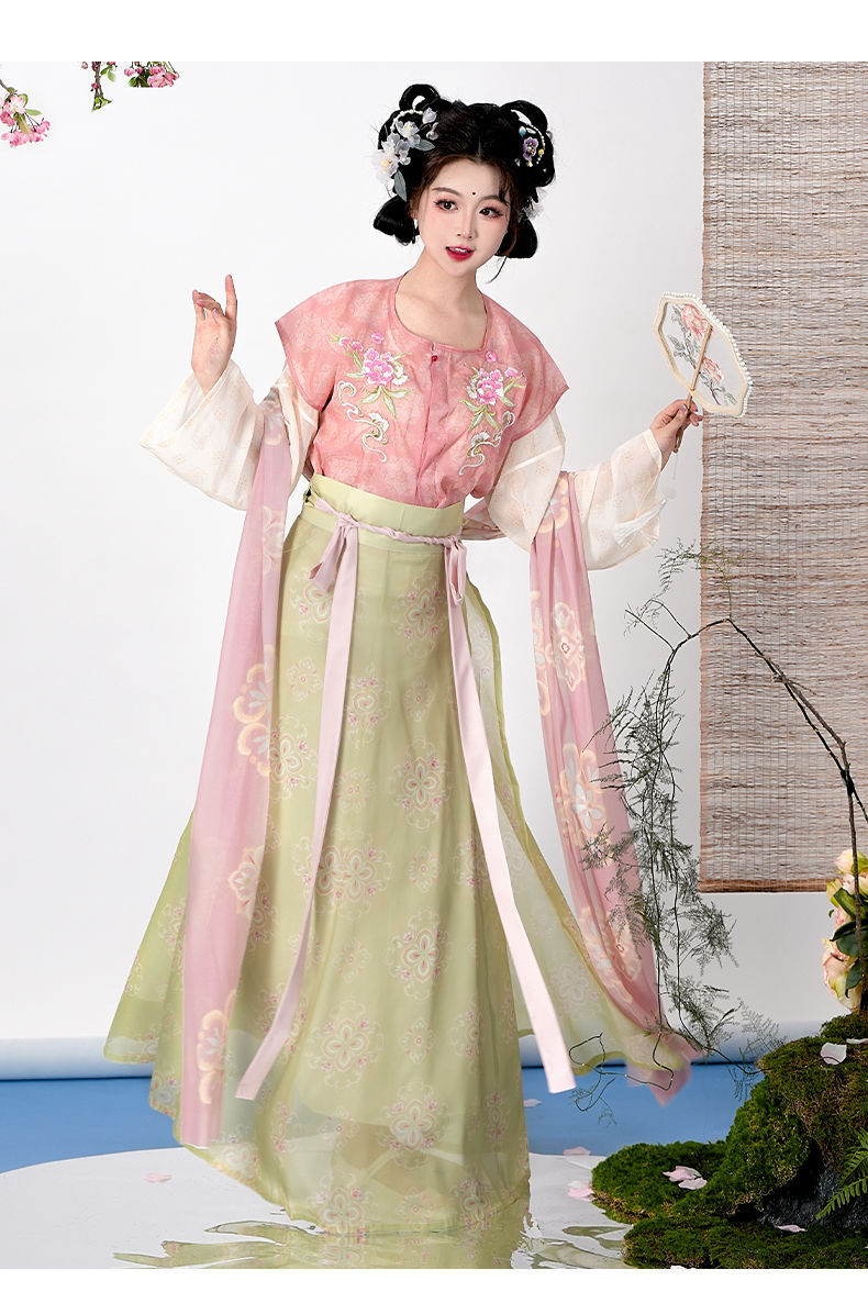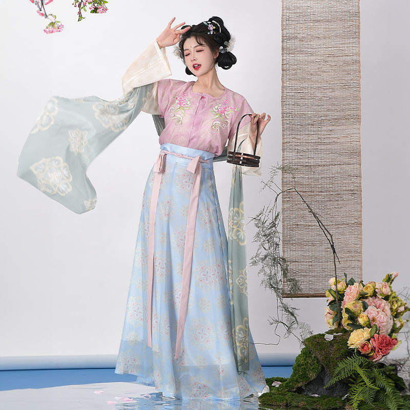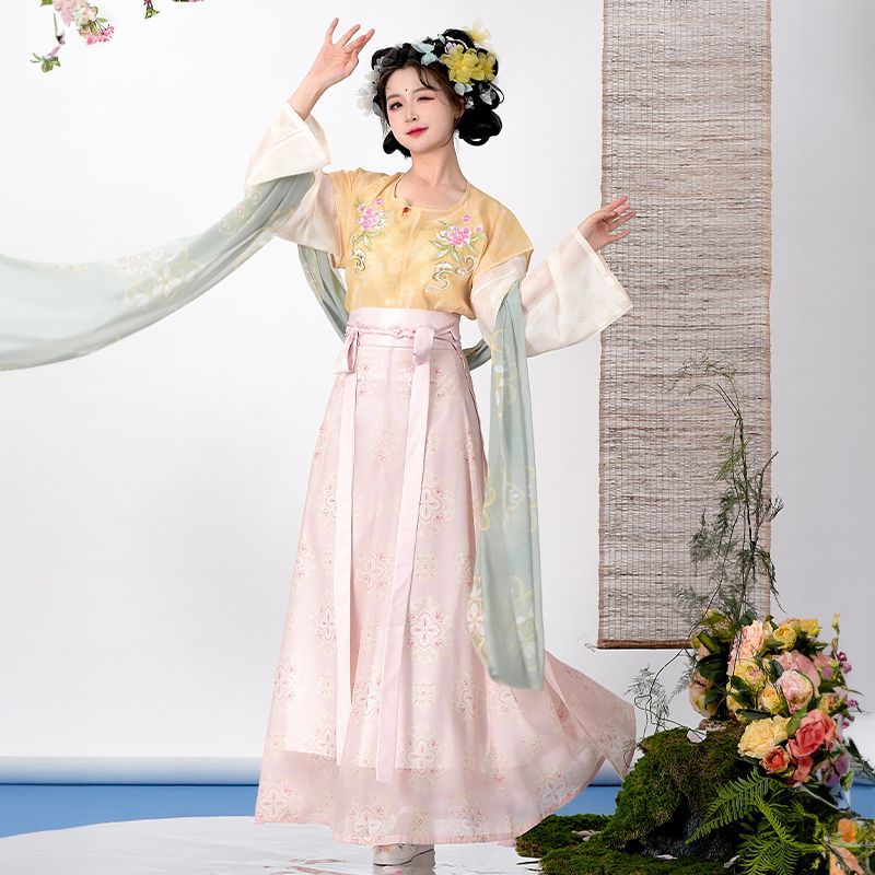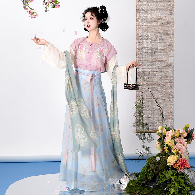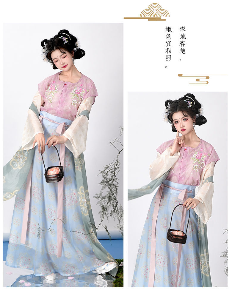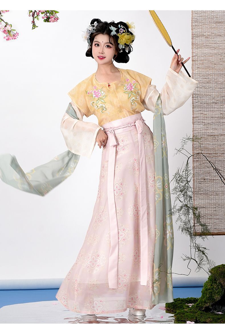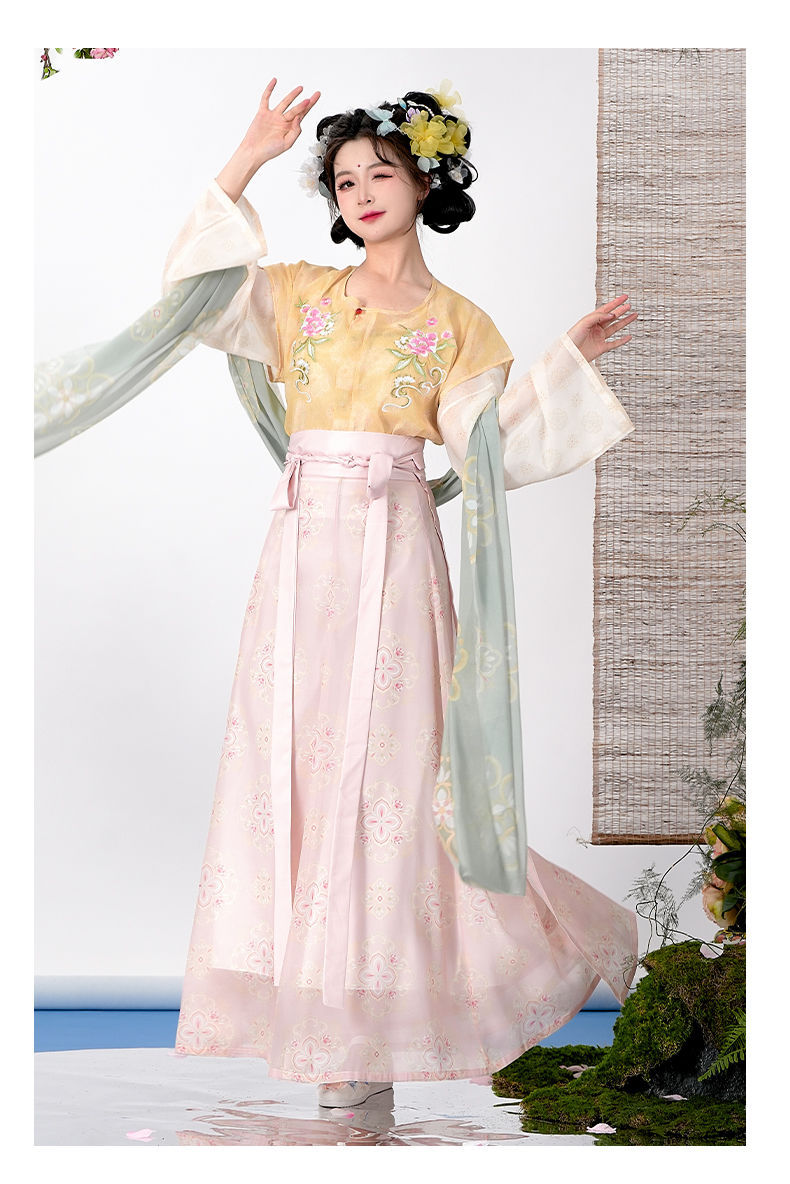 Lingxi Pavilion [Shao Hua] Оригинальная рубашка с круглым вырезом в стиле Тан с вышивкой Ханьфу и восьмипанельной юбкой длиной до талии для повседневной носки весной и летом.