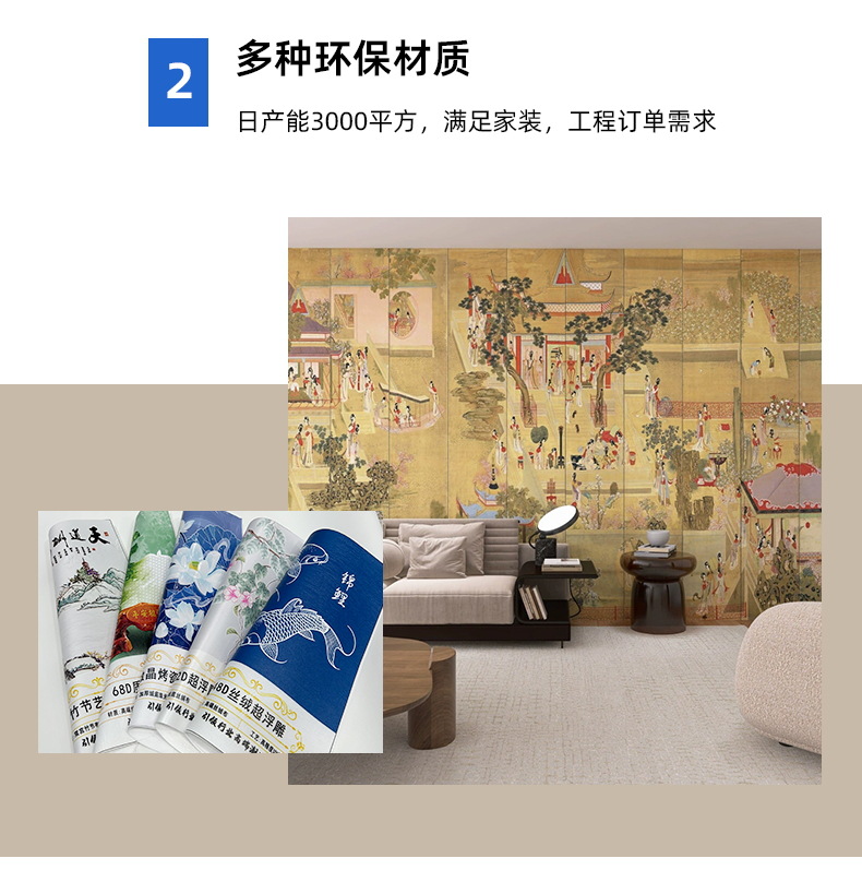3D атласная ткань; 3D шелковая ткань; 3D-вспышка серебряной ткани; Утолщенная атласная ткань; 3D холст; 3D бархатная нижняя перламутровая ткань; Утолщенная атласная бархатная ткань премиум-класса.; Ткань с 3D бесшовным узором снежинок; 3D ткань с двойным дворцовым бамбуковым узором; 3D высококачественная бархатная ткань; 6D вогнутая и выпуклая фреска; 12D хрустальная фреска; Бархатный шелк с тиснением 20D; Бархатный шелк с супертиснением 36D; 48D экологически чистый бархат суперрельеф; Суперрельеф текстуры 68D; Бамбуковая рельефная фреска; Термотрансферное масло для холста; Теплопередача-шелковая ткань; Термотрансферная атласная ткань