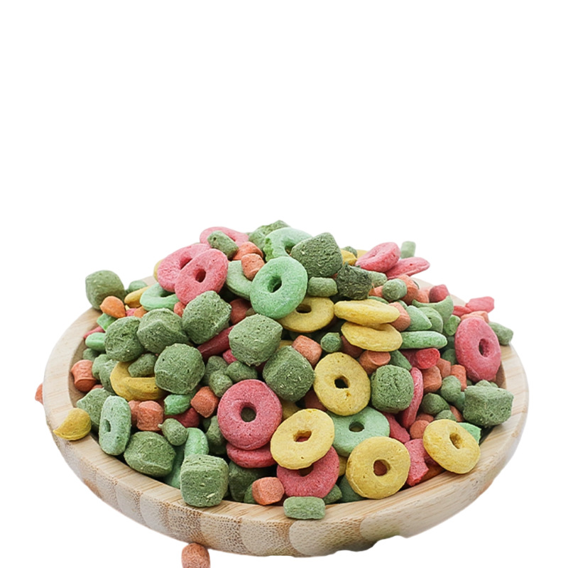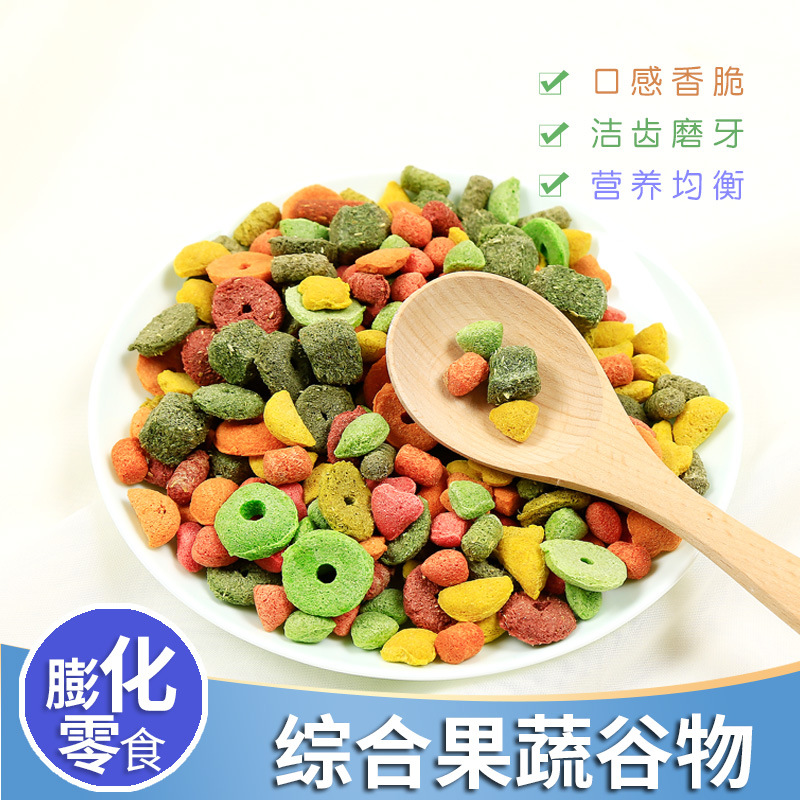 Комплексные закуски из фруктов и овощей; Круг травы с разнообразным зерном; Мини-кирпичи из травы; Четырехцветный полумесяц; Круглый цветной круг травы; Круг хрустящей травы; Красочное печенье в форме сердечек; цветные полоски люцерны; Гранулы из слоеной травы; Поликристаллическое печенье Тимоти; Тимоти палочка для прорезывания зубов; зерновые хлопья; кукурузные хлопья; банановые чипсы; кубики сельдерея; Гранулы со вкусом ананаса; Гранулы со вкусом клубники; гранулы со вкусом томата; Гранулы со вкусом манго; гранулы со вкусом моркови; Гранулы со вкусом папайи; круг папайи; Кольца со вкусом зеленого яблока
