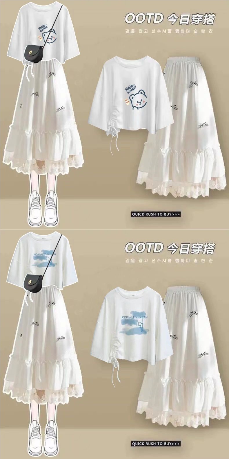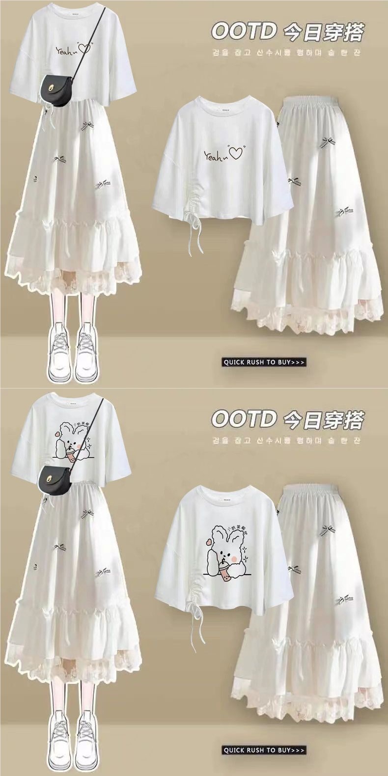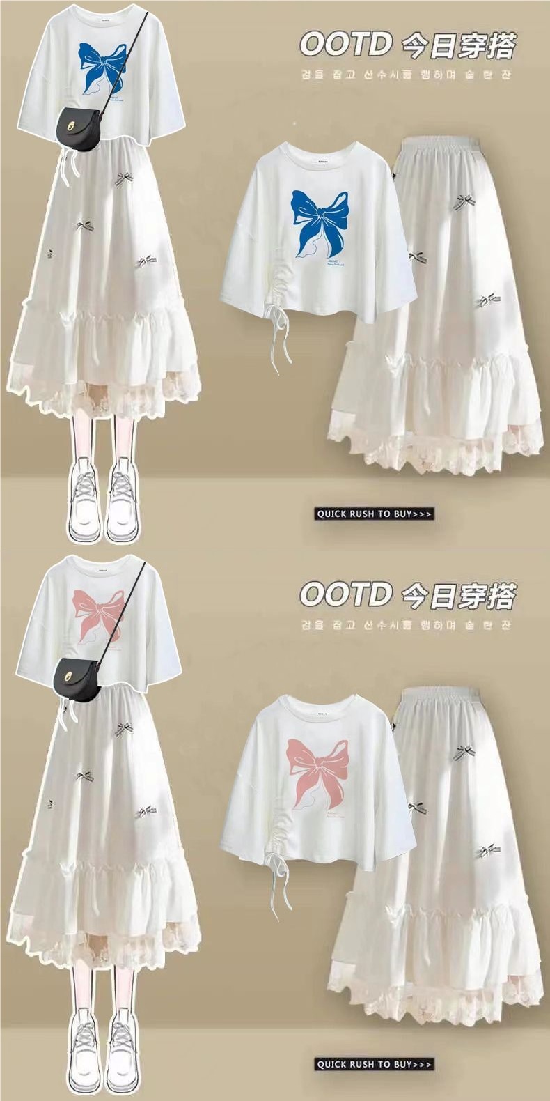 Летний комплект 2025 года: женская корейская футболка свободного кроя с коротким рукавом и юбка-суперфейя