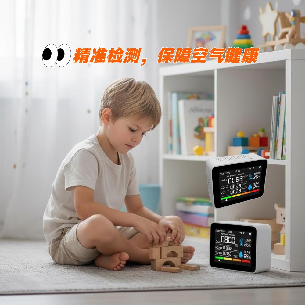 CO2(二氧化碳), HCHO(甲醛),TVOC(挥发性有机化合物总和),PM2.5, PM1.0, PM10, 温度和湿度检测,温度报警,时间,日期,涂鸦APP远程实时监控; 12合1功能。2.8寸 彩色 显示屏,涂鸦智能WIFI APP,可远程实时监控数据,可查看日,月度历史数据。每次连接 涂鸦智能APP后,时间日期会自动和手机同步更新。