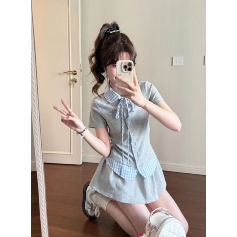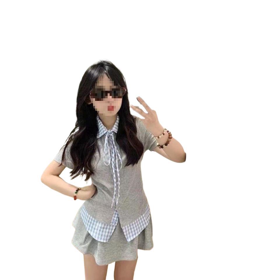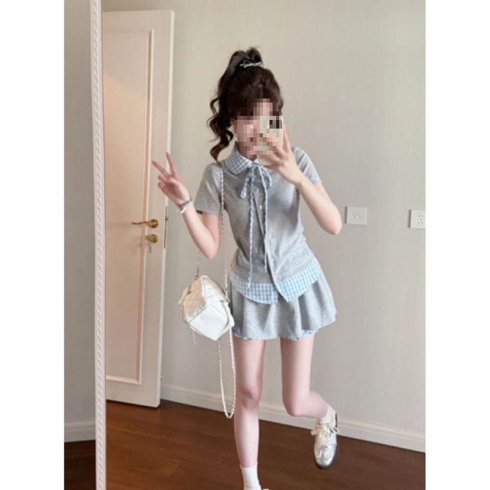 Сладкий и пряный студенческий стиль, контрастная цветная строчка, клетчатый утягивающий топ с короткими рукавами, женская юбка с высокой талией, костюм из двух предметов