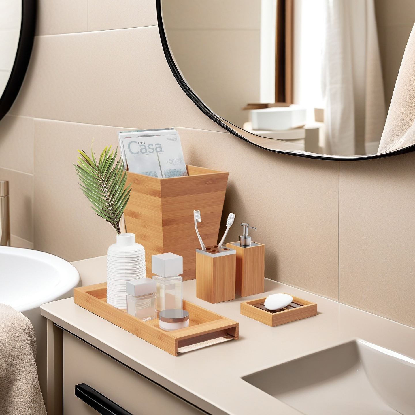 Роскошный бамбуковый набор для ванной комнаты из пяти предметов: стакан для зубной щетки, бутылка для шампуня, мыльница, коробка для хранения, поднос, набор туалетных принадлежностей.