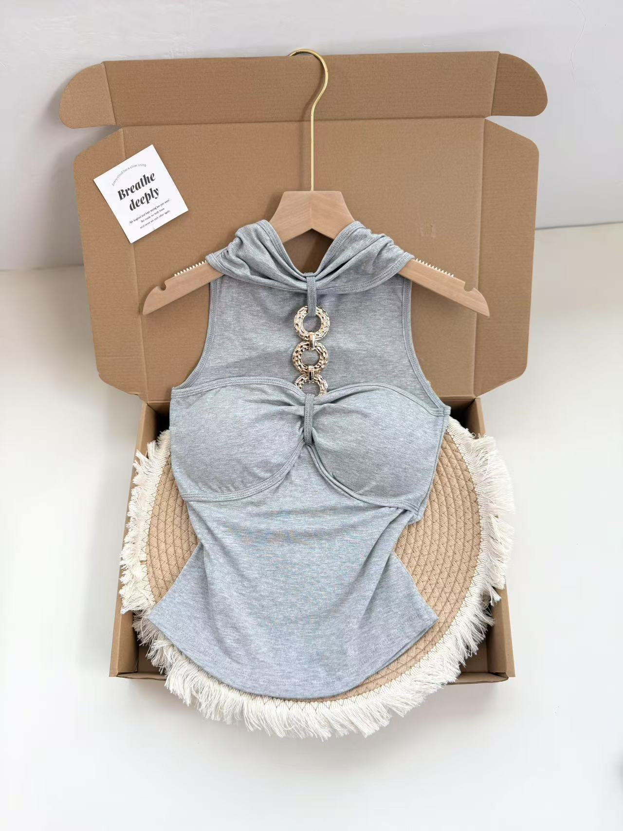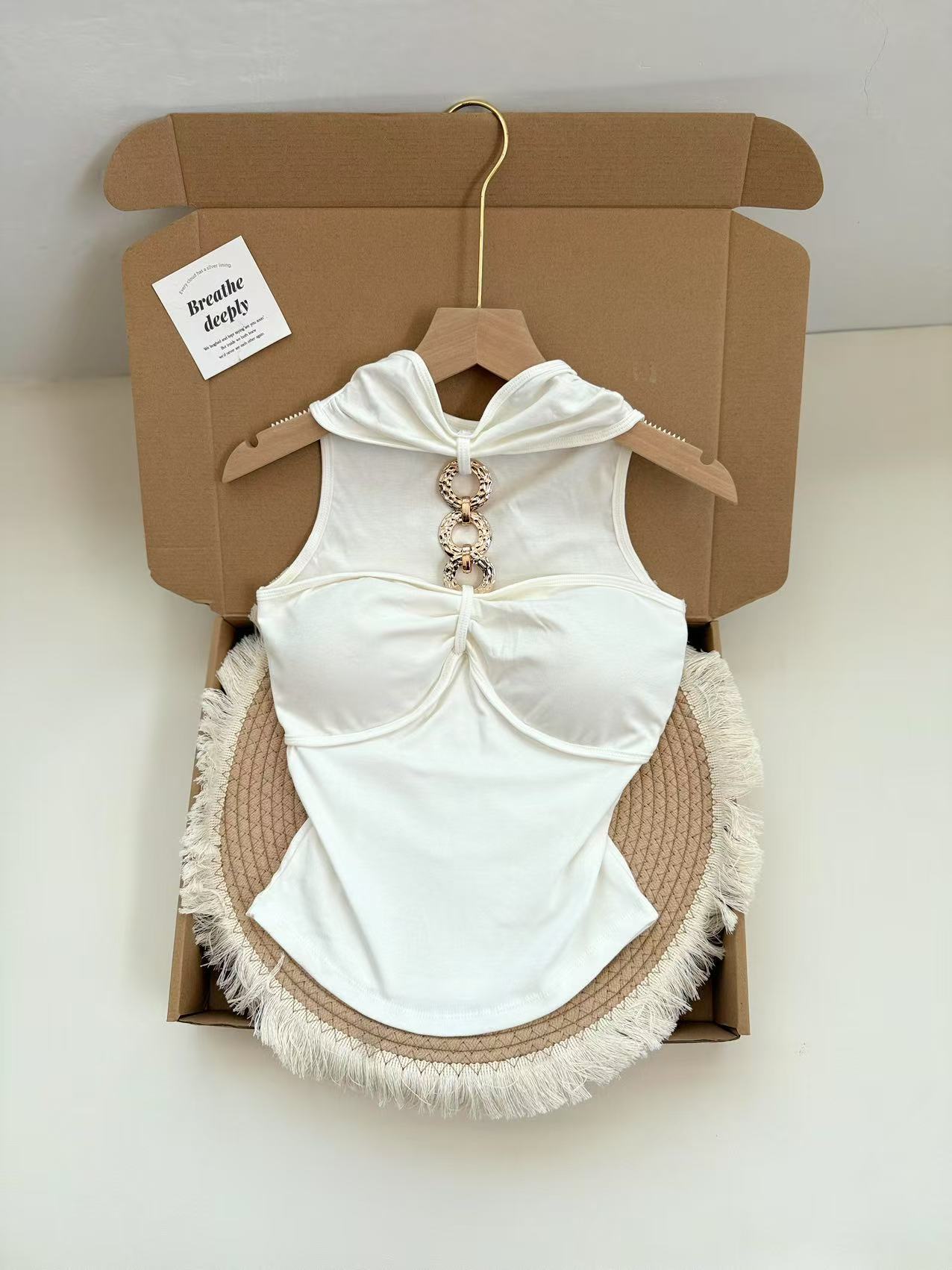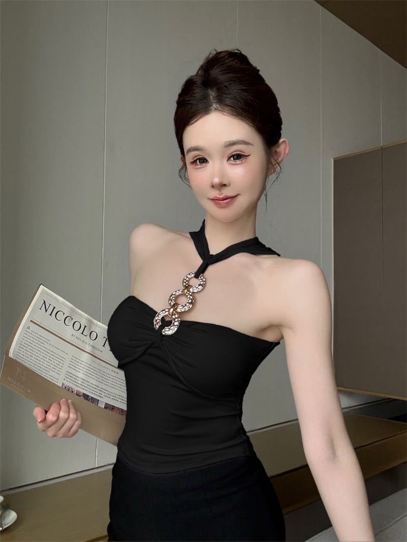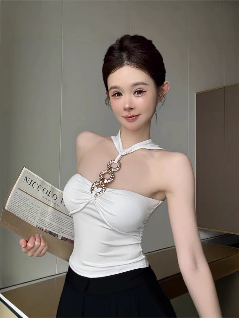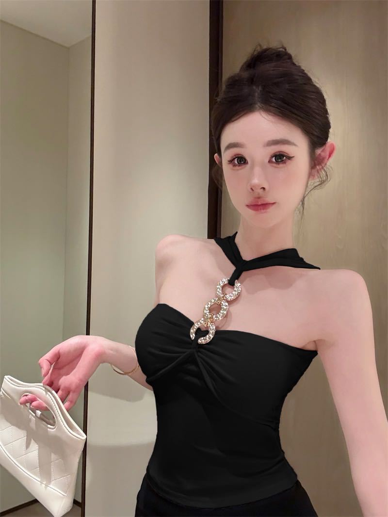 927 # Летний новый стильный жилет с лямкой на шее и цепочкой из чистого бриллианта для верхней одежды, нишевый сексуальный универсальный жилет с подушечками для груди, чтобы выглядеть стройным