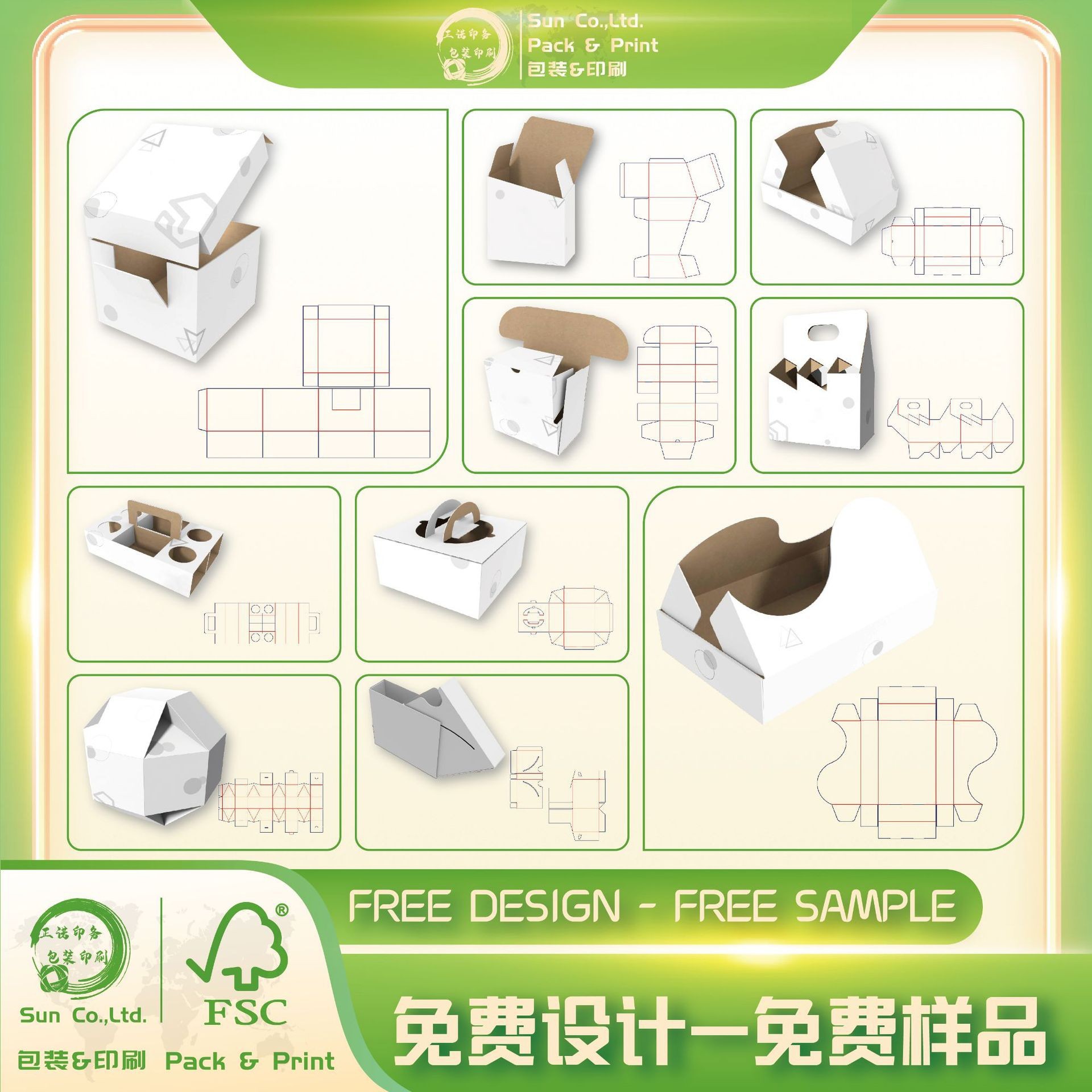 材料:白卡纸、灰底白板纸、黑卡纸、金卡、银卡、特种纸、绒布、PU皮、食品级白卡纸、瓦楞纸、纸板等