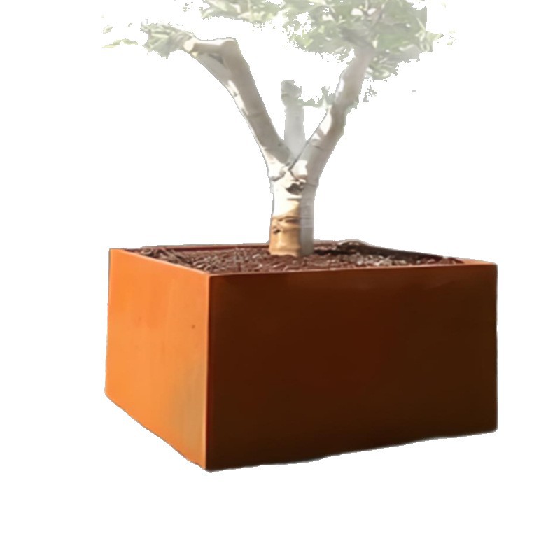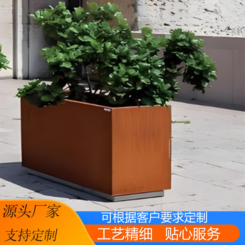 Производитель устойчивых к атмосферным воздействиям стальных цветочных ящиков для посадки бассейнов обрабатывает подвижные ржавые металлические цветочные горшки в живописной местности, комбинация устойчивых к атмосферным воздействиям стальных цветочных ящиков