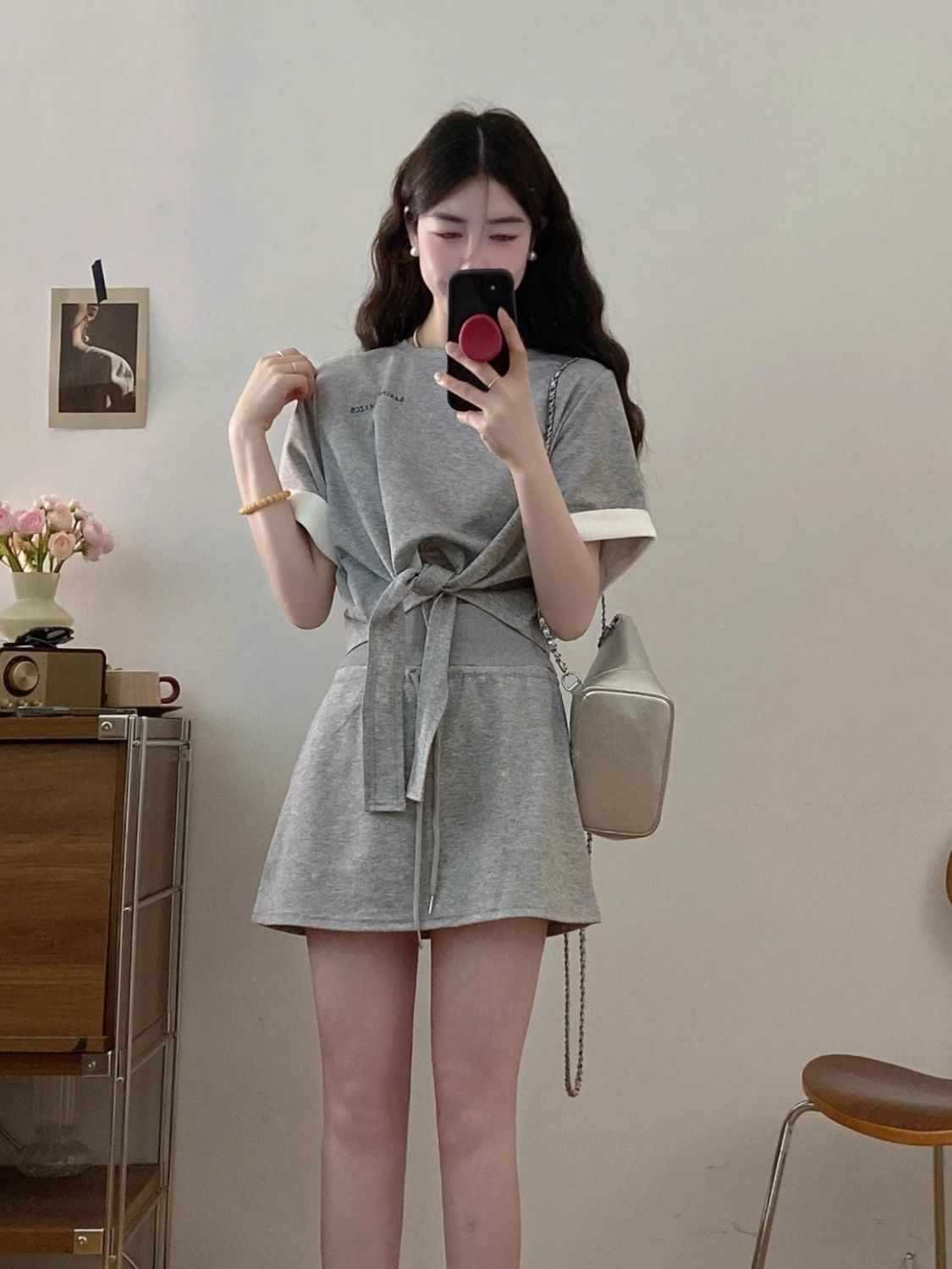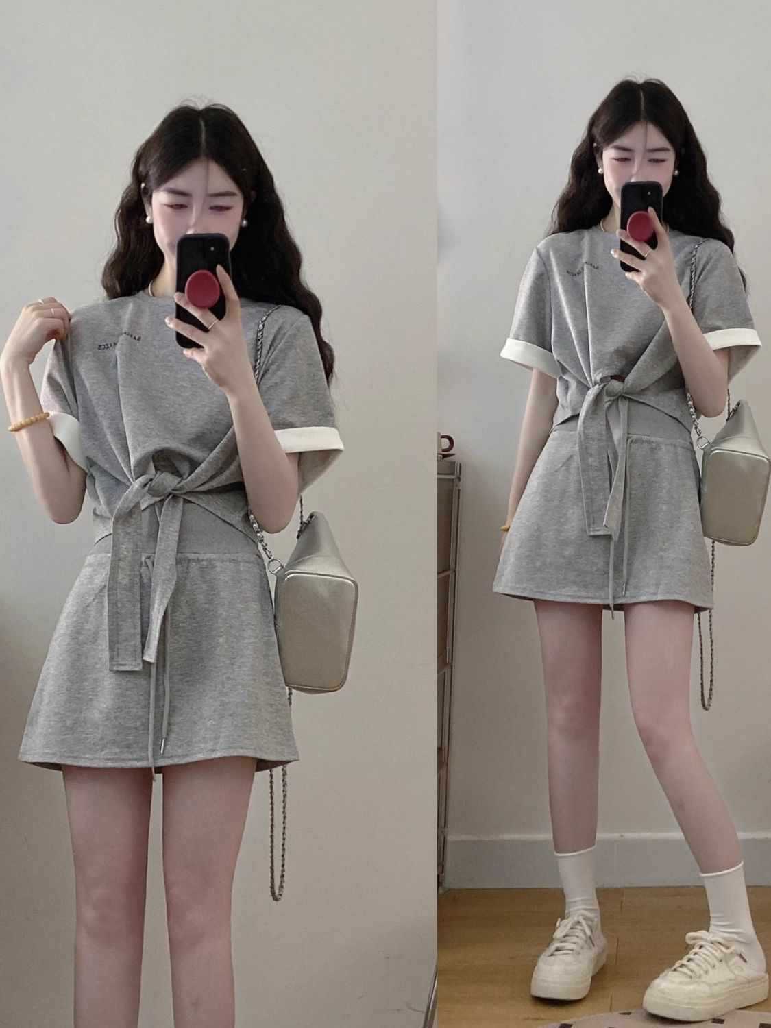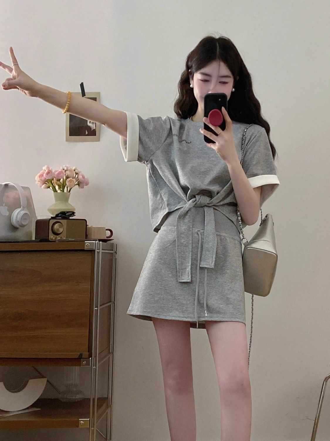 6535 Футболка с контрастной цветной строчкой и ремешком, толстовка, топ, женская летняя юбка на шнурке для полных девушек, повседневный спортивный костюм