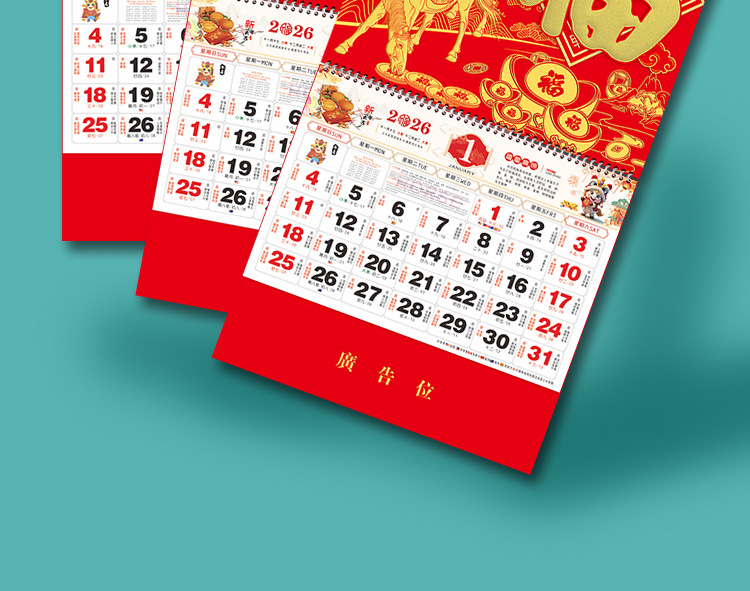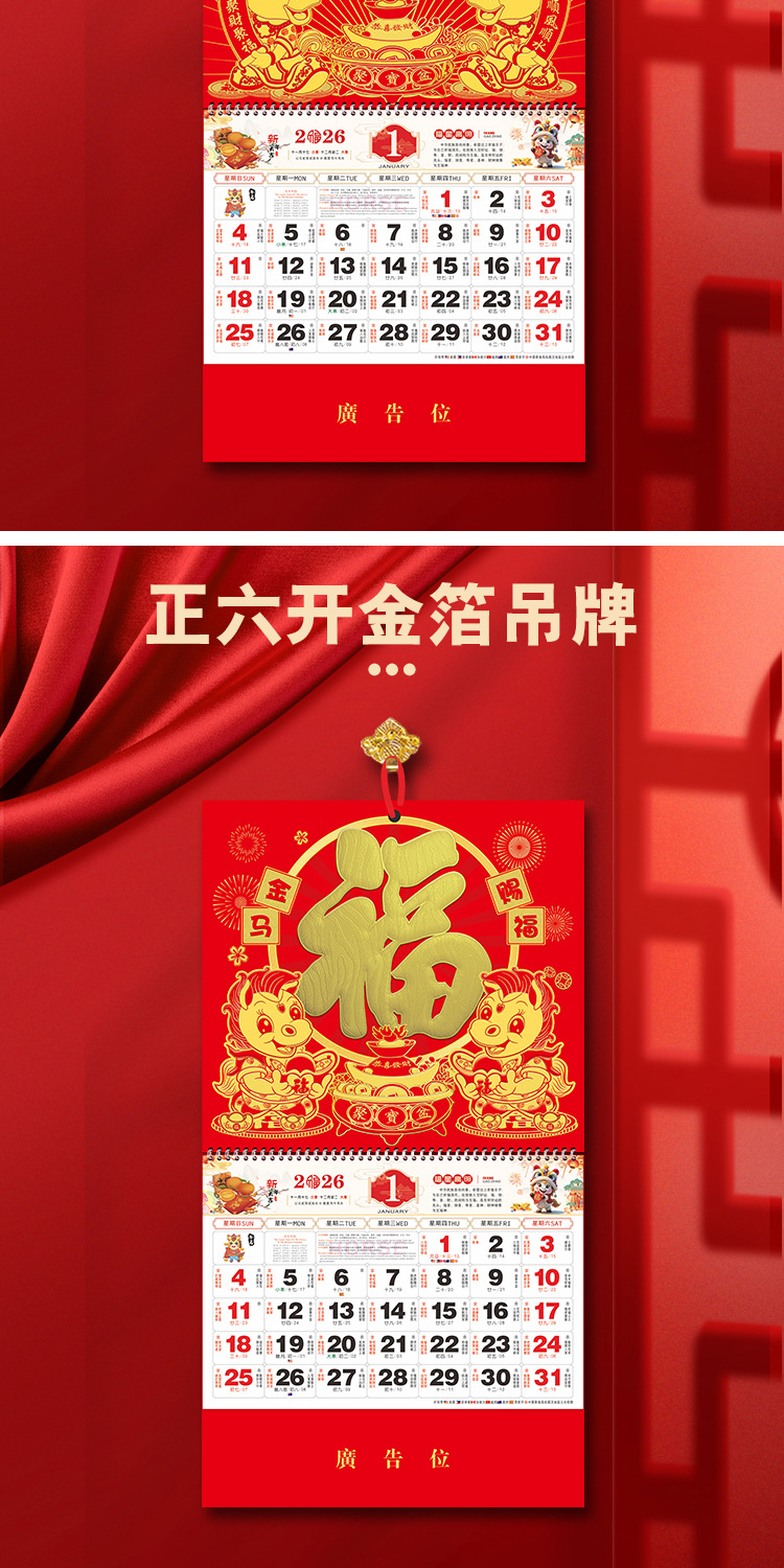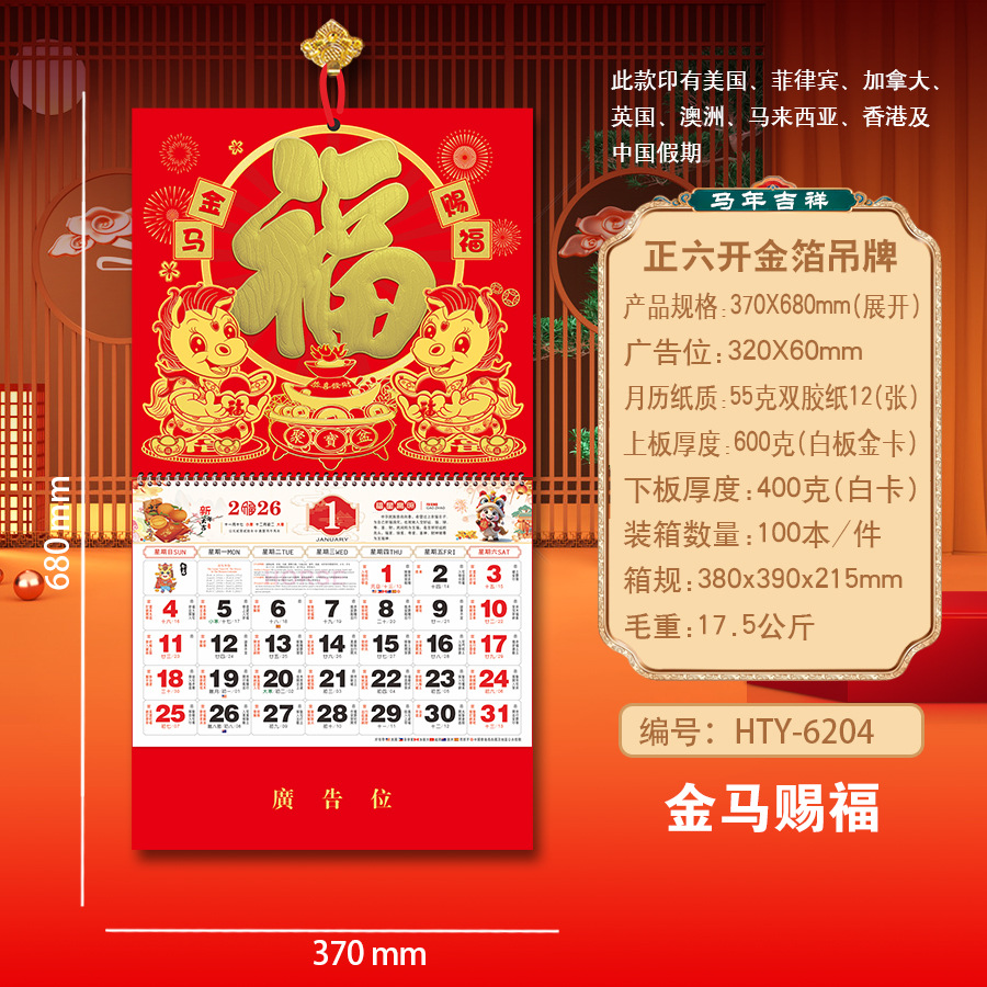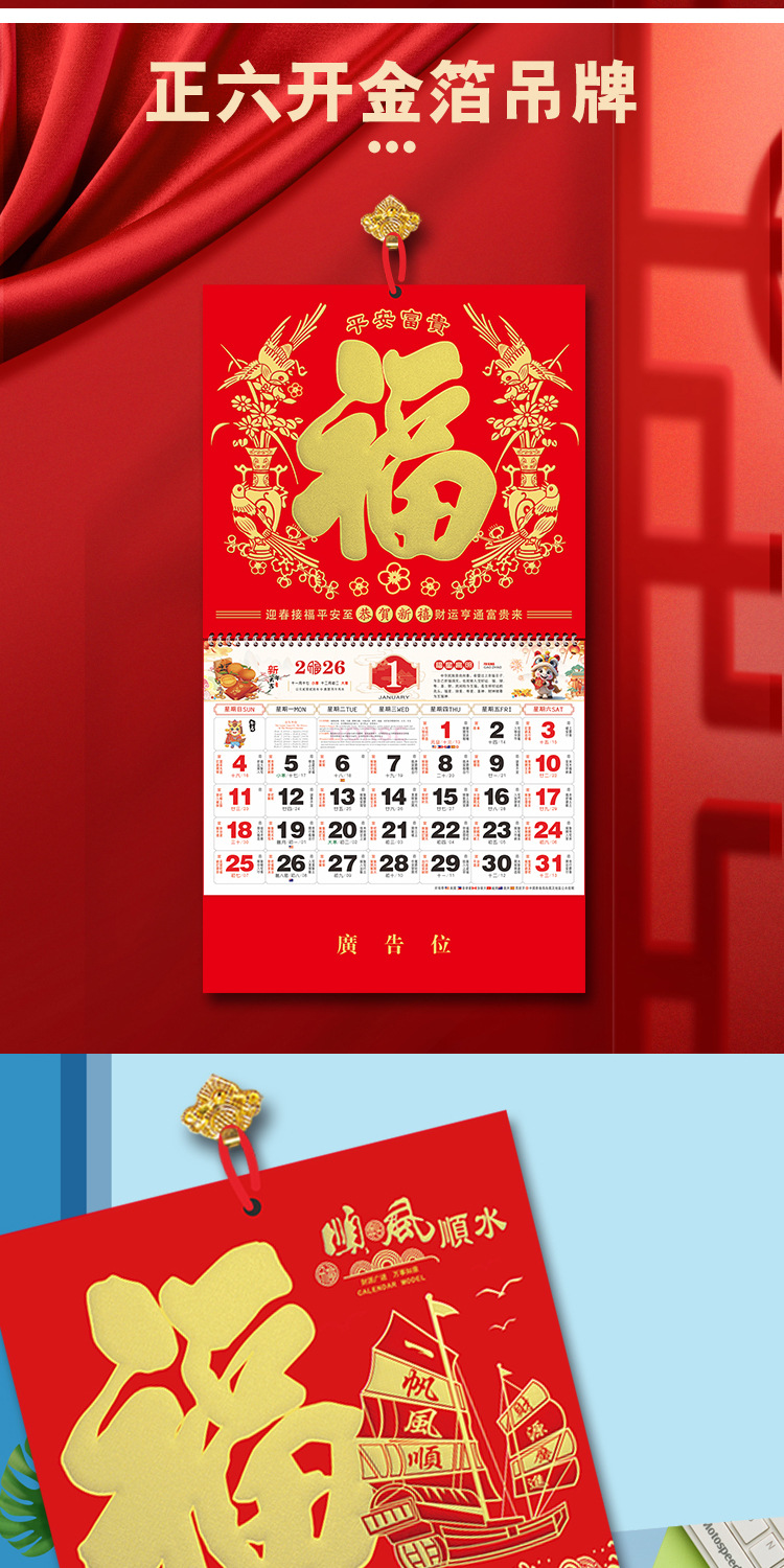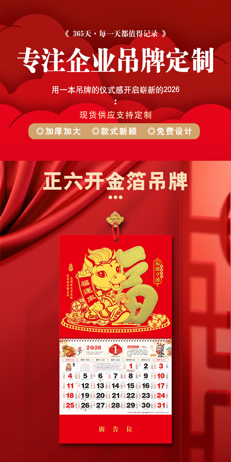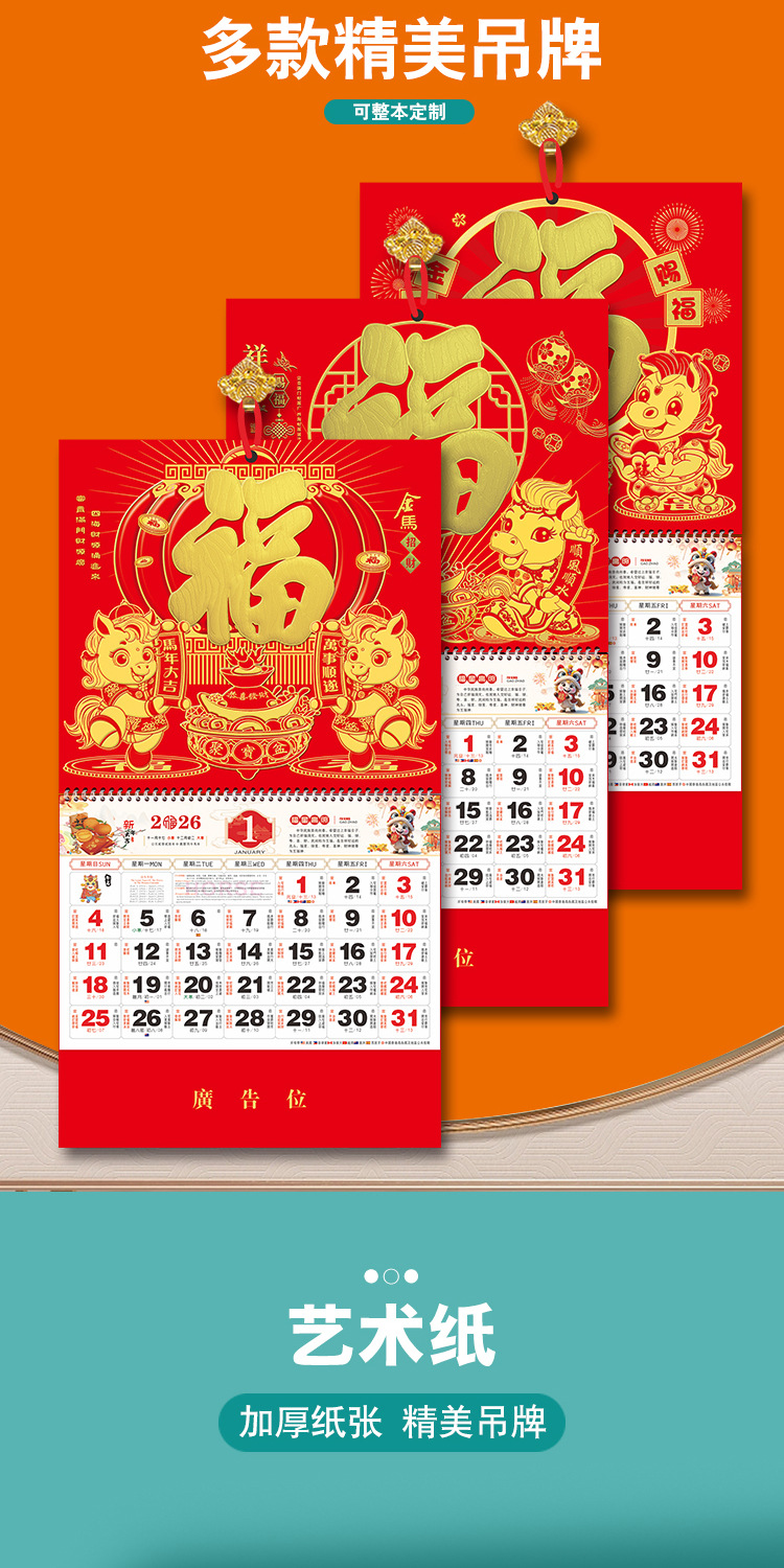 Настенный календарь из золотой фольги на 2027 год (Год Овцы) оптом в наличии, подвесные таблички с символами удачи, печать ежемесячных календарей, производство рекламных настенных календарей.