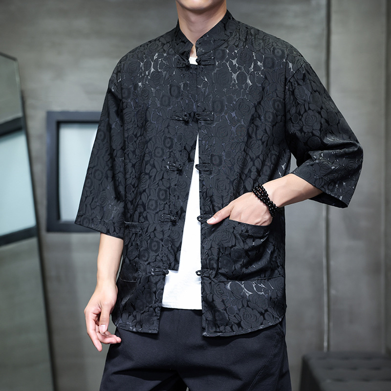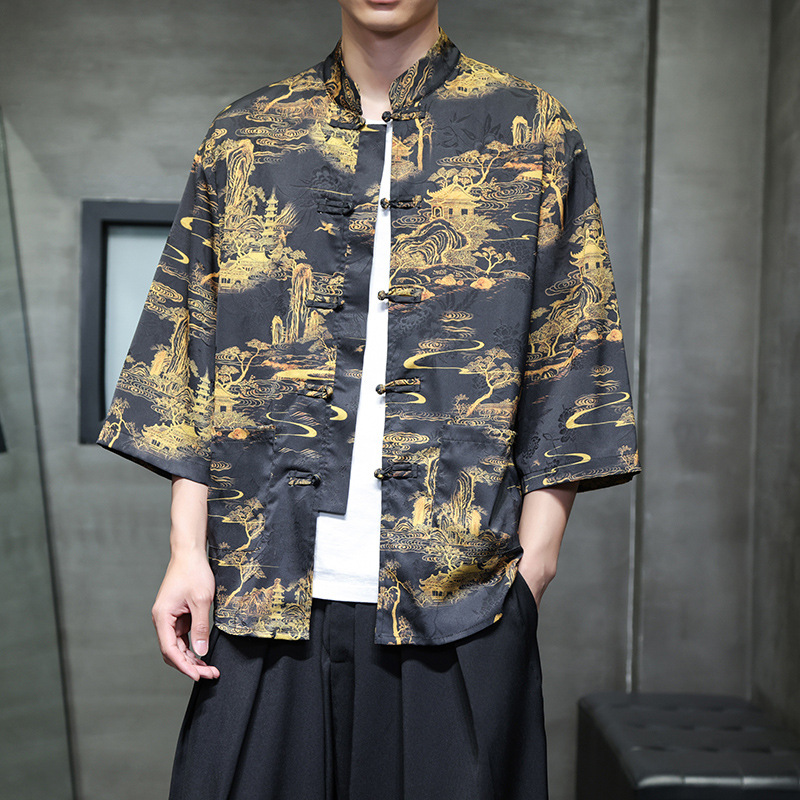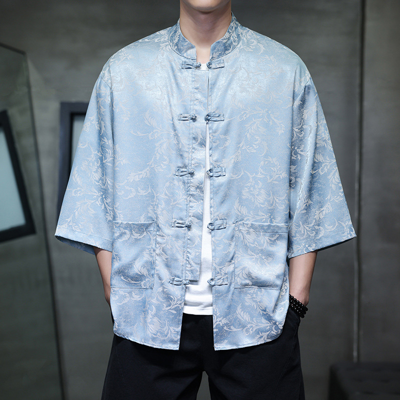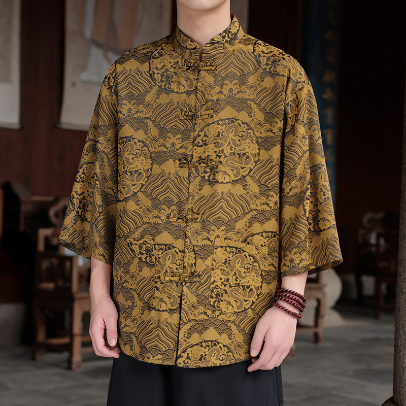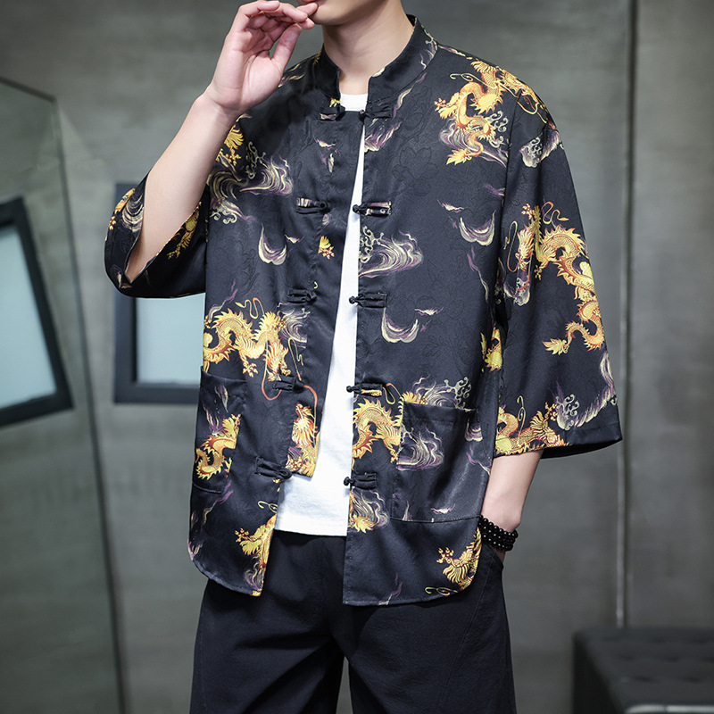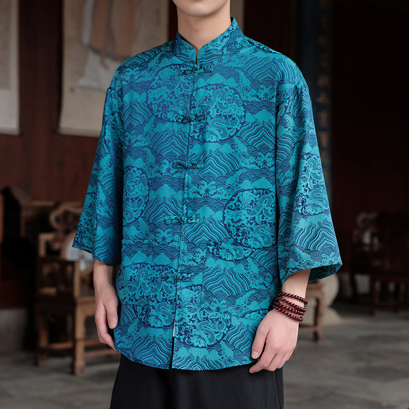 Мужская рубашка в китайском стиле из ледяного шелка с рукавом три четверти, костюм Тан с застежкой на пуговицы, Ханьфу, рубашка с коротким рукавом большого размера с принтом, этнический стиль.