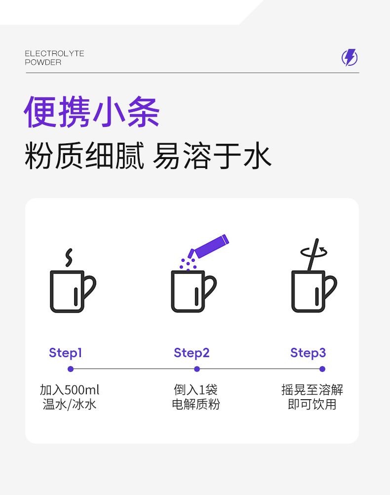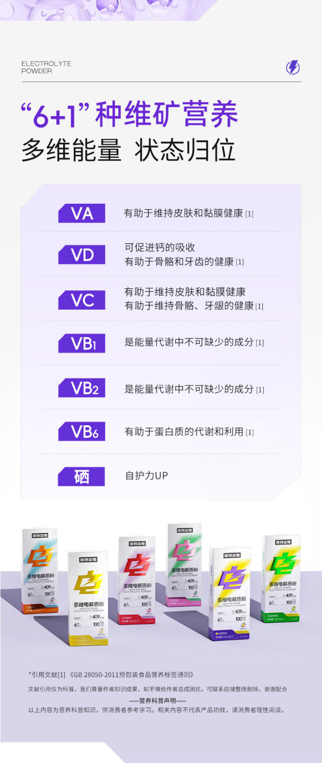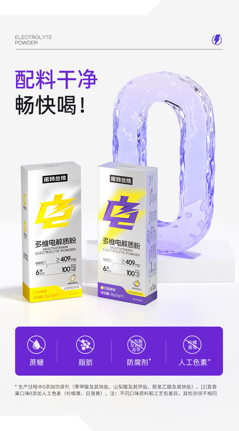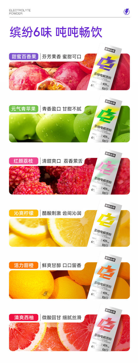 Многомерный электролитный порошок (аромат маракуйи); Многомерный электролитный порошок (ароматизатор «зеленое яблоко»); Многомерный электролитный порошок (свекольный вкус); Многомерный электролитный порошок (аромат личи); Мультивитаминный электролитный порошок (лимонный вкус)