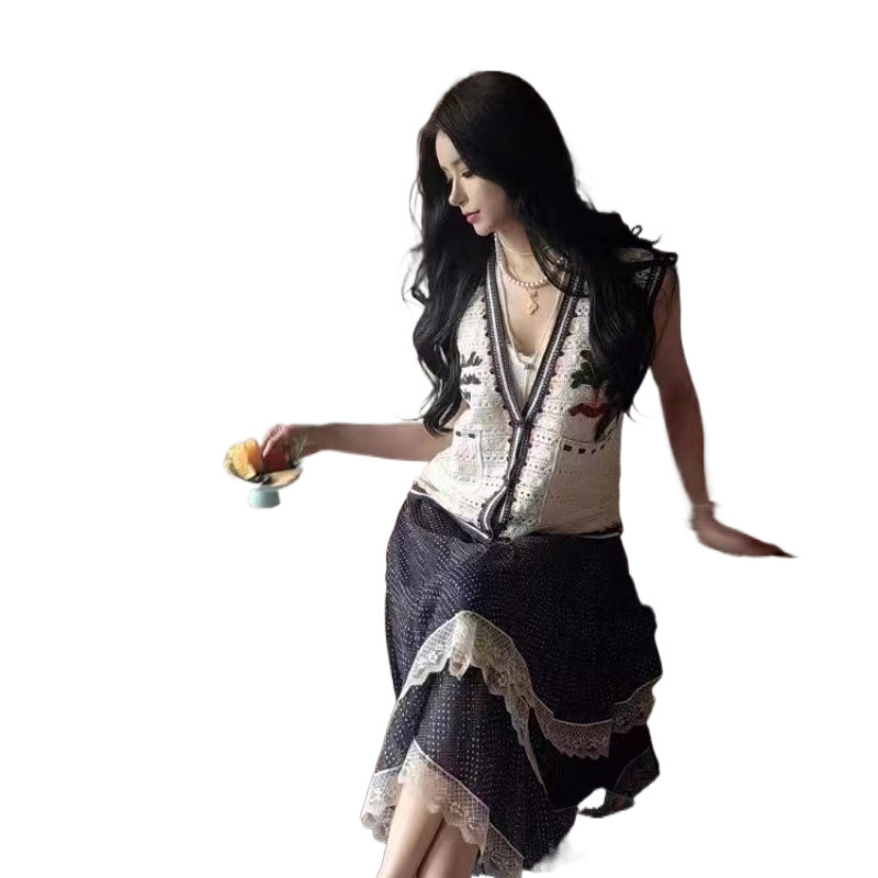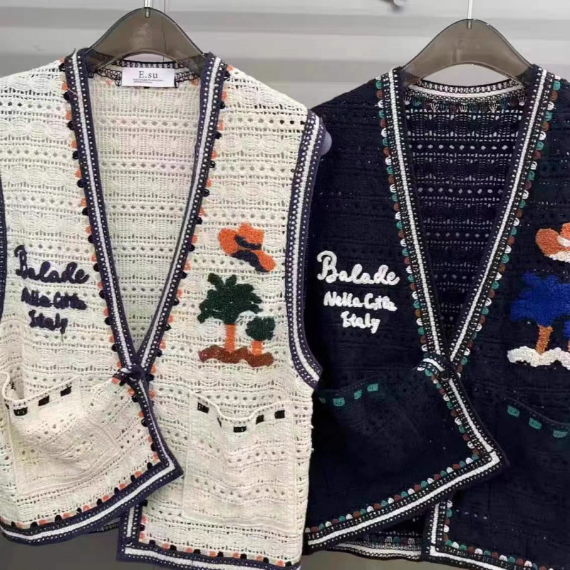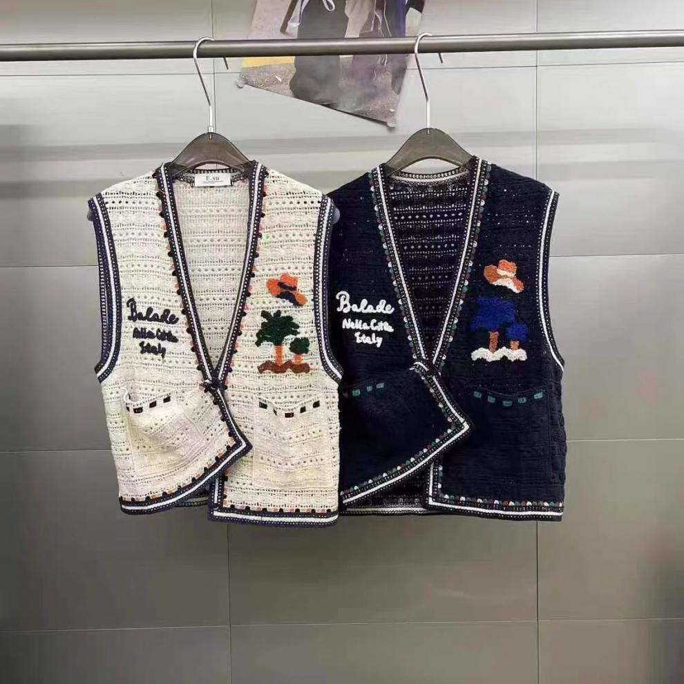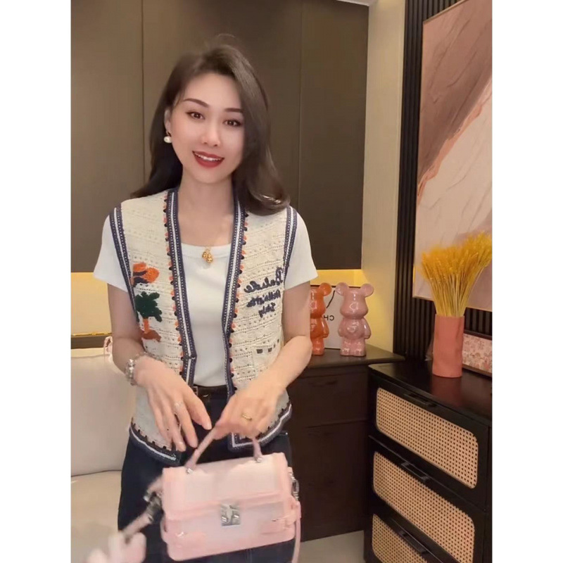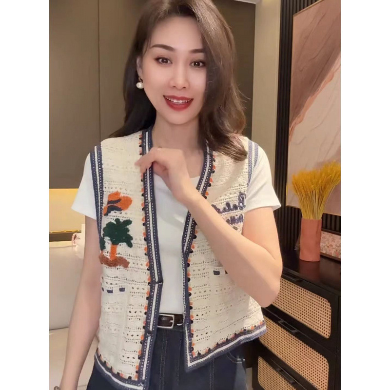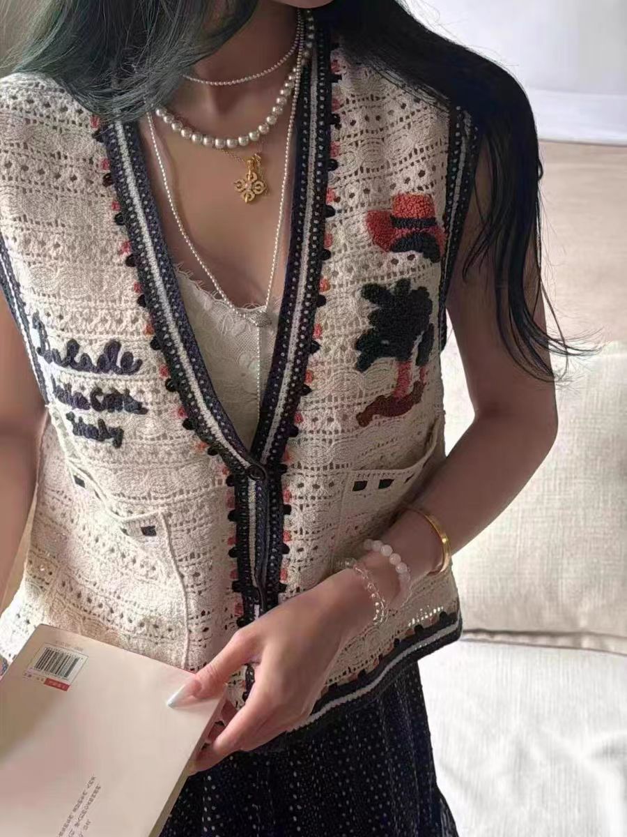 Женский жилет с вышивкой в виде мультяшных букв, контрастной расцветкой и вырезами, красивый и стильный, летняя новинка 2025 года.