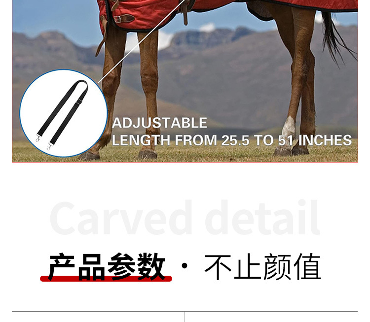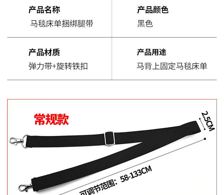 功能:弹性腿带用于固定您的马毯,使您不会担心尴尬的打结。不再手痛,也节省你的时间。我们的腿带兼容几乎任何马毯,并可以调整长度,以适应腿带。
