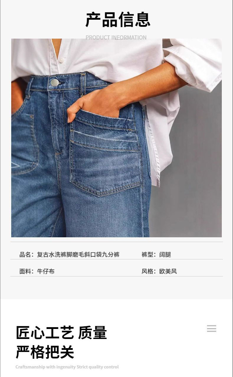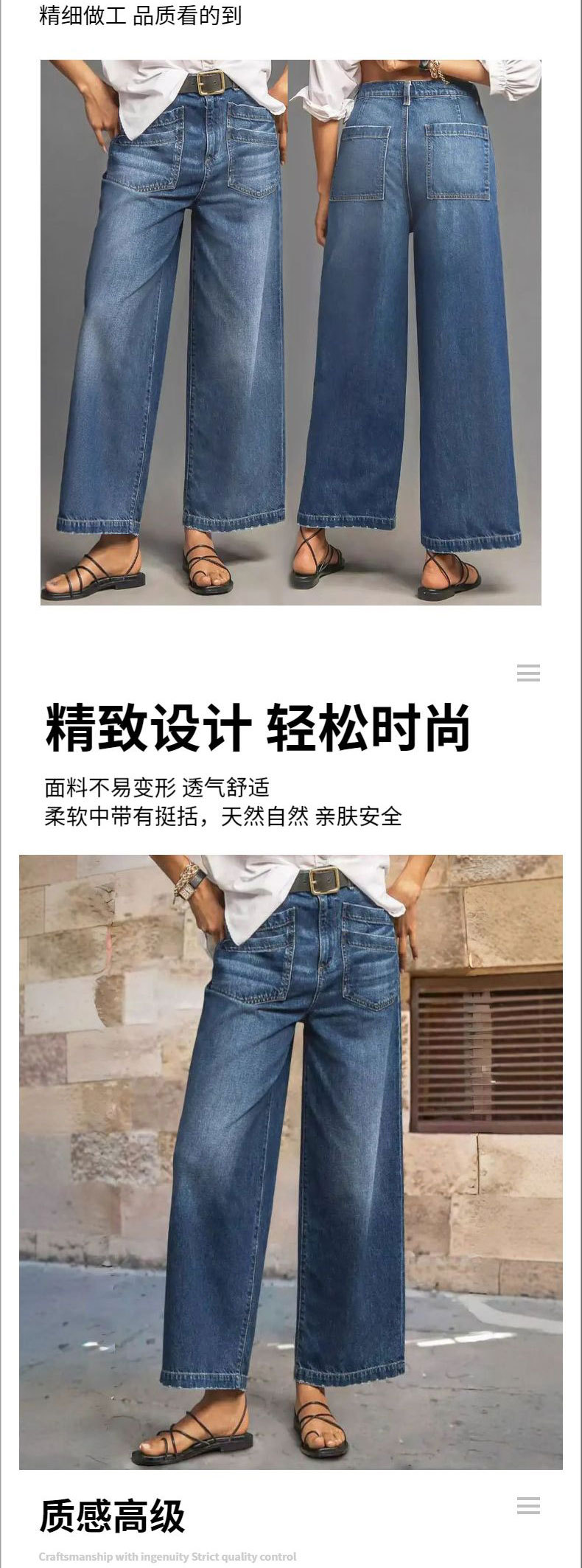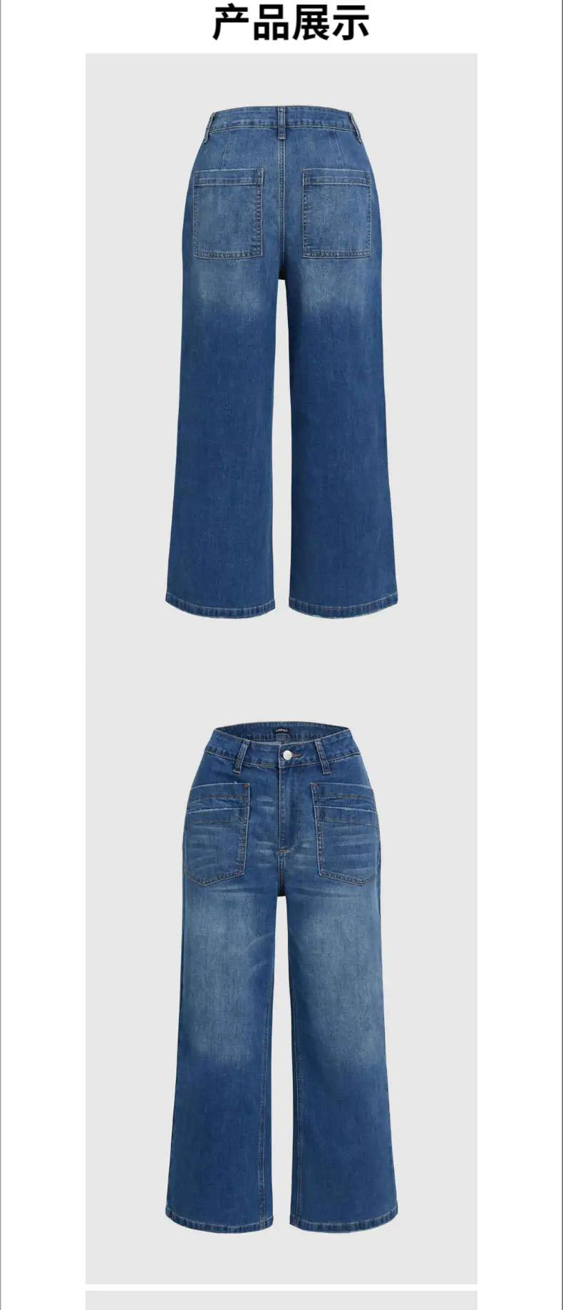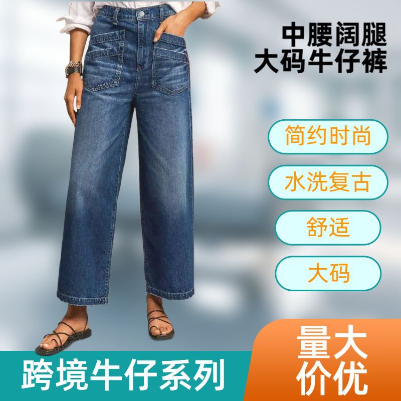 Европейские и американские трансграничные эластичные широкие джинсы со средней талией большого размера, потертые брюки в стиле ретро с наклонными карманами, брюки с девятью точками