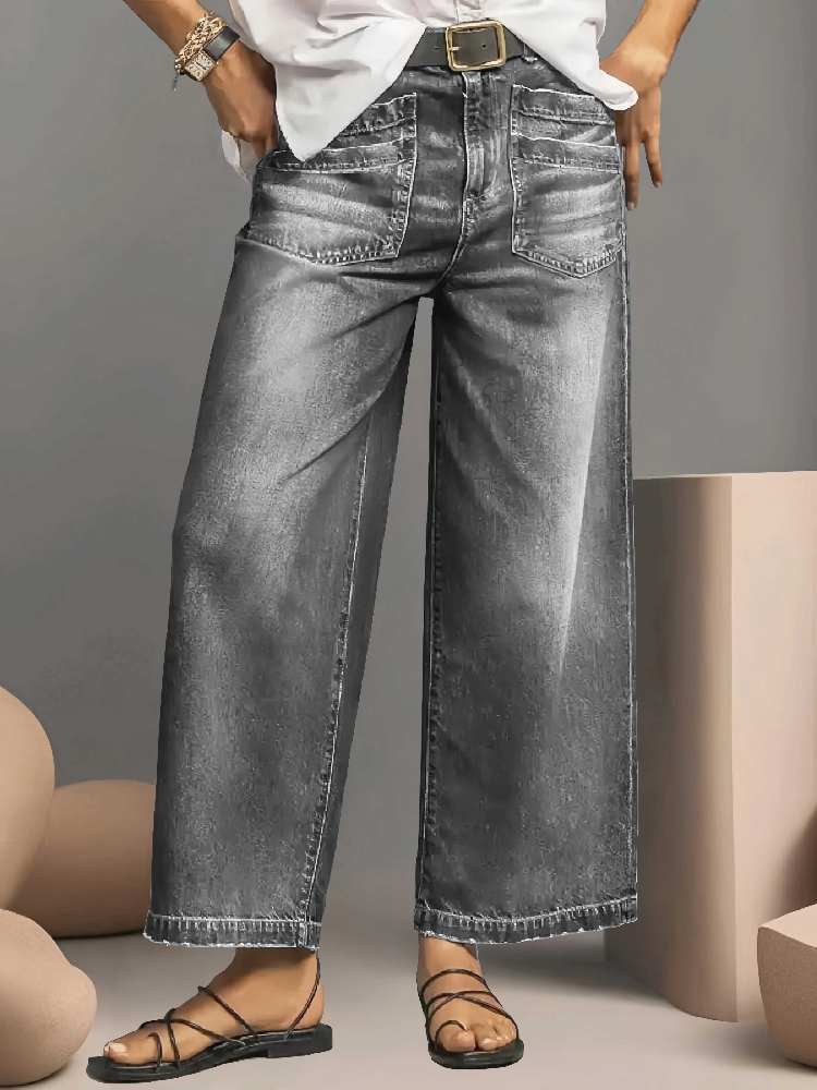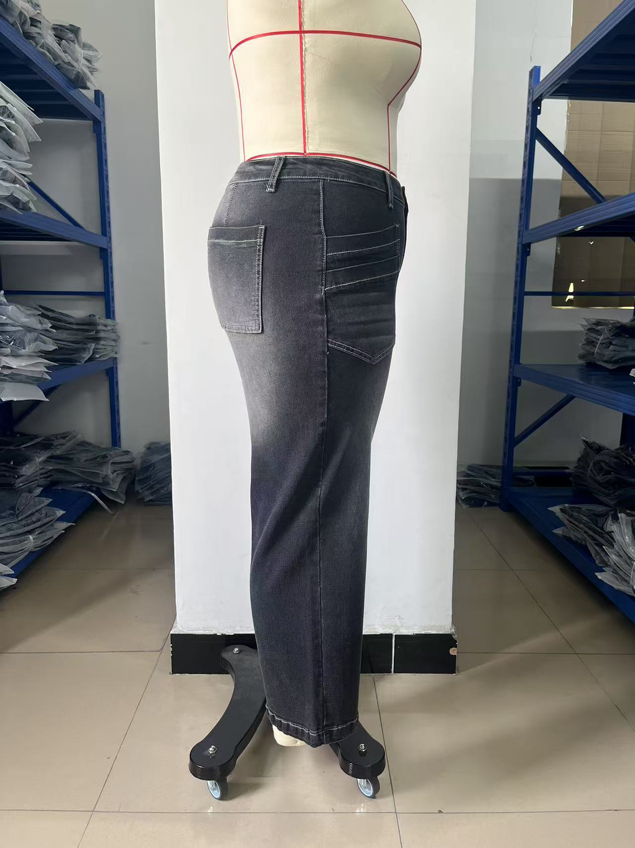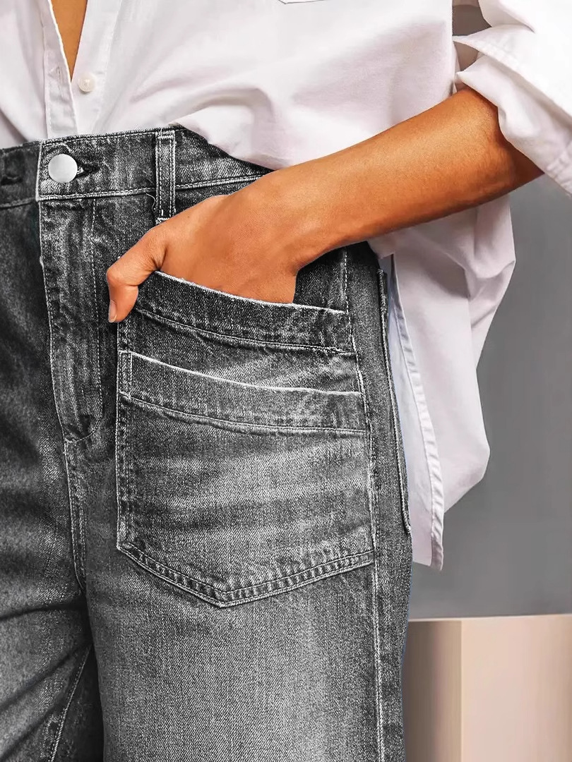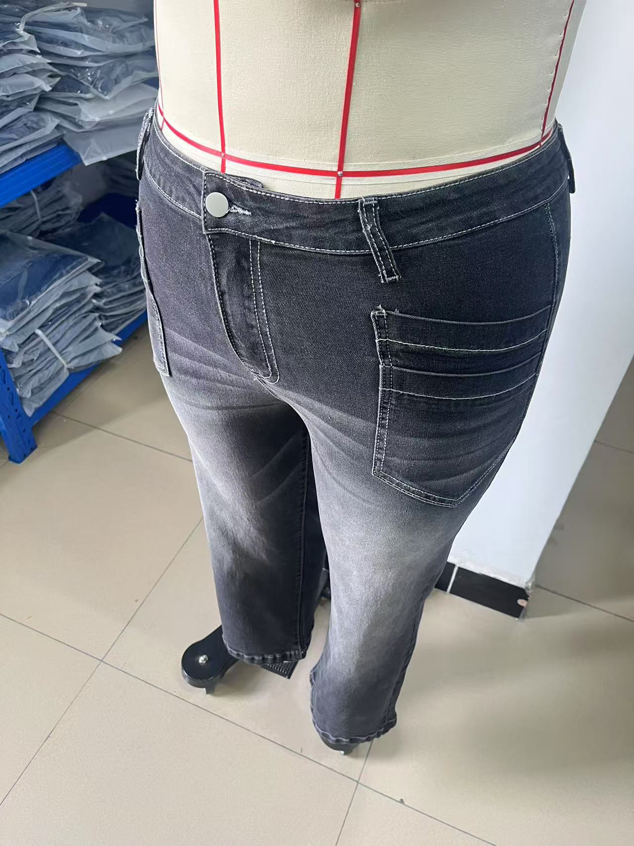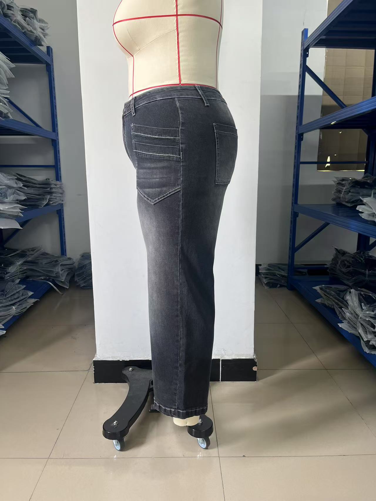 Трансграничные европейские и американские эластичные широкие джинсы средней посадки больших размеров с потертостями по краям, матовой тканью, диагональными карманами и укороченной длиной.