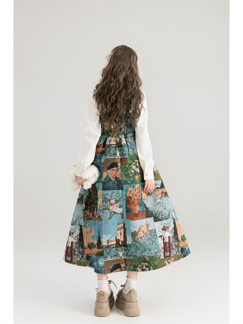 Длинная юбка с цветной текстурой масляной живописи + рубашка с длинными рукавами и остроконечным воротником; Юбка с цветной текстурой масляной живописи + рубашка с длинными рукавами и остроконечным воротником; Длинная юбка с текстурой масляной живописи; Юбка с текстурой масляного цвета; Белоснежная рубашка с длинными рукавами и остроконечным воротником