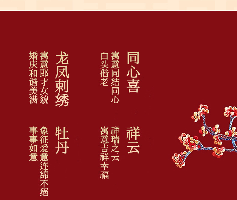 Дракон и Феникс олицетворяют благоприятность; Счастливая пара; Дракон парит, а Феникс прыгает; Идеальное совпадение; Божественный матч; Завяжите узел