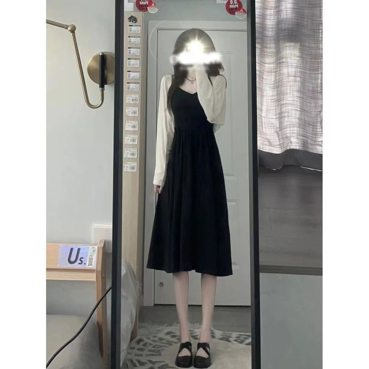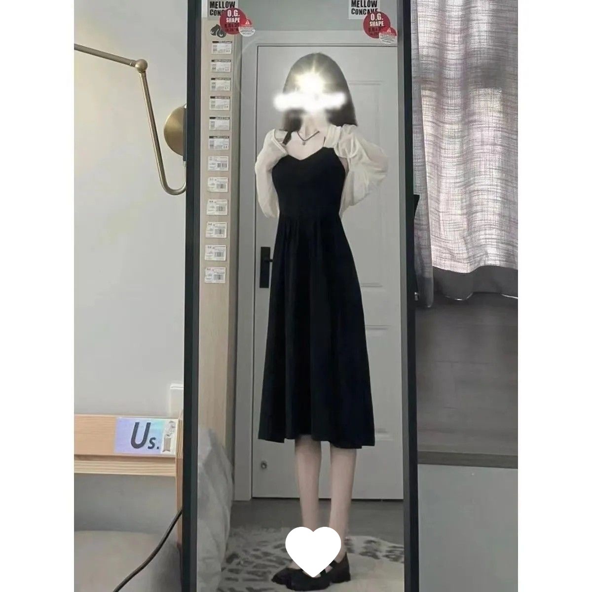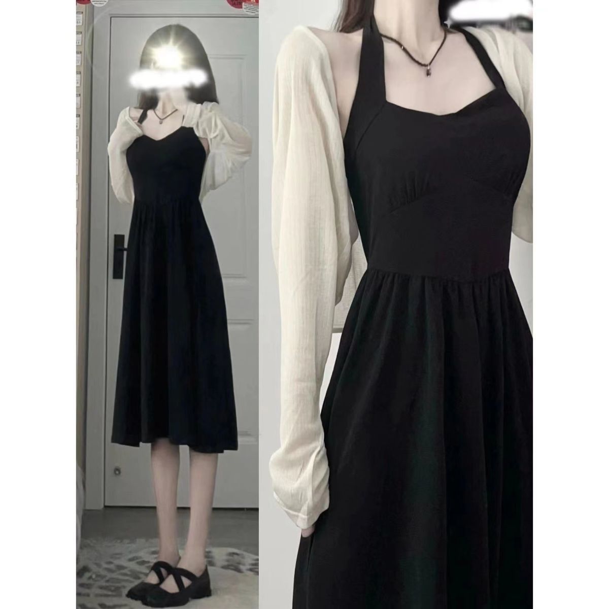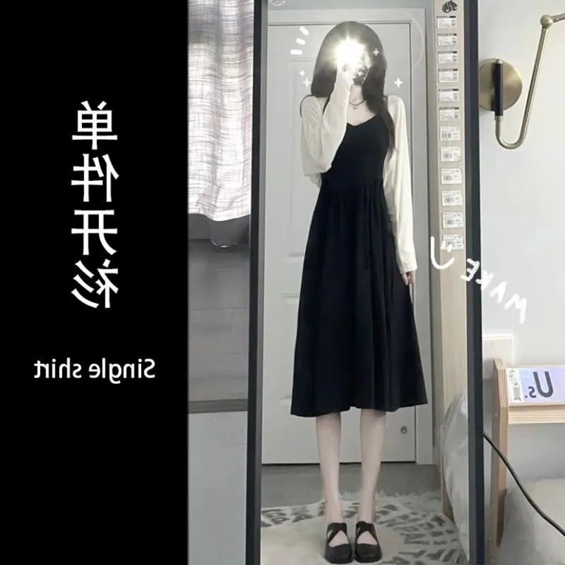 Белый кардиган [цельный предмет]; Черная юбка с ремешками [цельная вещь]; Белый кардиган + юбка на бретелях【