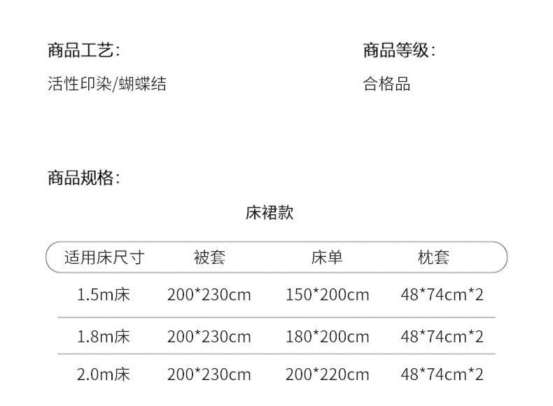【温馨提示】购买前务必核对各个规格对应的被套和床单尺寸,以免收到尺寸不对。收到产品请先核对尺寸和款式,并检查有无瑕疵。确认之后再洗涤,洗涤之后无法退换。谢谢支持配合!