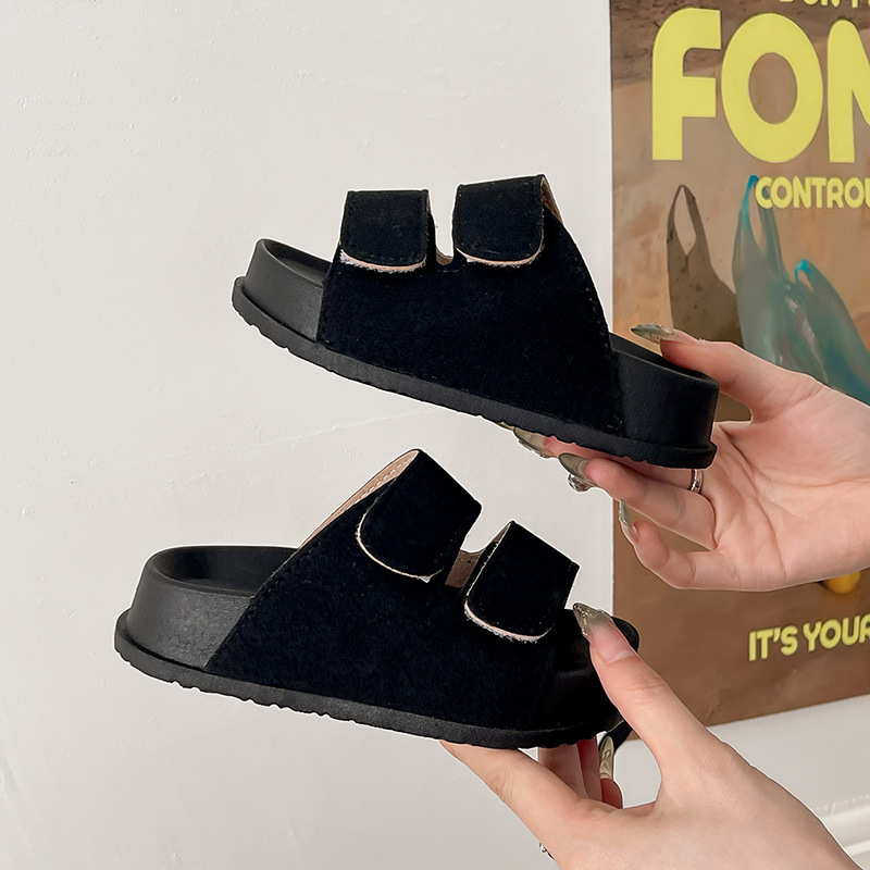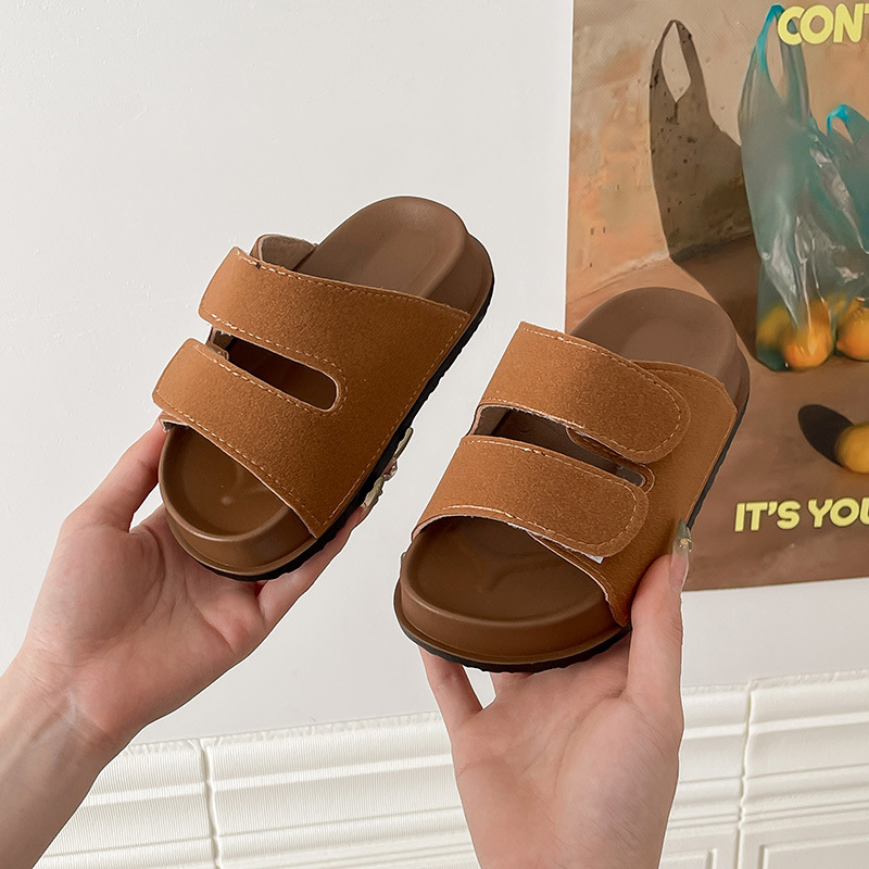 Модные детские тапочки на толстой подошве для мальчиков и девочек, модные уличные туфли на липучке с открытым носком в стиле Birkenstock для детей старшего возраста и детей, полусандалии.