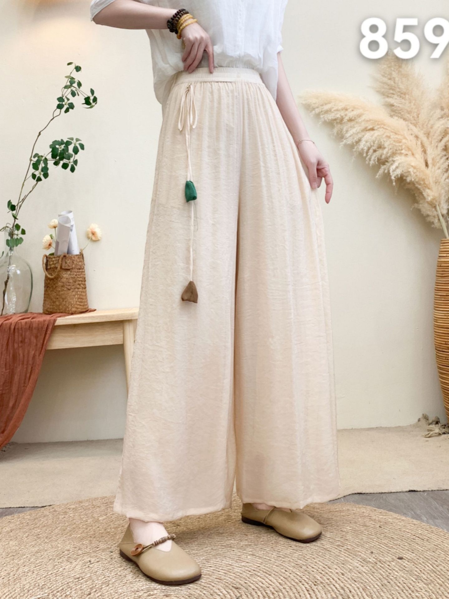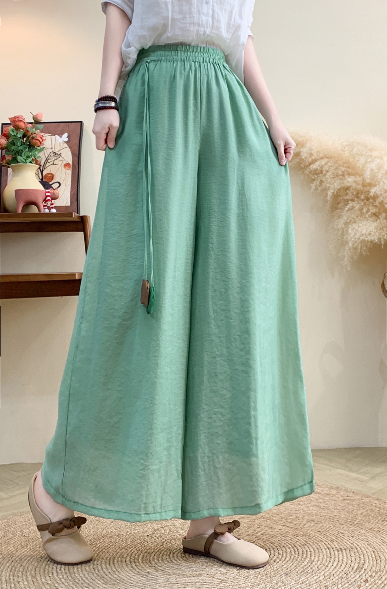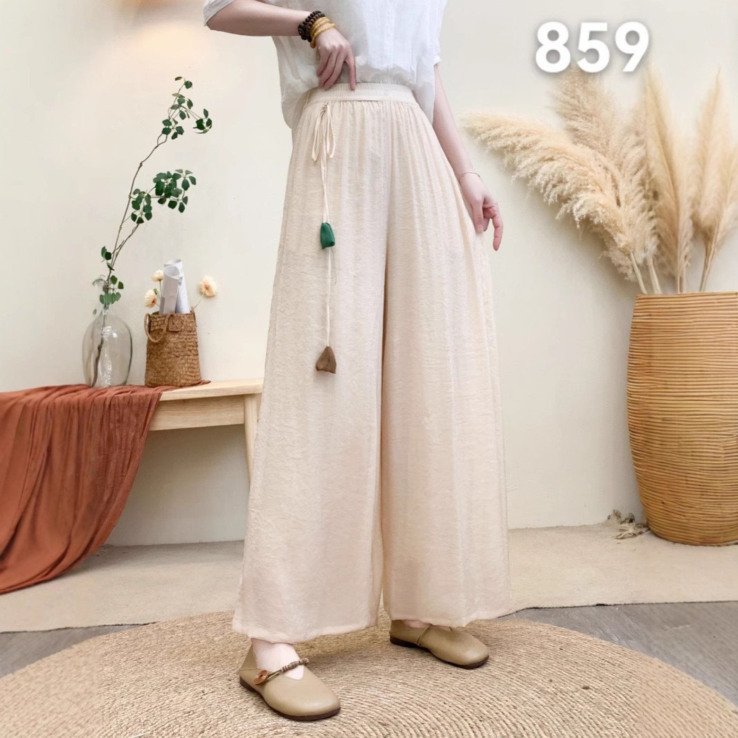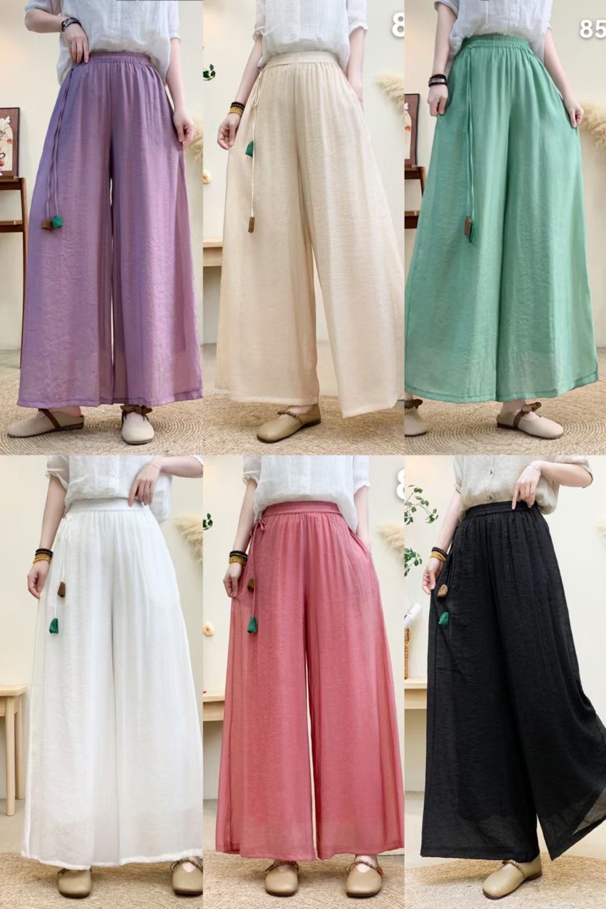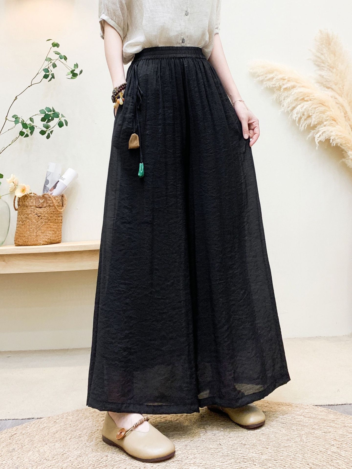 Новые летние широкие брюки из волокна шелка с эластичной резинкой на талии и шнурком, свободные художественные однотонные повседневные брюки с подвеской в стиле ретро для женщин