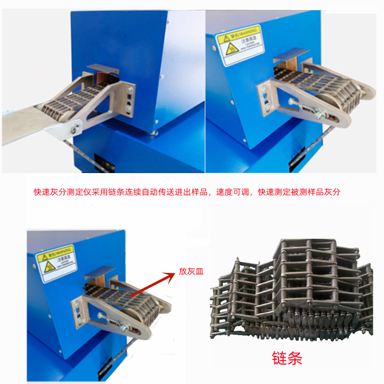快速灰分测定仪,倾斜式马蹄形管式炉膛,采用链式输送带将样品匀速送入高温炉灼烧样品,使有机物质梯度温度燃烧,残留无机物即为灰分。符合GB/T212的要求,避免硫元素固定。适用于电力、冶金、煤炭、化工