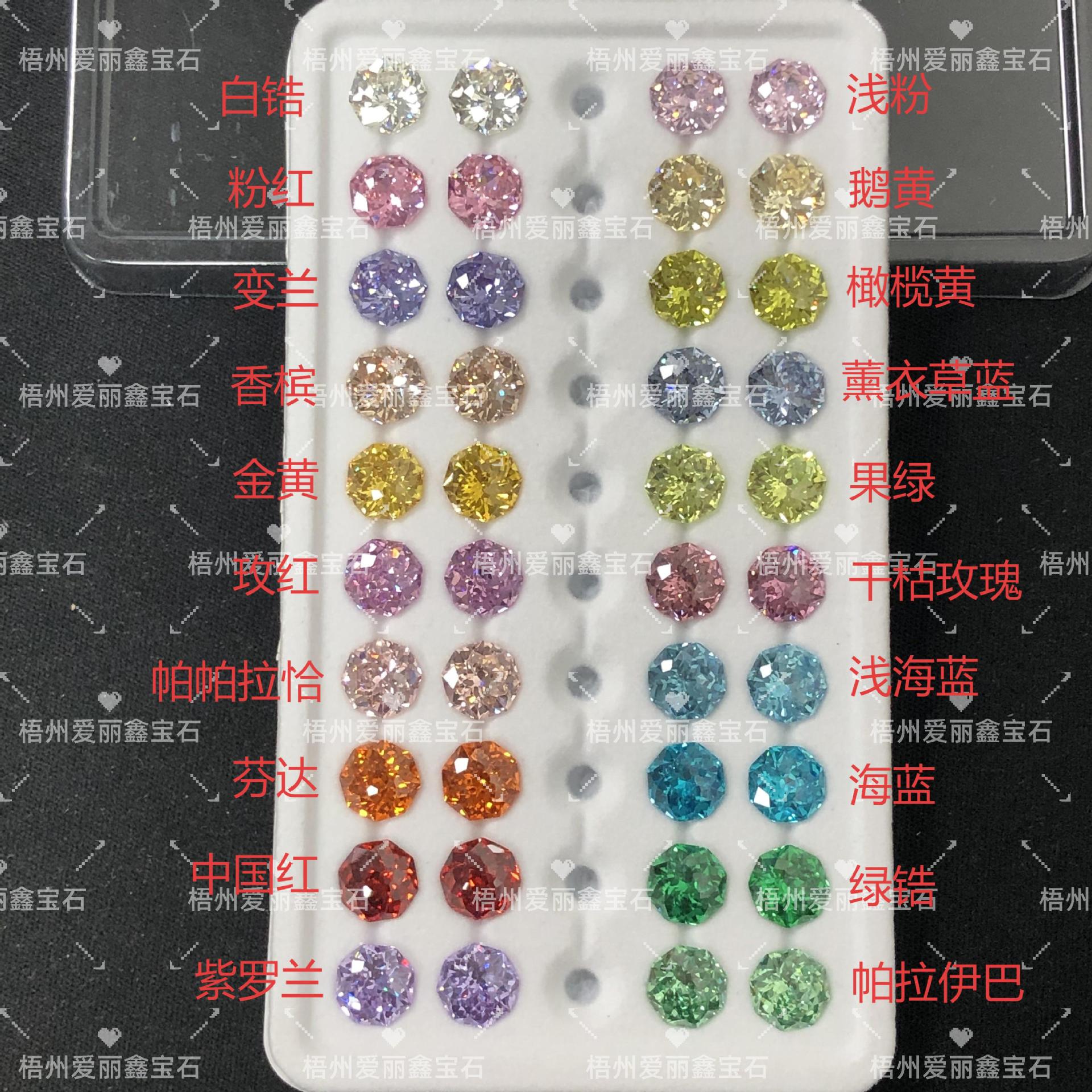 белый цирконий; розовый; Станьте синим; шампанское; золотой; Китайский красный; оливково-желтый; светло-розовый; розово-красный; фиолетовый; Гусь желтый; Фанта; сухая роза; Падпарадша; фруктовый зеленый; лавандовый синий; светло-морской синий; морское синее; зеленый цирконий; Параиба