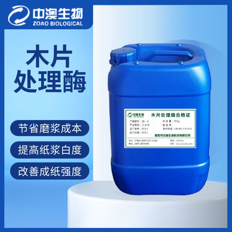 ZB-M木片处理酶是一种预处理原料木片的复合酶制剂,能够将木片纤维活化和松弛,加快药液渗透,增加化学品反应效率,有助于纤维分丝帚化和细纤维化,从而降低磨浆能耗。