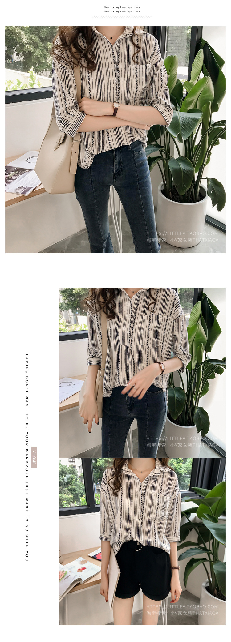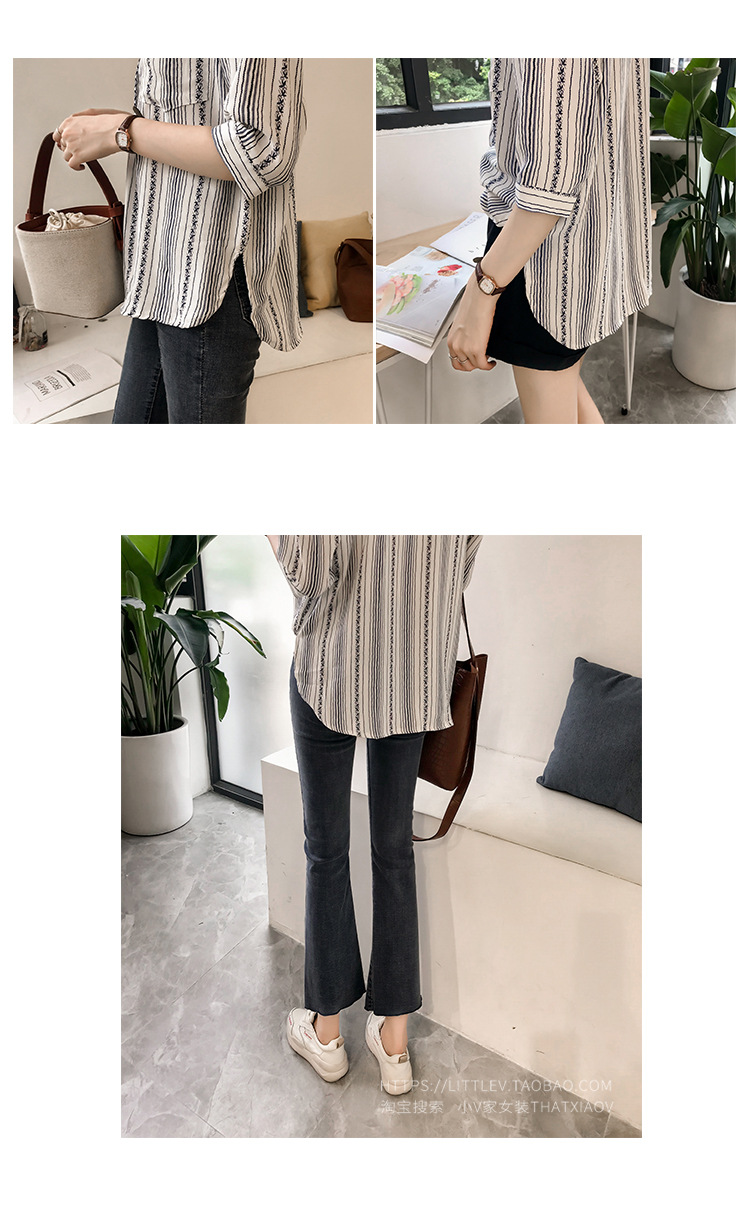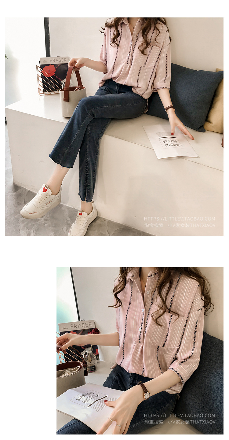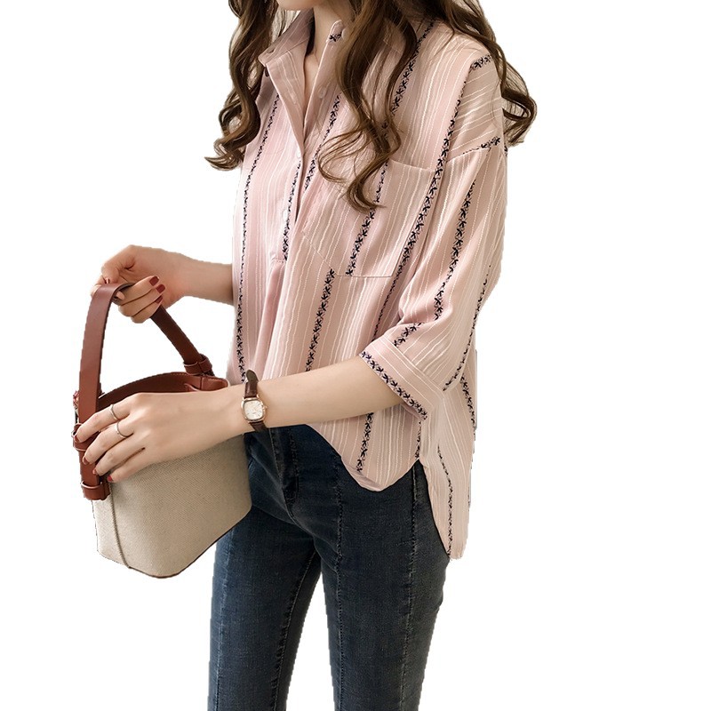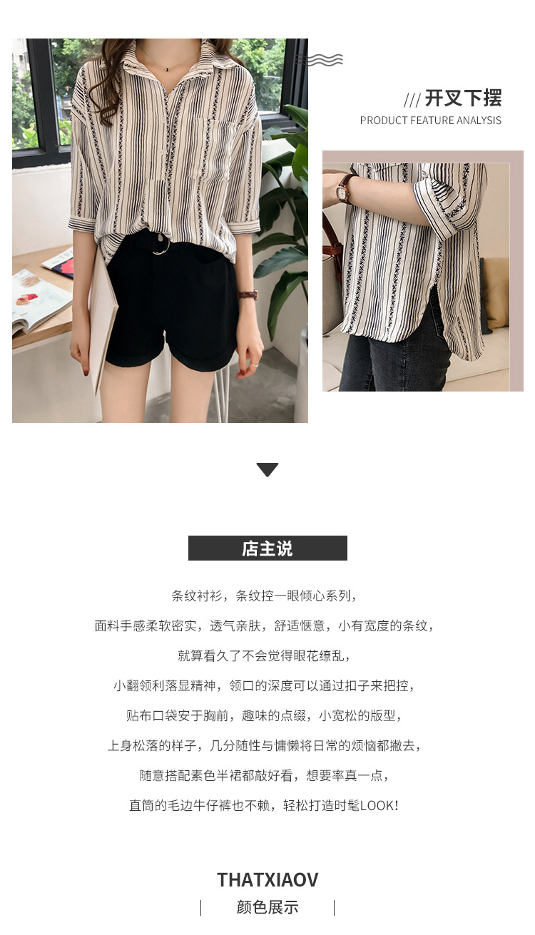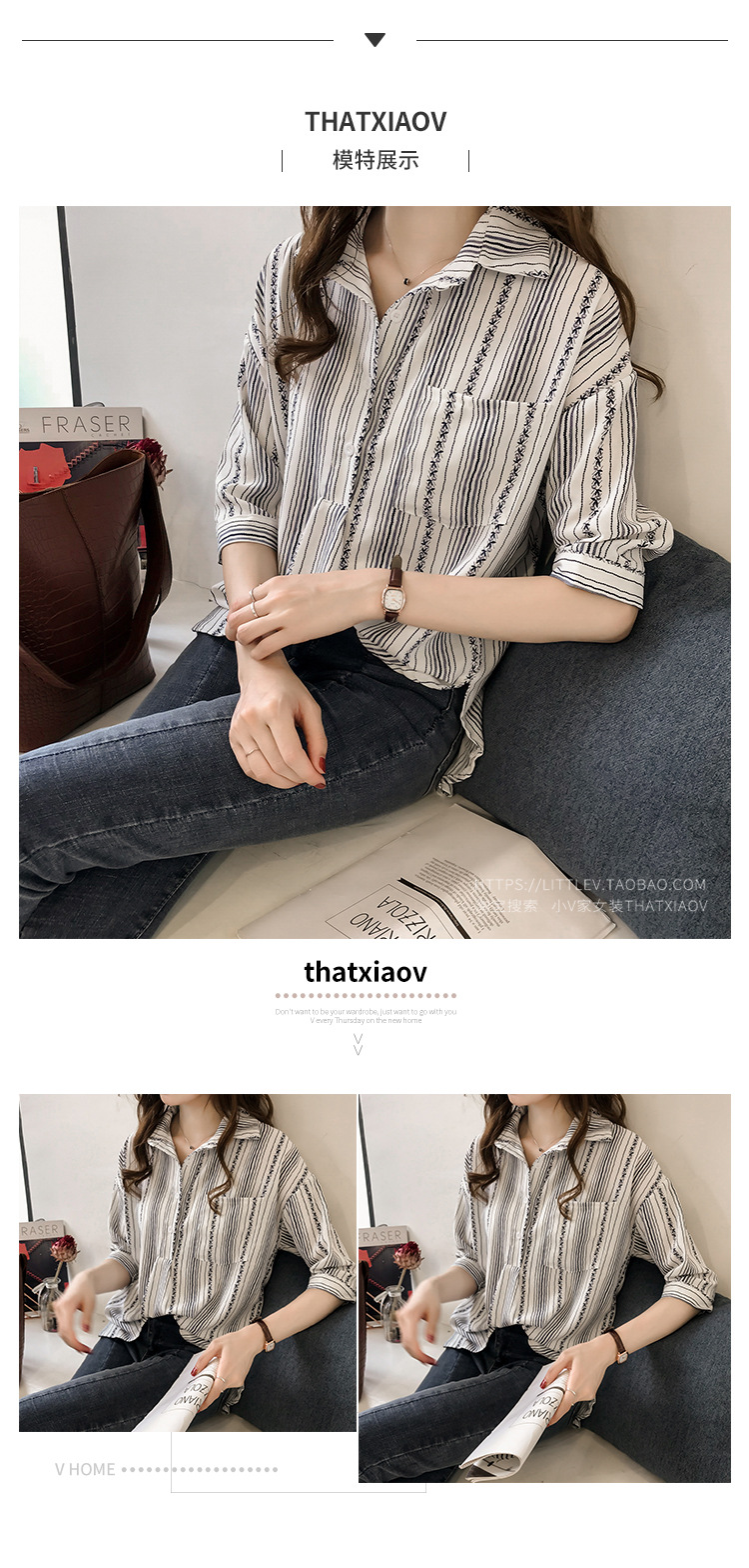 Ранняя осень, женская новая свободная рубашка в гонконгском стиле большого размера, полосатая рубашка, женская рубашка с рукавом три четверти, нижняя рубашка