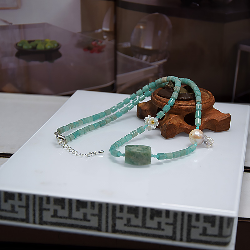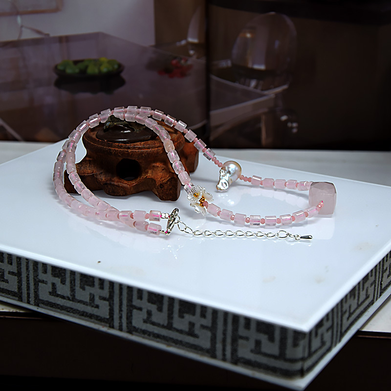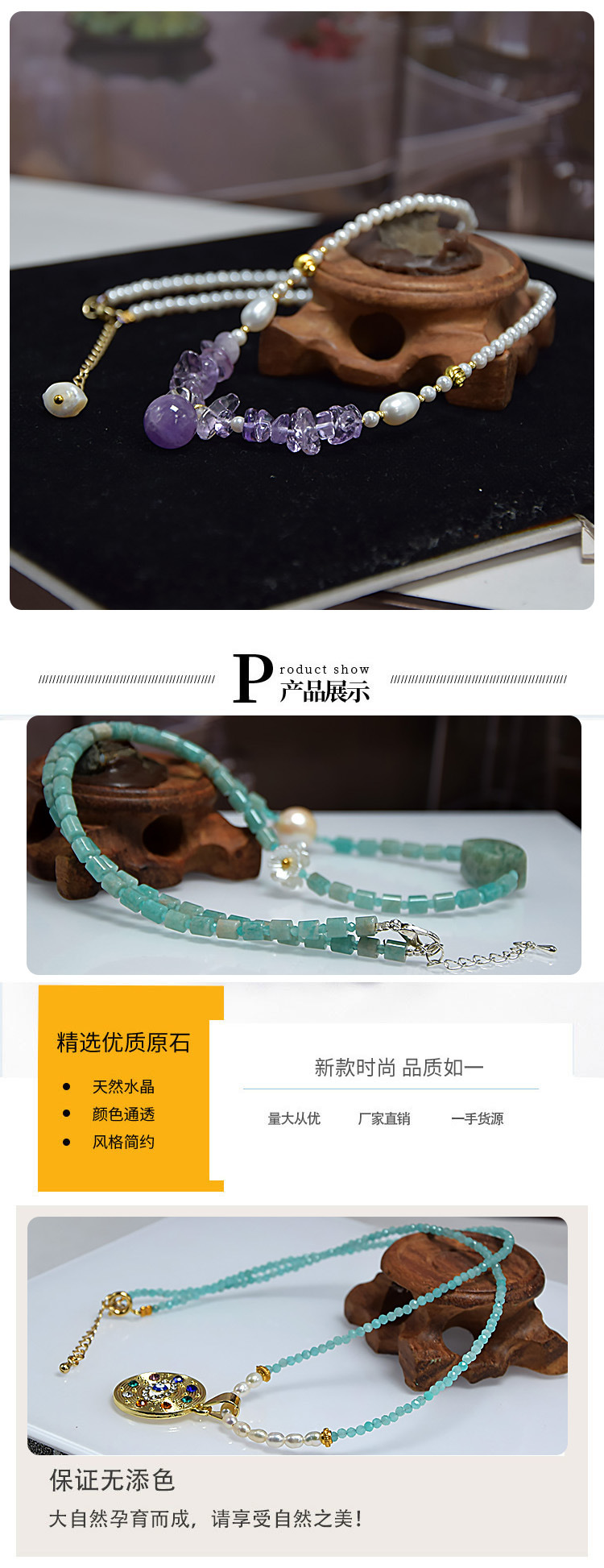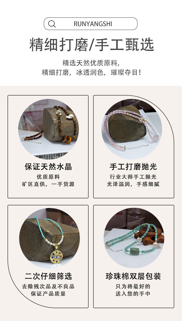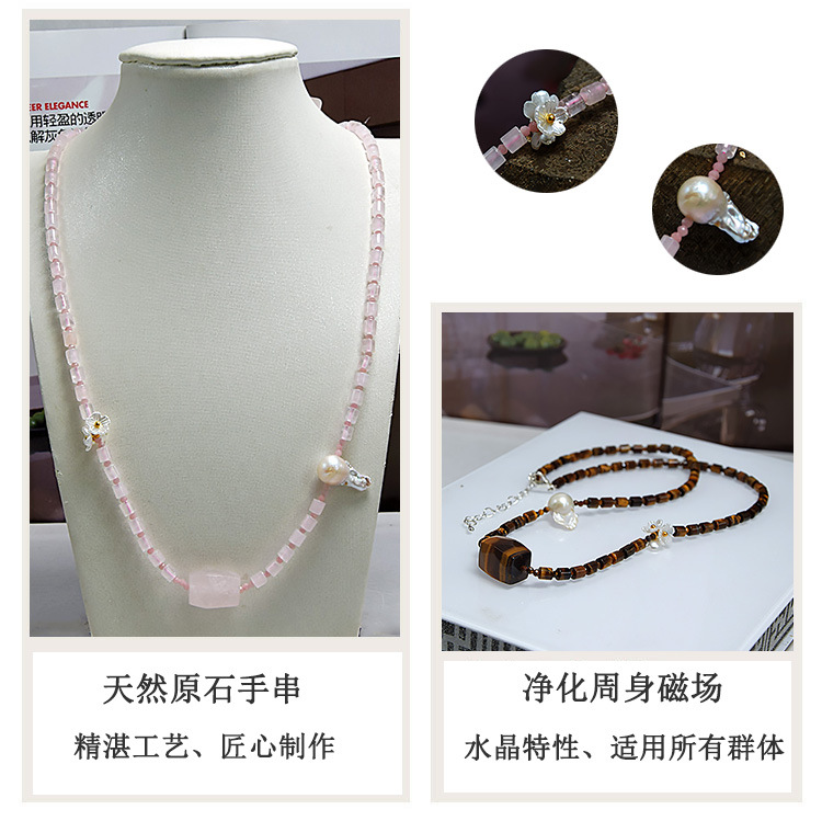 Ожерелье из розового кварца; Ожерелье из желтого тигрового глаза; Ожерелье из амазонита; Ожерелье из аметистового жемчуга; Цепочка диаметром из амазонитовых бусин сорго; белый кристалл дофамина; Белый перламутр, розовый кристалл; Многогранная Жемчужина