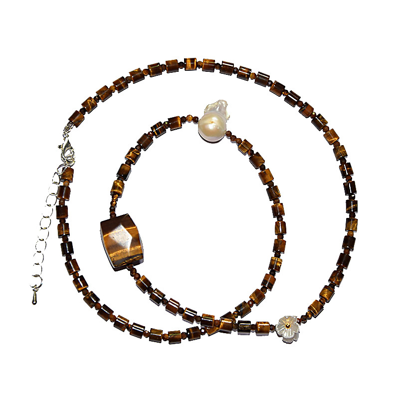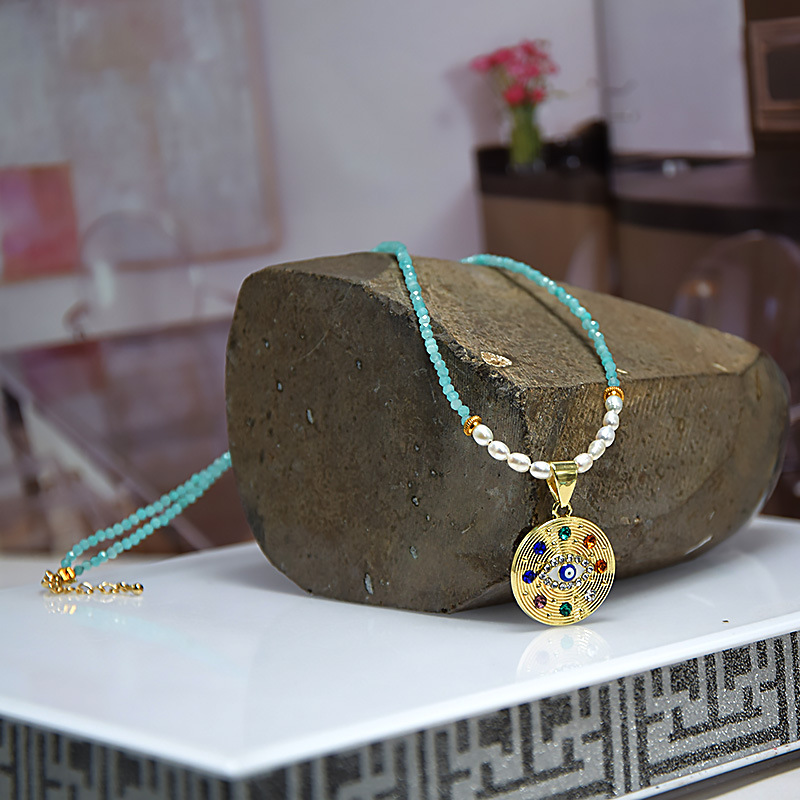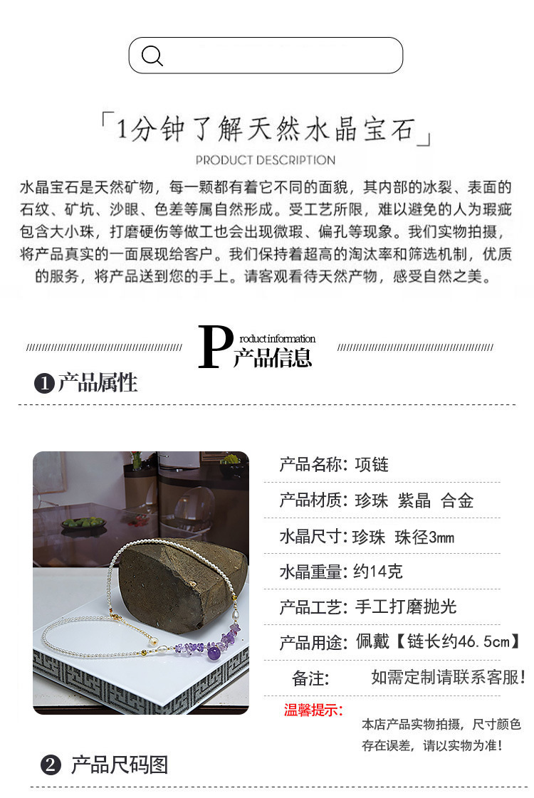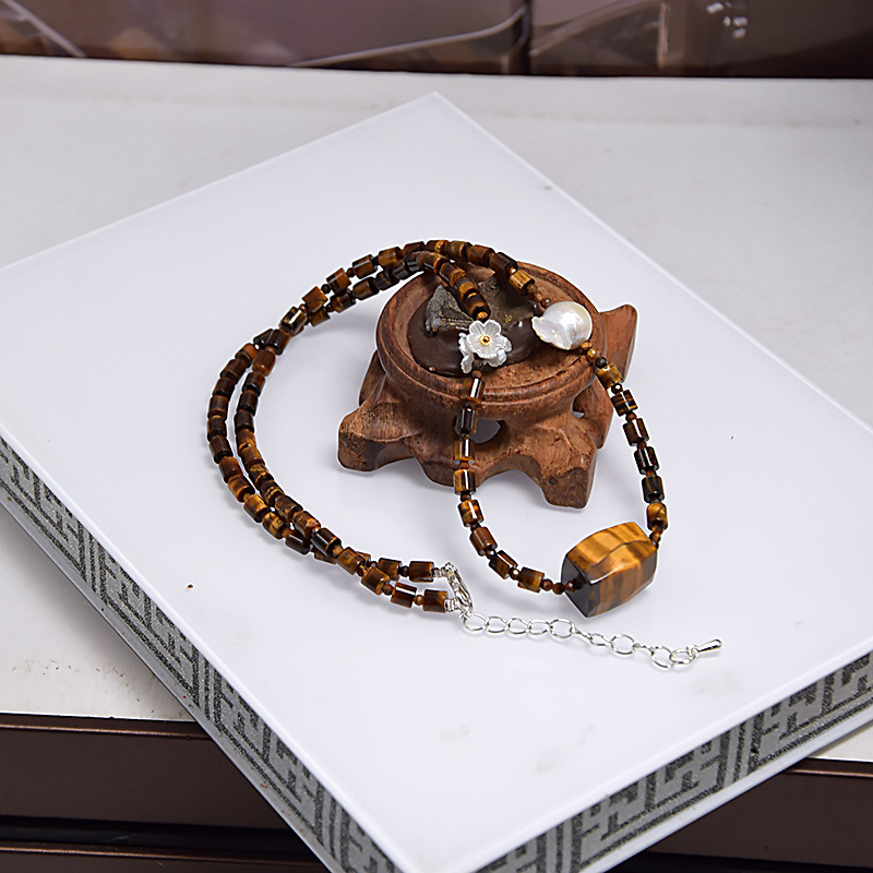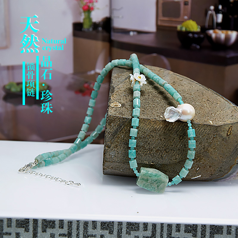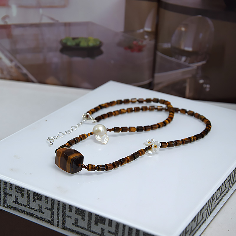 Ожерелье из розового кварца; Ожерелье из желтого тигрового глаза; Ожерелье из амазонита; Ожерелье из аметистового жемчуга; Цепочка диаметром из амазонитовых бусин сорго; белый кристалл дофамина; Белый перламутр, розовый кристалл; Многогранная Жемчужина