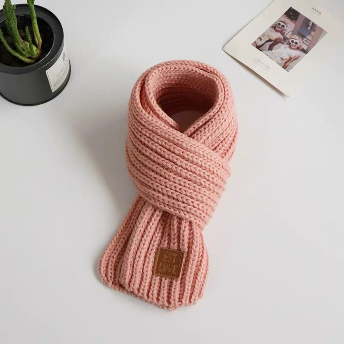 Новый вязаный детский милый зимний и осенний цветной универсальный теплый вязаный шерстяной милый шарф в корейском стиле с кожаной этикеткой
