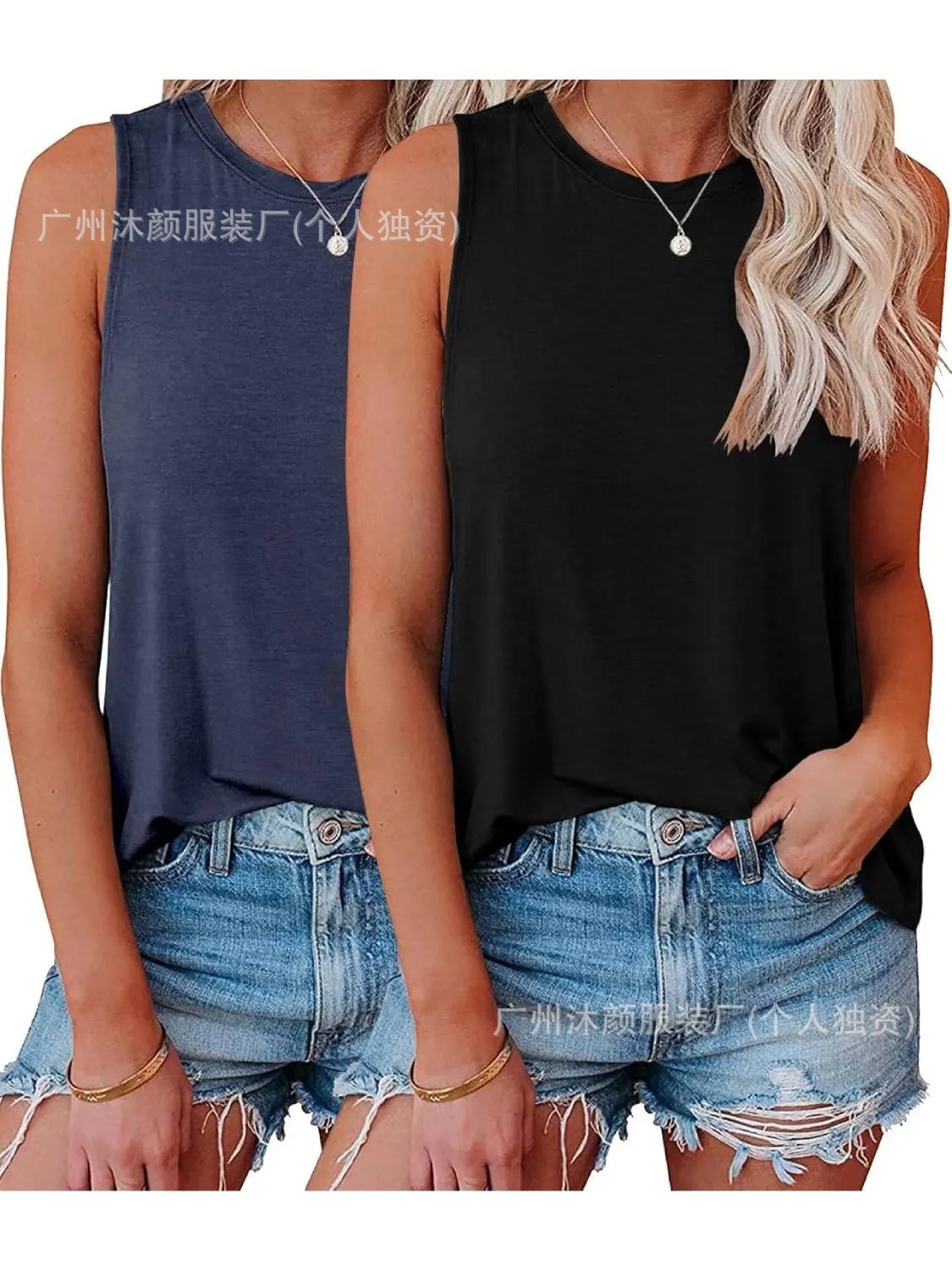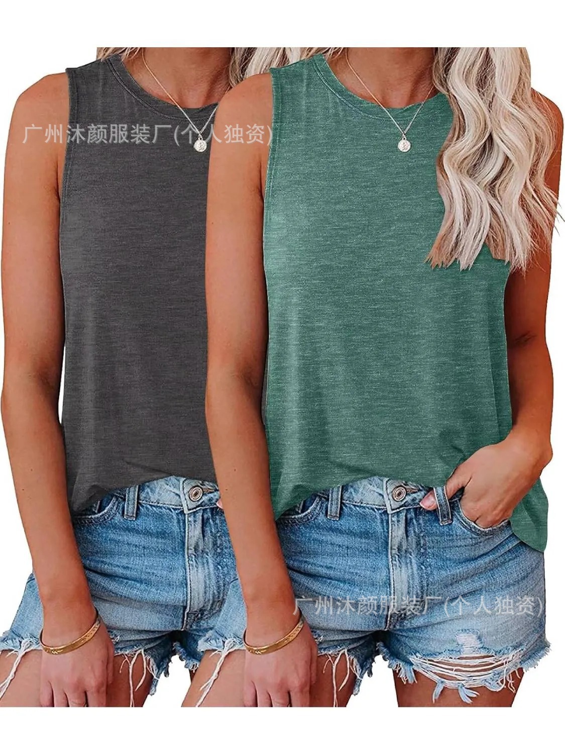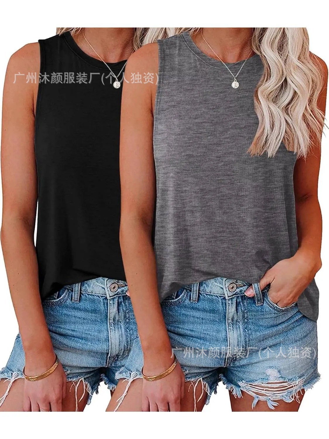 Кросс-бордерный комплект 2025 года: модный топ и футболка в европейско-американском стиле, ребристый, без рукавов, с круглым вырезом, однотонный, двухкомпонентный.