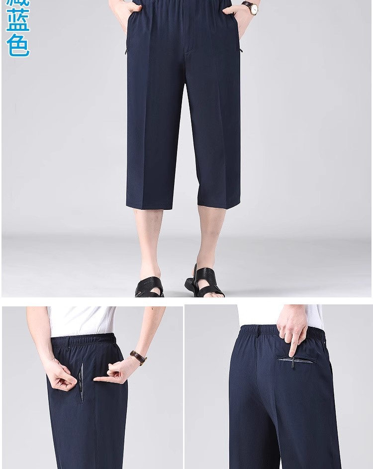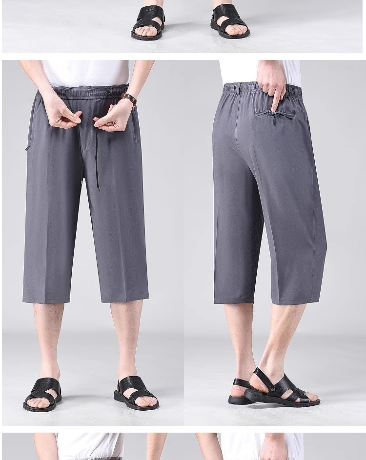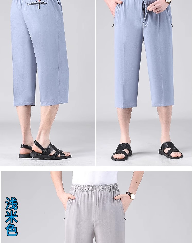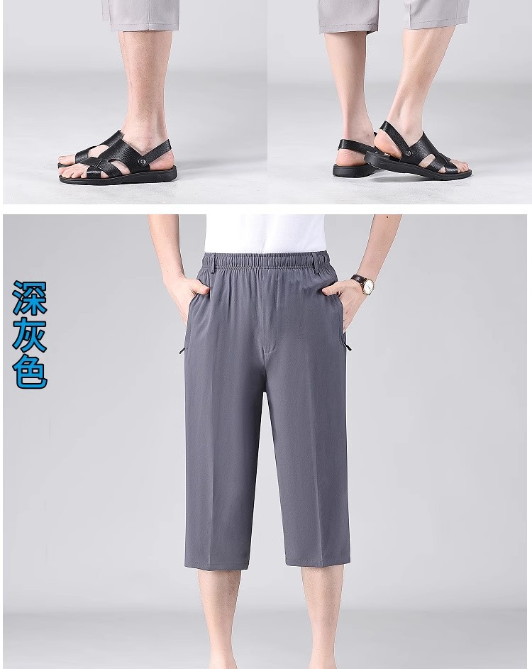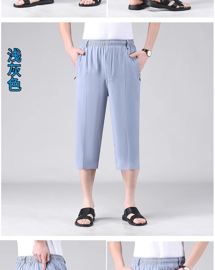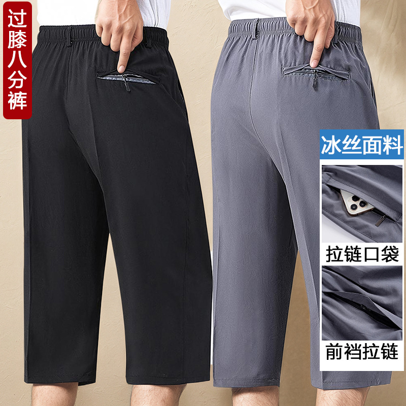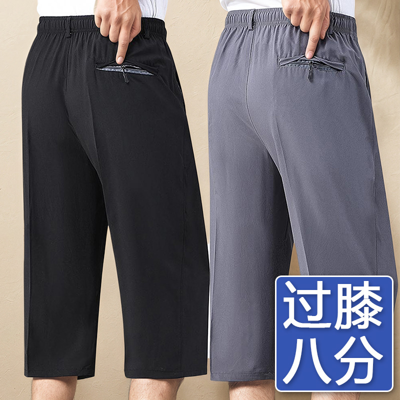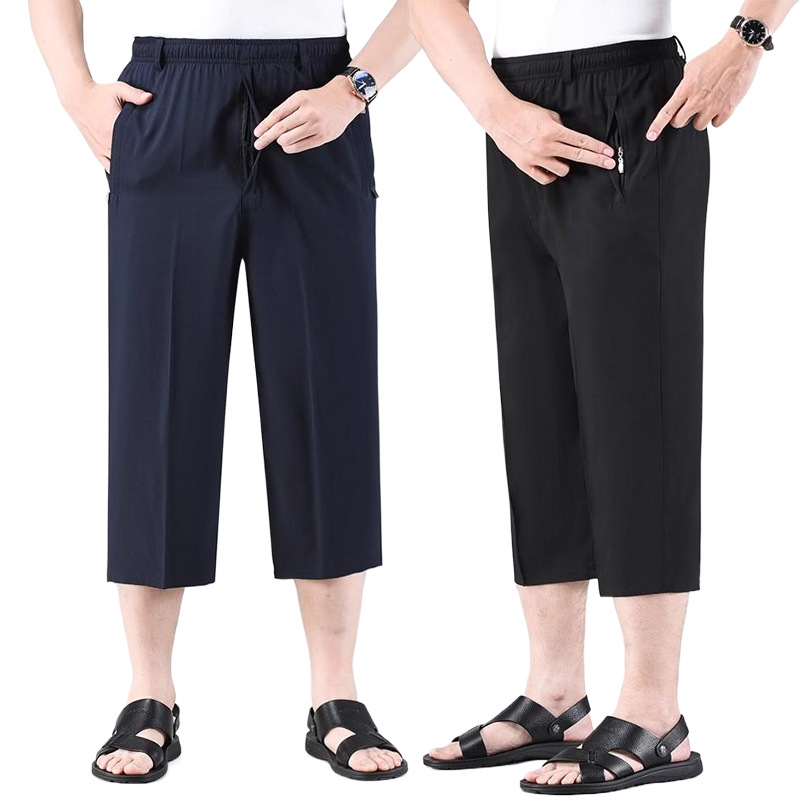 Летние тонкие укороченные брюки для мужчин, шорты из ледяного шелка в стиле папы, миниатюрные повседневные брюки, быстросохнущие брюки средней длины для среднего и пожилого возраста.