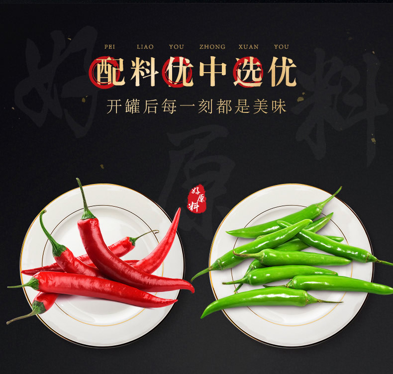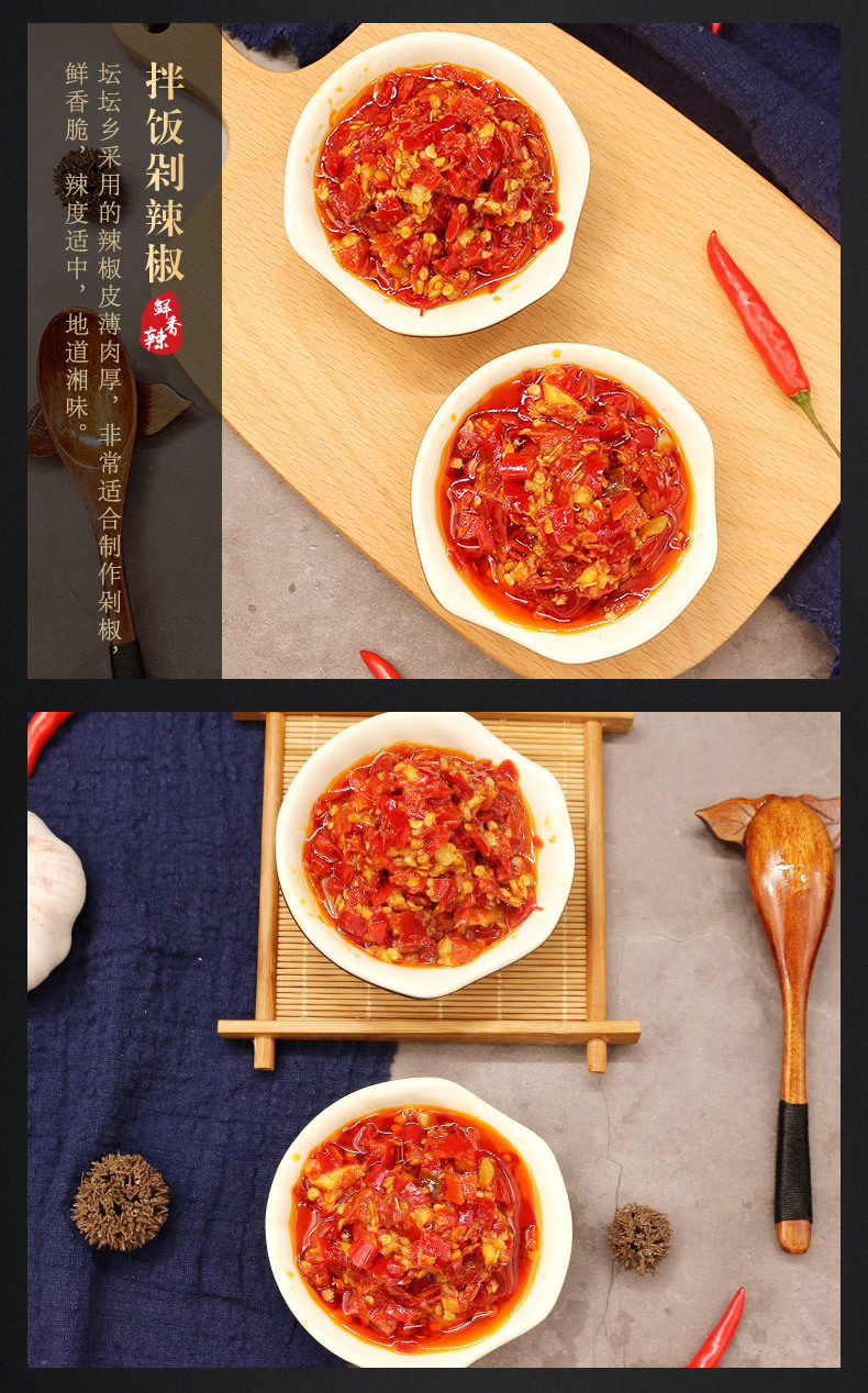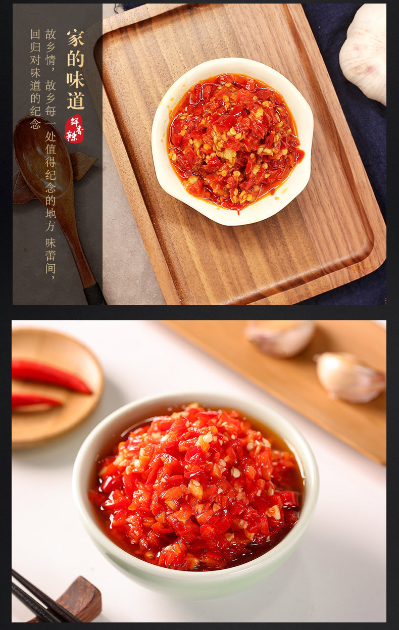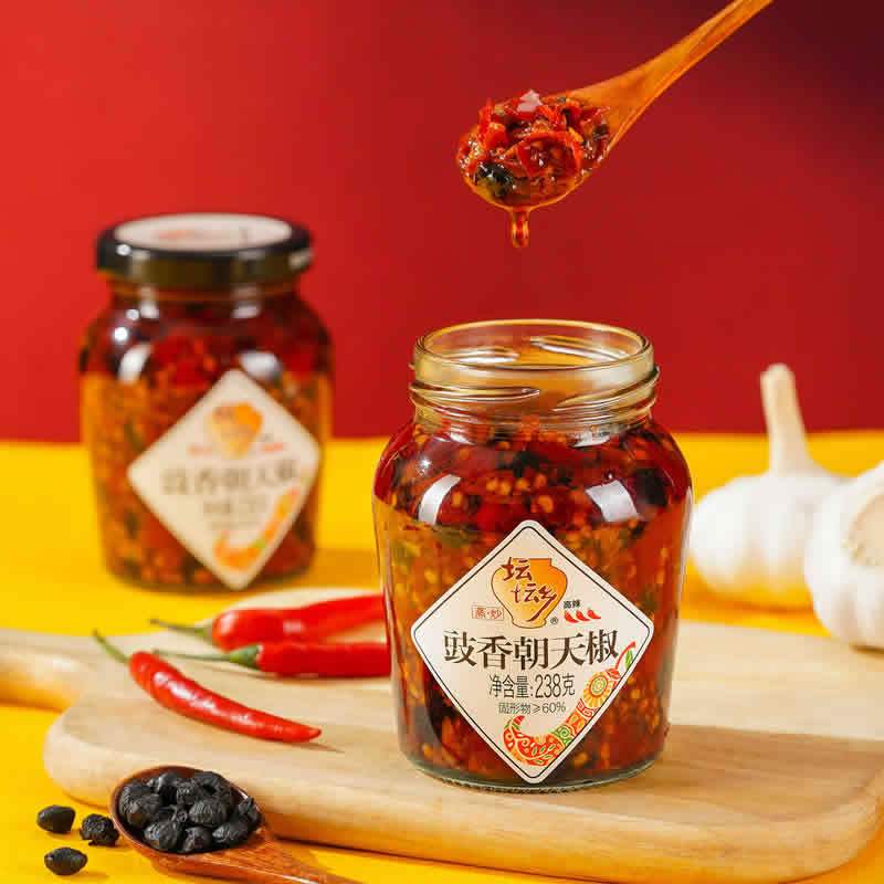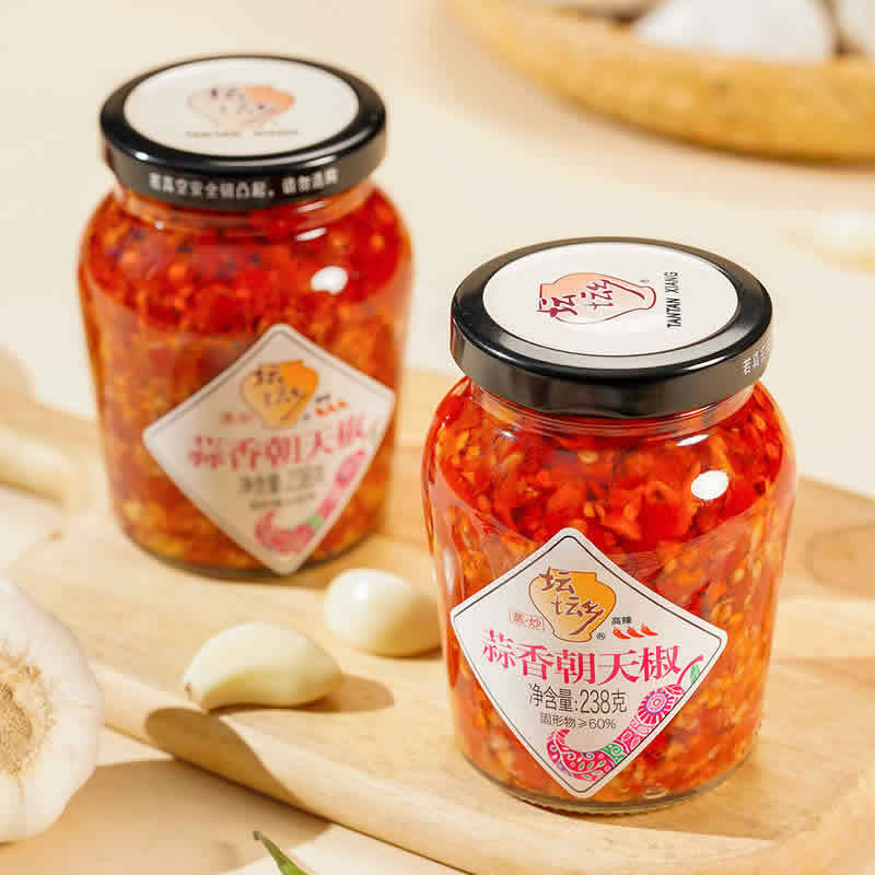 Бибимбап с нарезанным перцем чили 238г; Перец чили измельченный изысканный 210г; Рыба на пару с рубленым перцем чили 238г; Чили с чесноком 238г; Перец Чаотиан со вкусом черной фасоли 238г; Гонгцай Чаотиан Перец 220 г; Перец просо изысканный 210г; Чесночный соус чили 238г