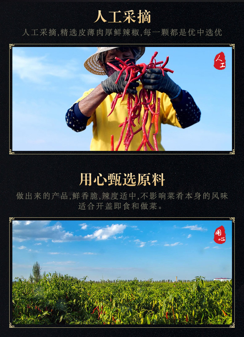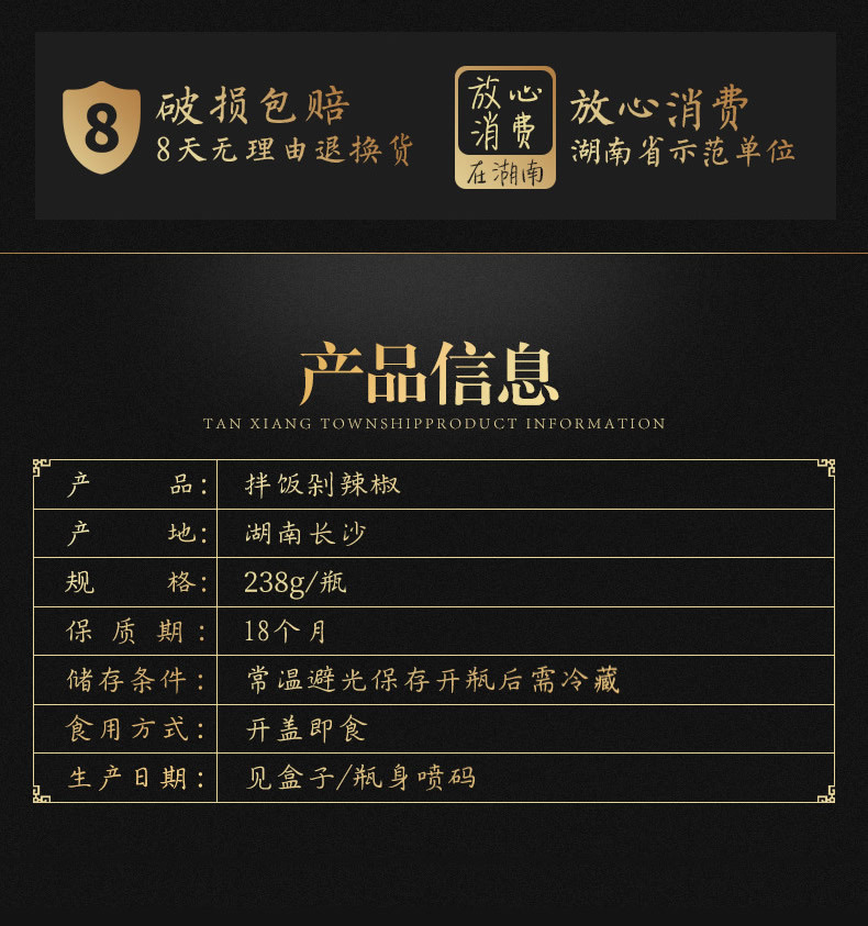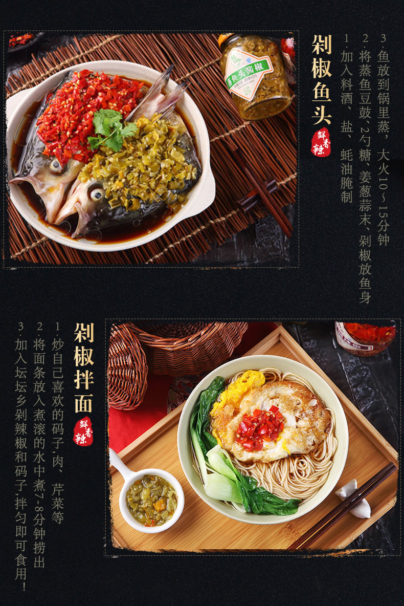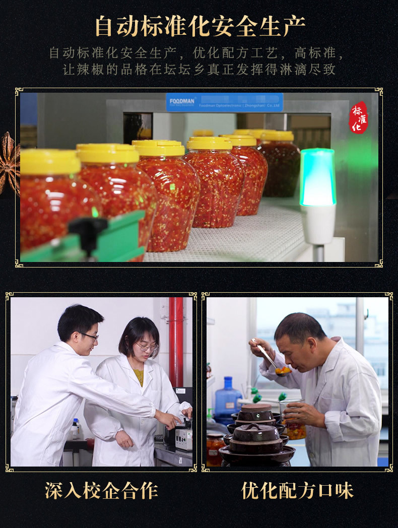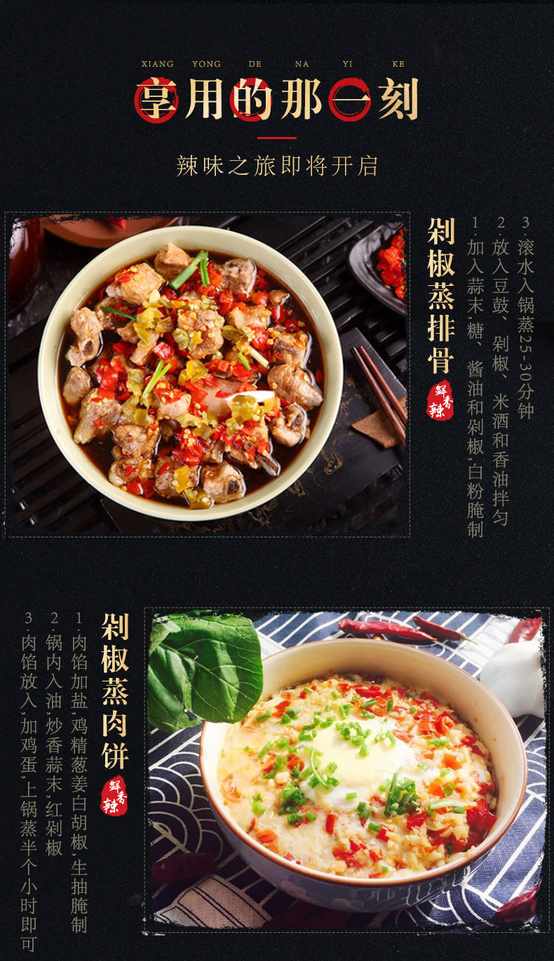Бибимбап с нарезанным перцем чили 238г; Перец чили измельченный изысканный 210г; Рыба на пару с рубленым перцем чили 238г; Чили с чесноком 238г; Перец Чаотиан со вкусом черной фасоли 238г; Гонгцай Чаотиан Перец 220 г; Перец просо изысканный 210г; Чесночный соус чили 238г