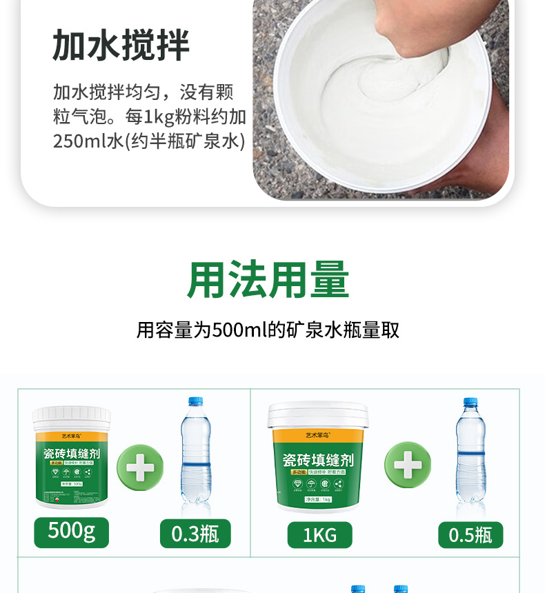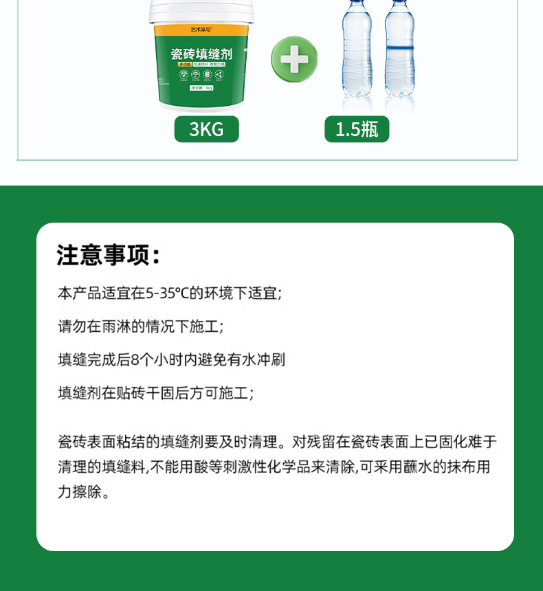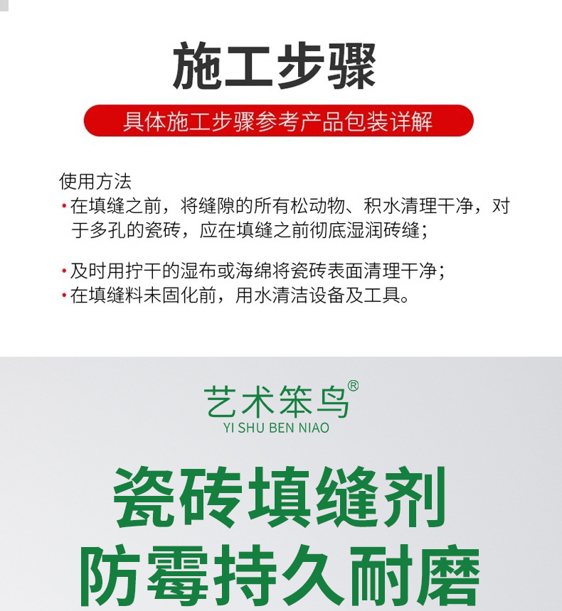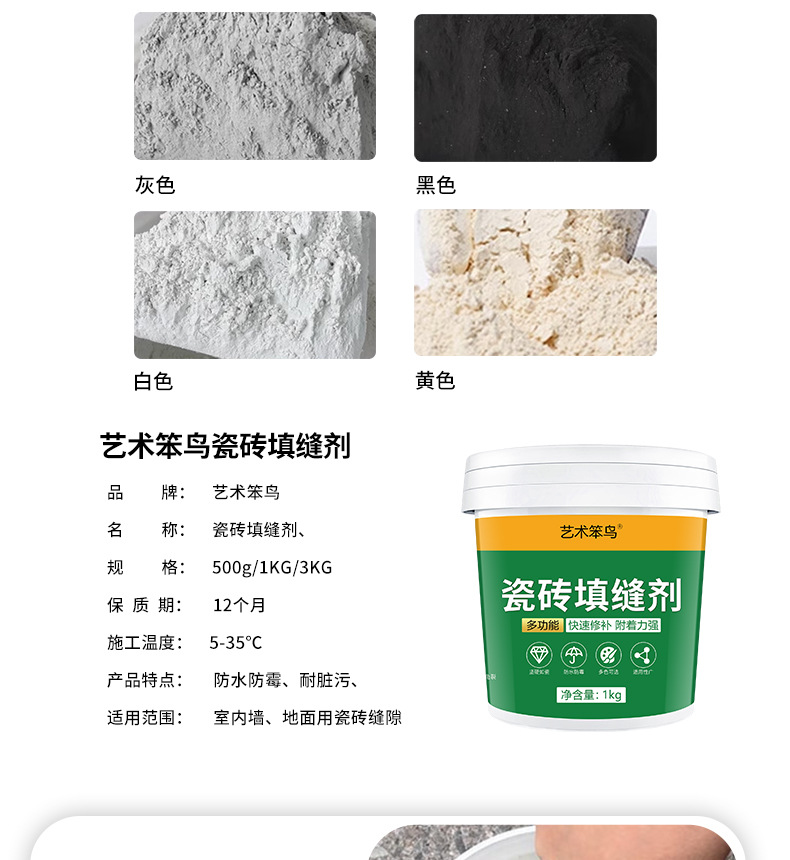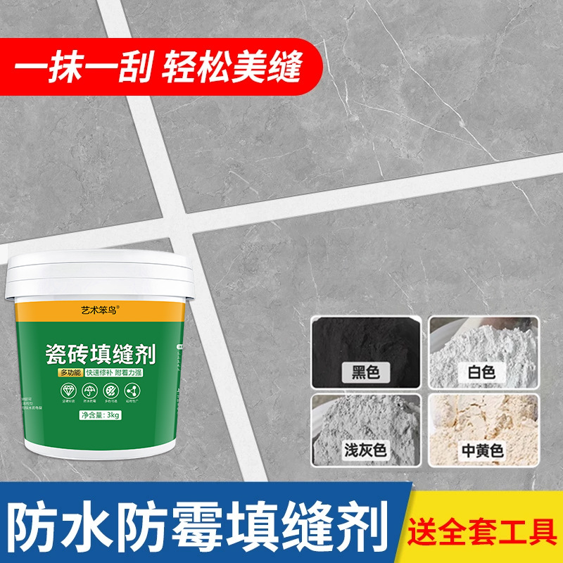 500 г средства для затирки плитки-белого цвета; 500 г средства для затирки плитки-черный; 500г средства для затирки плитки-светло-серый; 500 г средства для затирки керамической плитки-средне-желтого цвета; Инструменты (лопата-большой скребок)