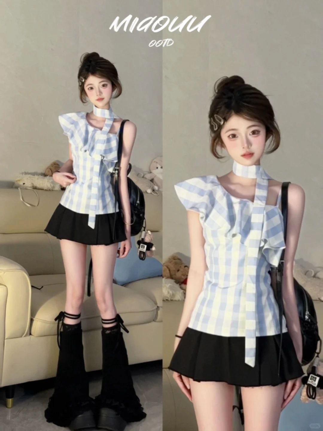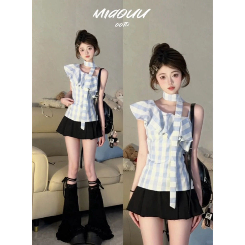 Женский костюм Pure Desire Hot Girl, лето 2025, новый корейский стиль, топ и юбка в клетку с рюшами и открытыми плечами, комплект из двух предметов