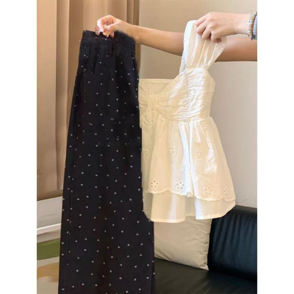 Женский летний комплект 2025 года: кружевная рубашка-камзол в стиле французского шика с вышивкой, многослойная, с эффектом омоложения, и широкие брюки в горошек.