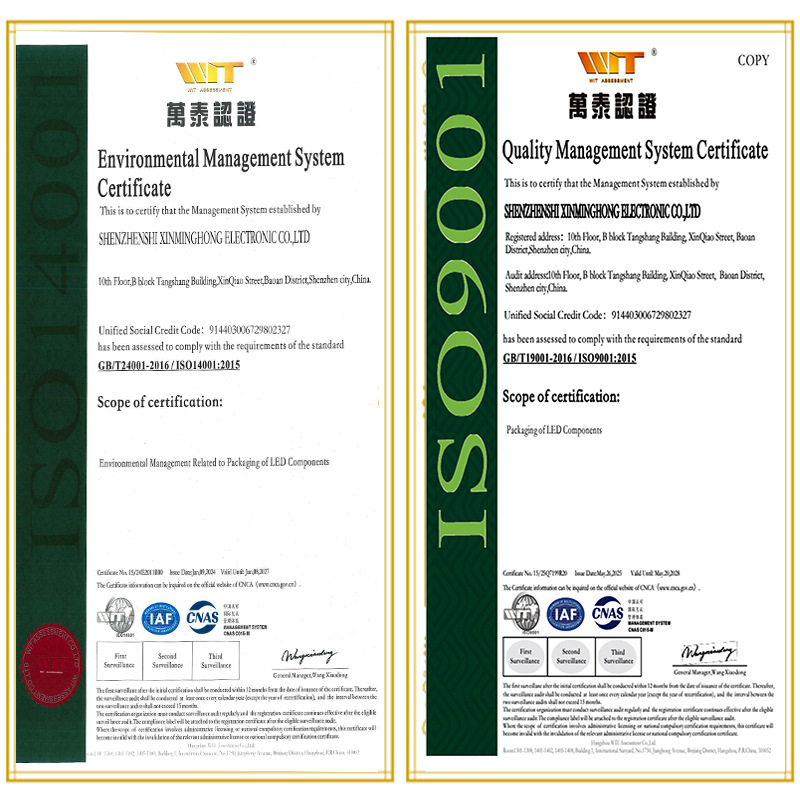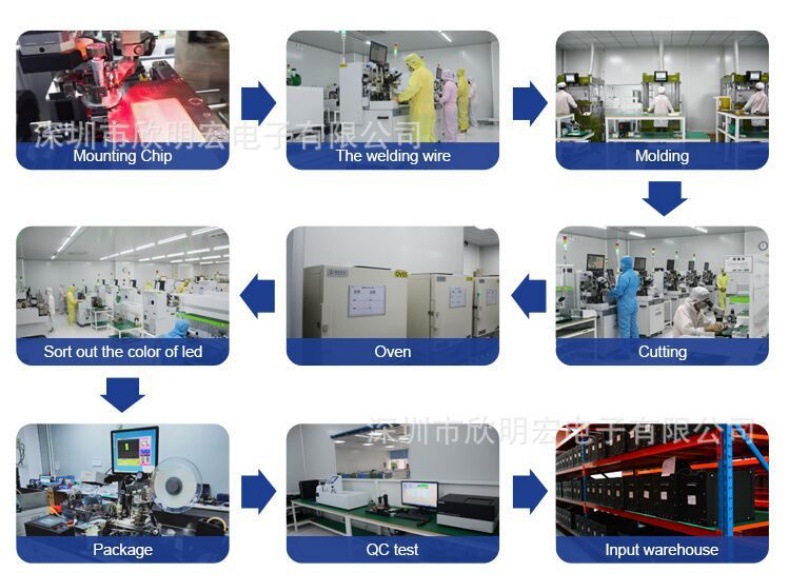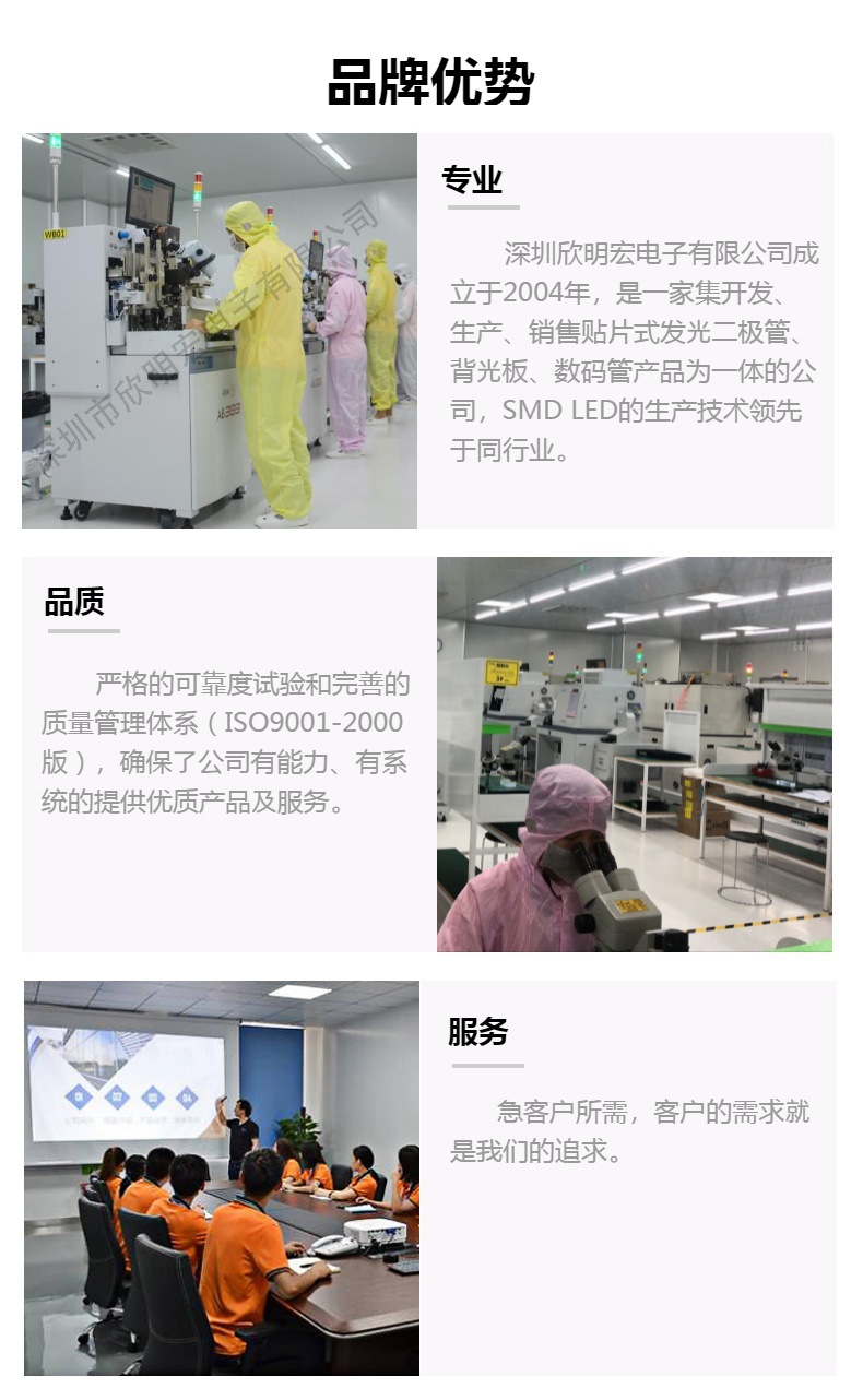 深圳欣明宏电子有限公司成立于2004年,是一家集开发、生产、销售贴片式发光二极管、背光板、数码管产品为一体的公司,SMD LED的生产技术领先于同行业。LED贴片月产能达500万PC。