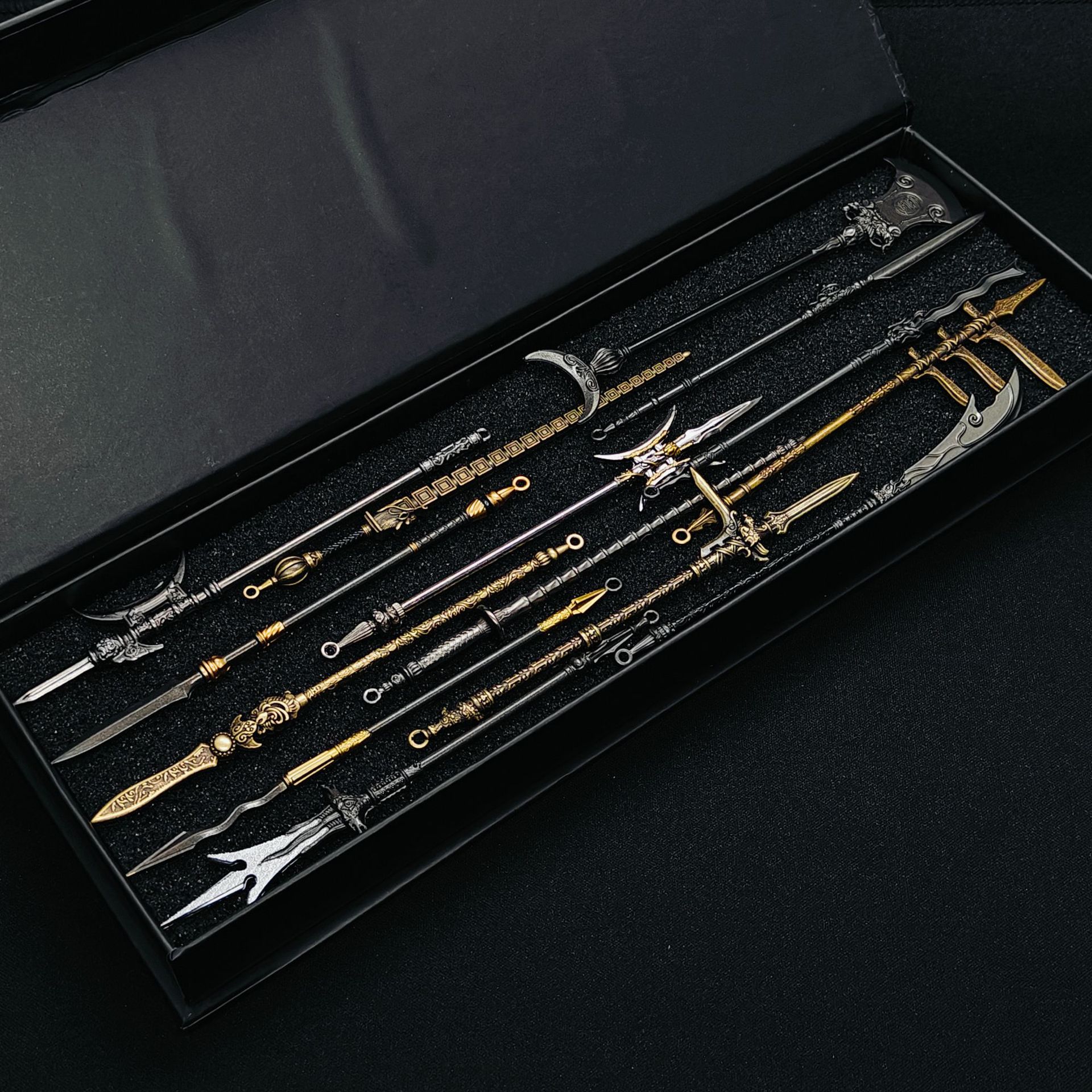 Набор из 7 предметов древнего меча длиной 12 см.; Набор из 7 предметов древнего меча длиной 12 см (включая подарочную коробку); Набор оружия 12 см из 14 предметов.; Набор из 14 предметов оружия диаметром 12 см (включая подарочную коробку); Меч Цинь Ван 12 см; Меч Хань 12 см.; Меч Юэ Ван 12 см; Меч Руи 12 см; Вышитый пружинный нож длиной 12 см.; Тан Хэндао 12 см; Гуцзянский меч длиной 12 см.; Меч Гуцзянь 12 см в коробке; Пистолет Чаофэн 12 см.; Трехточечный пистолет 12 см.; Трехглавый меч длиной 12 см.; 12-сантиметровая горечавка; Нож Ян Юэ 12 см.; Змеиный копье длиной 12 см А; Змеиный копье длиной 12 см B; Халберда в форме полумесяца длиной 12 см.; Сопля с восемью краями длиной 12 см.; Стальной кнут длиной 12 см.; Цинь Чанге 12 см; 12 см сливового вина; Лопата в форме полумесяца длиной 12 см.; Двойная лунная алебарда 12 см.