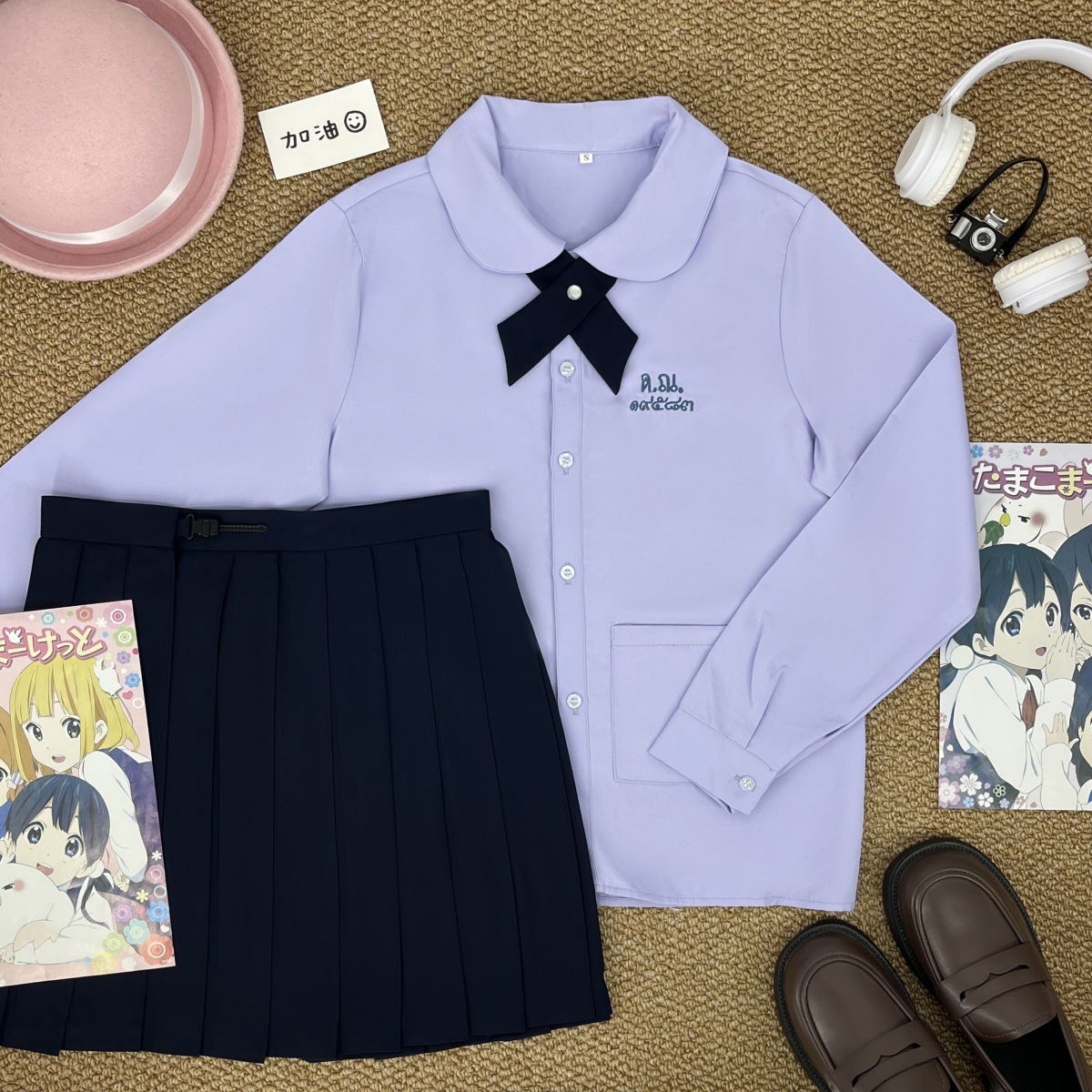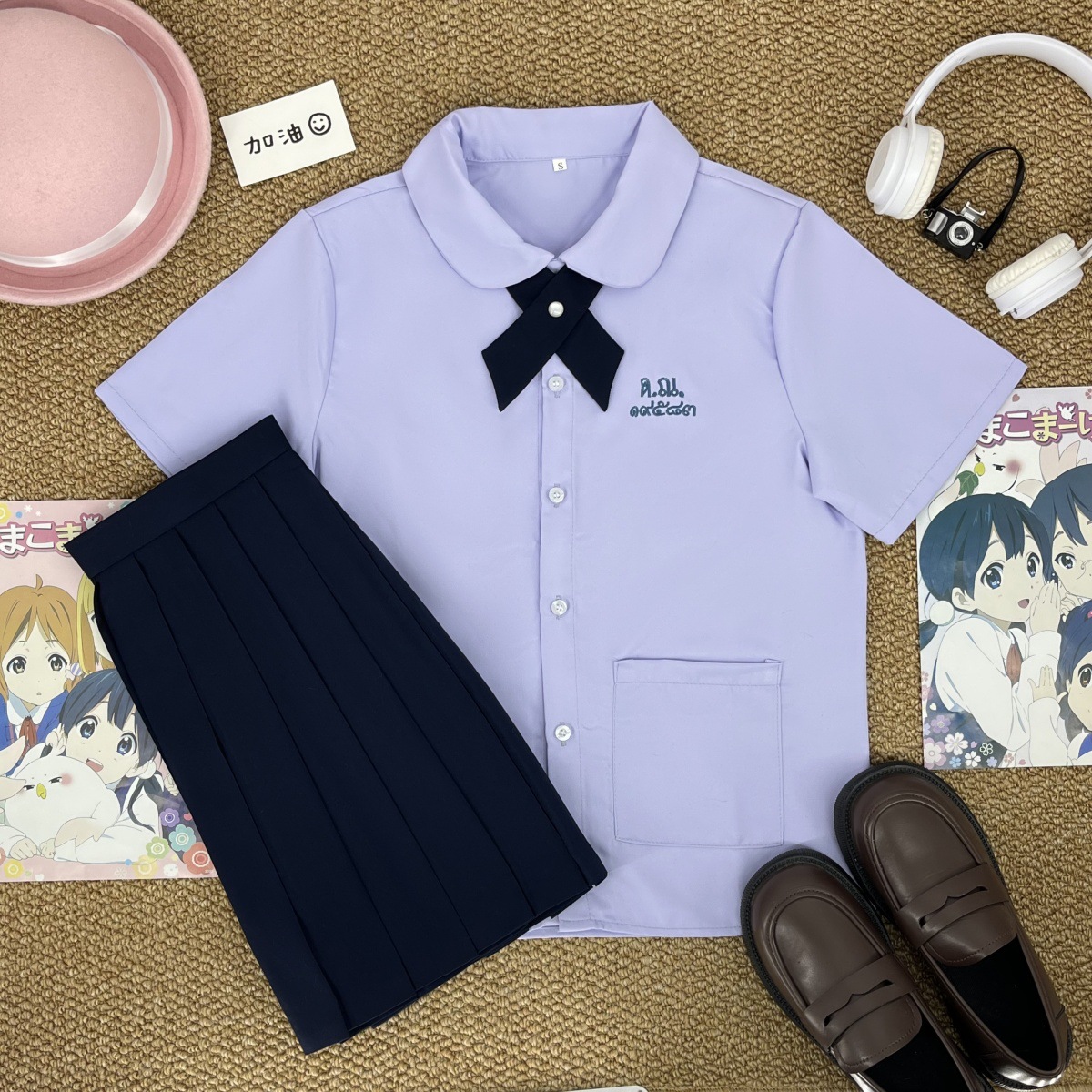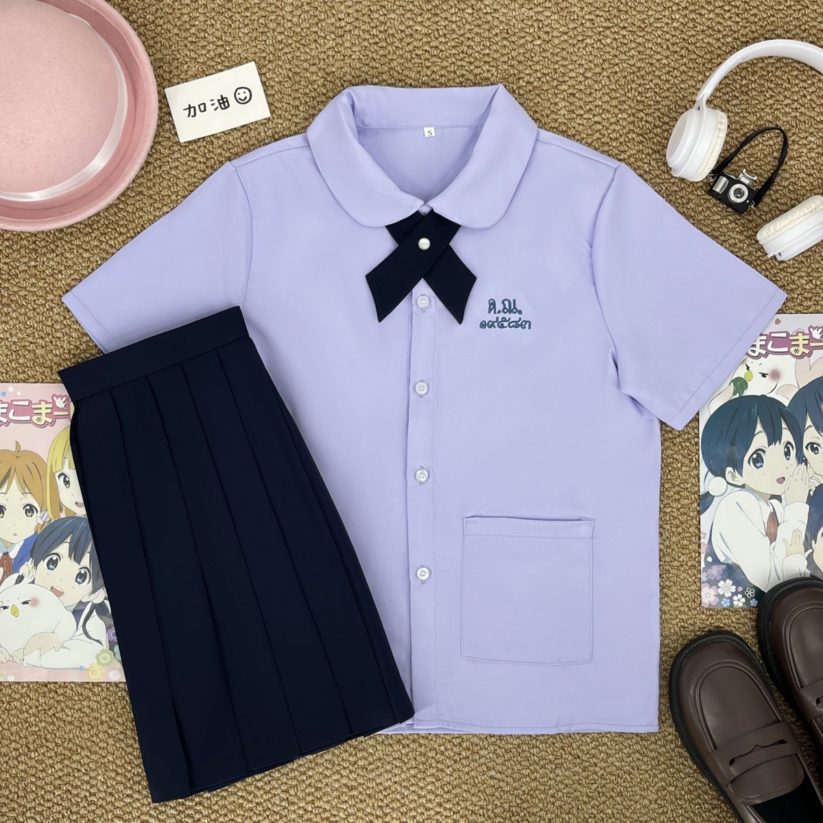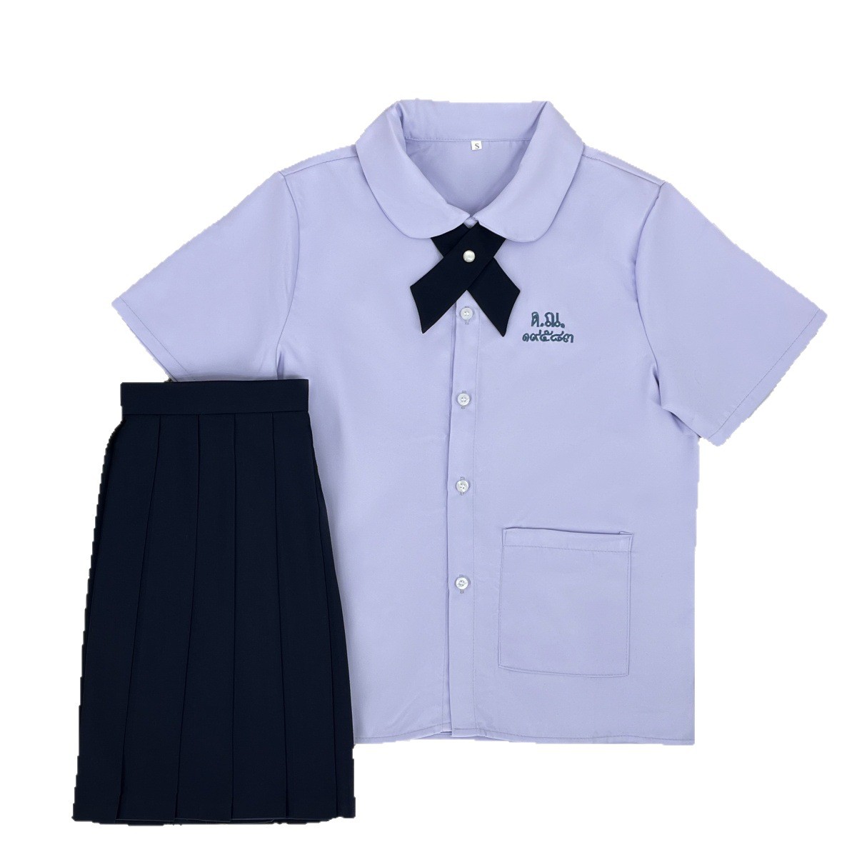 Тайская школьная форма, женская рубашка с короткими рукавами + широкий крестовый узел голубого цвета; Тайская школьная форма, женская рубашка с длинными рукавами + широкий крестовый узел голубого цвета; Тайская школьная форма, женская рубашка с короткими рукавами + широкий крестовый узел голубого цвета + прямая юбка голубого цвета; Тайская школьная форма, женская рубашка с длинными рукавами + голубой широкий крест + голубая прямая юбка