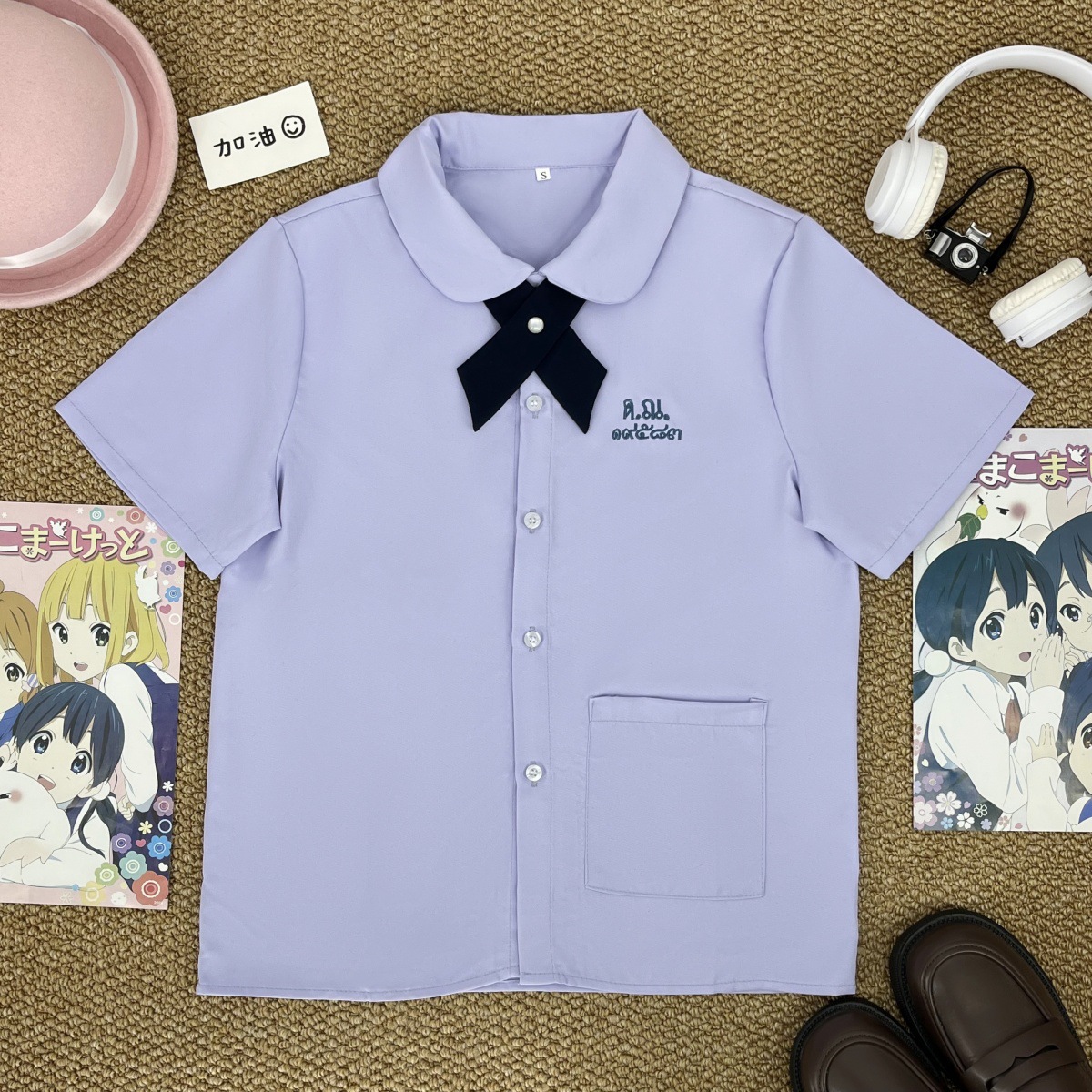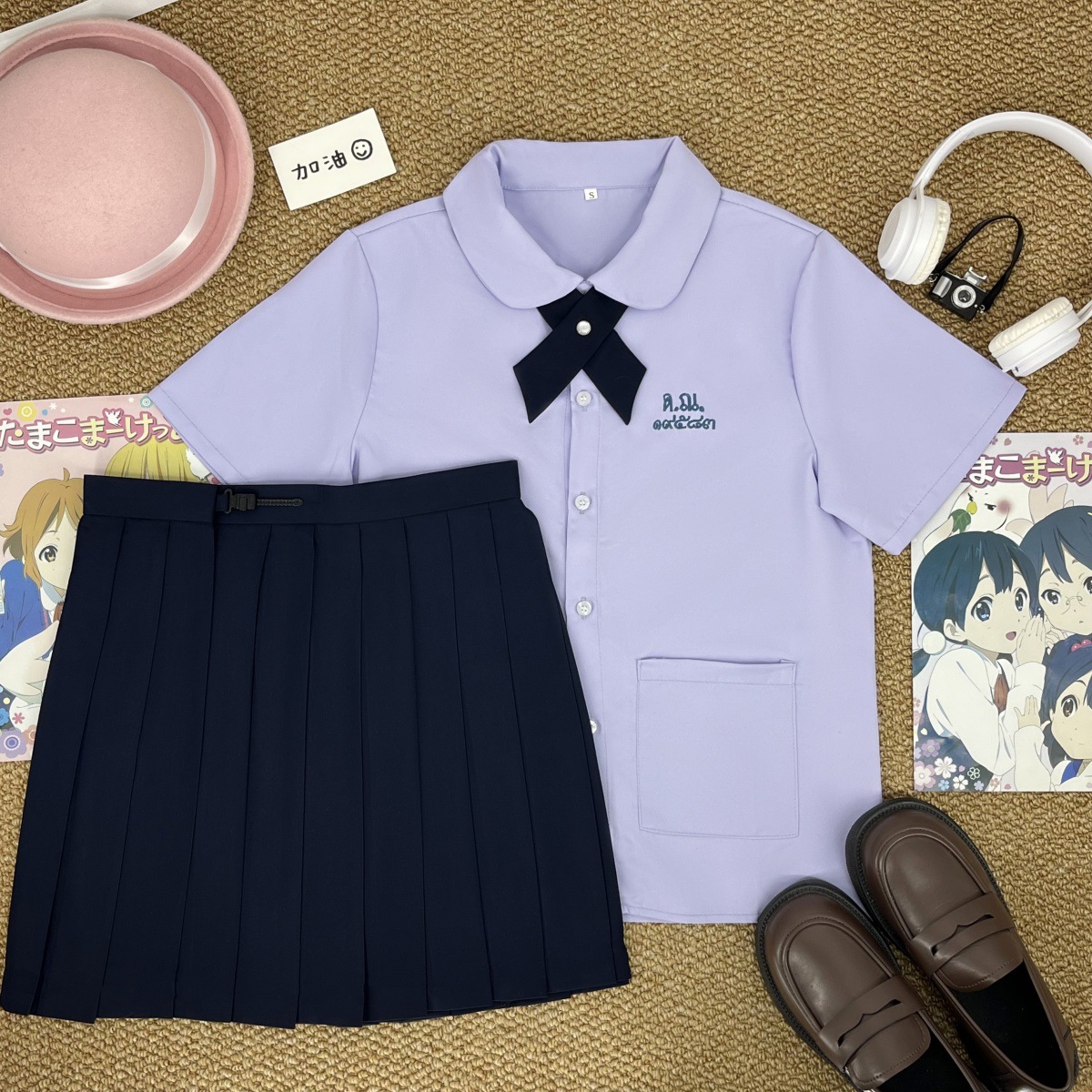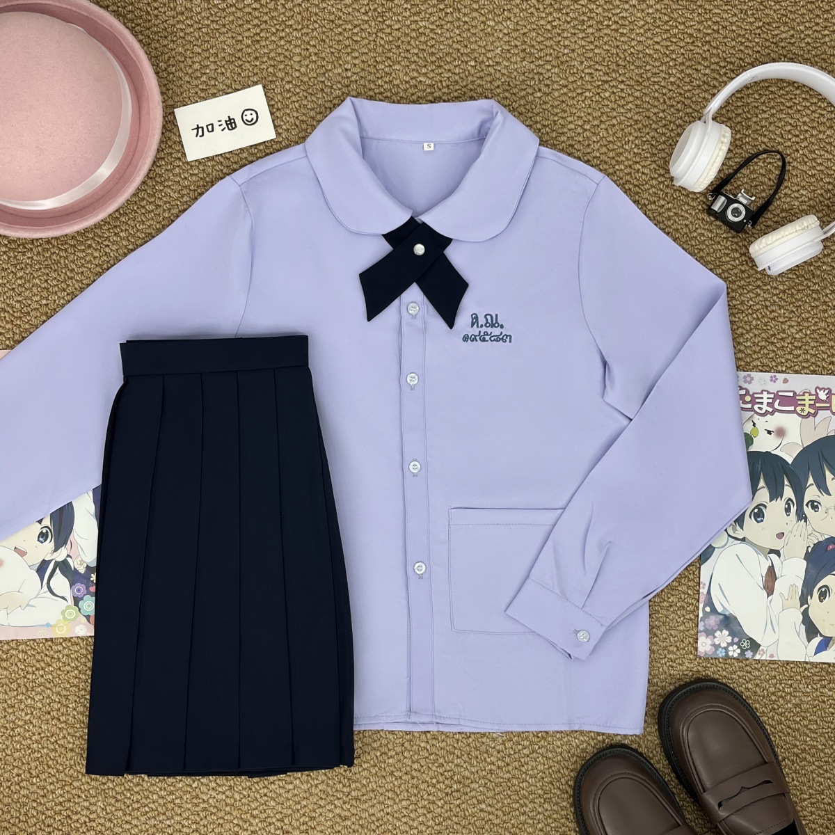 Тайская школьная форма, женская рубашка с короткими рукавами + широкий крестовый узел голубого цвета; Тайская школьная форма, женская рубашка с длинными рукавами + широкий крестовый узел голубого цвета; Тайская школьная форма, женская рубашка с короткими рукавами + широкий крестовый узел голубого цвета + прямая юбка голубого цвета; Тайская школьная форма, женская рубашка с длинными рукавами + голубой широкий крест + голубая прямая юбка