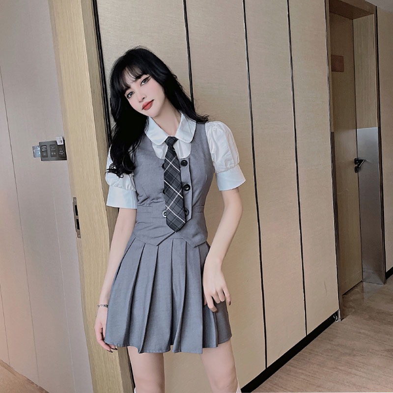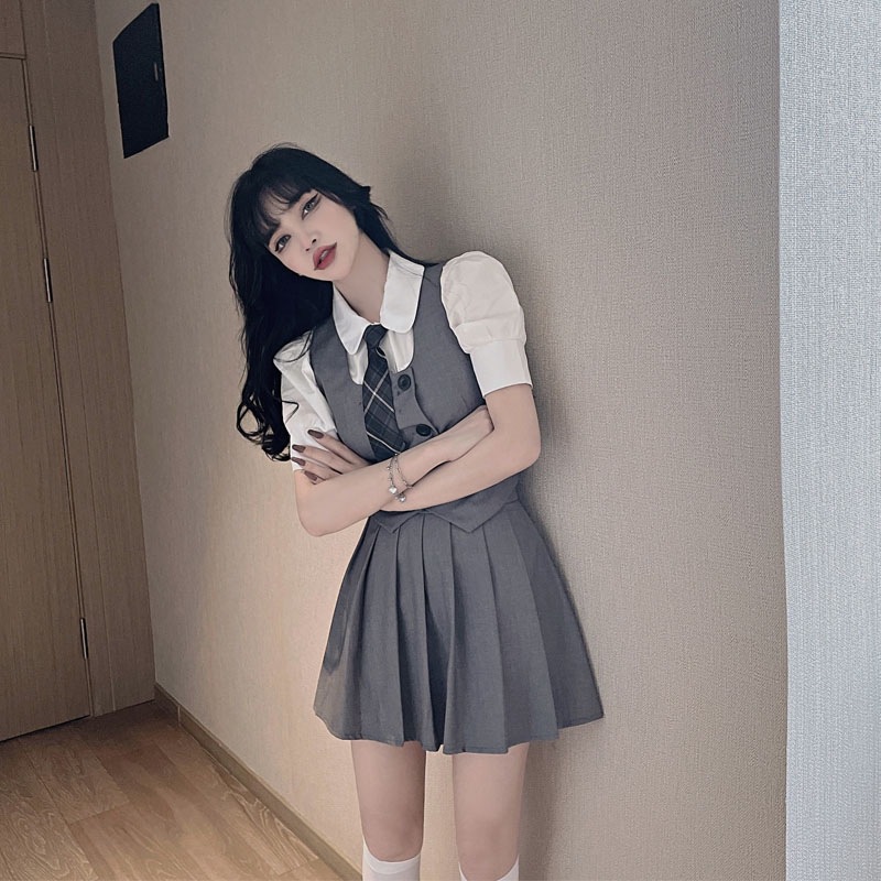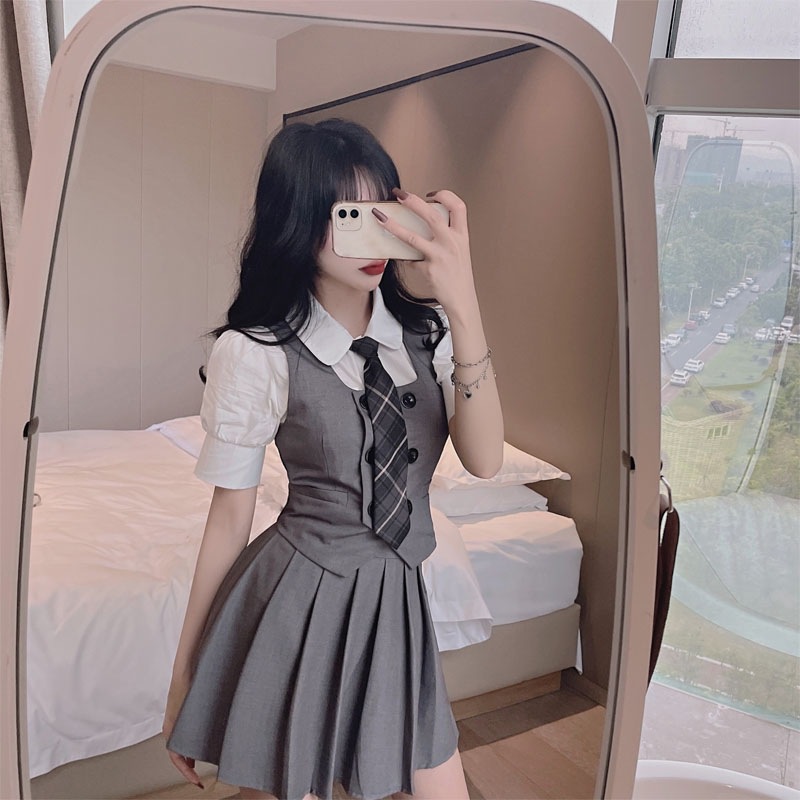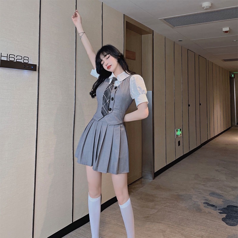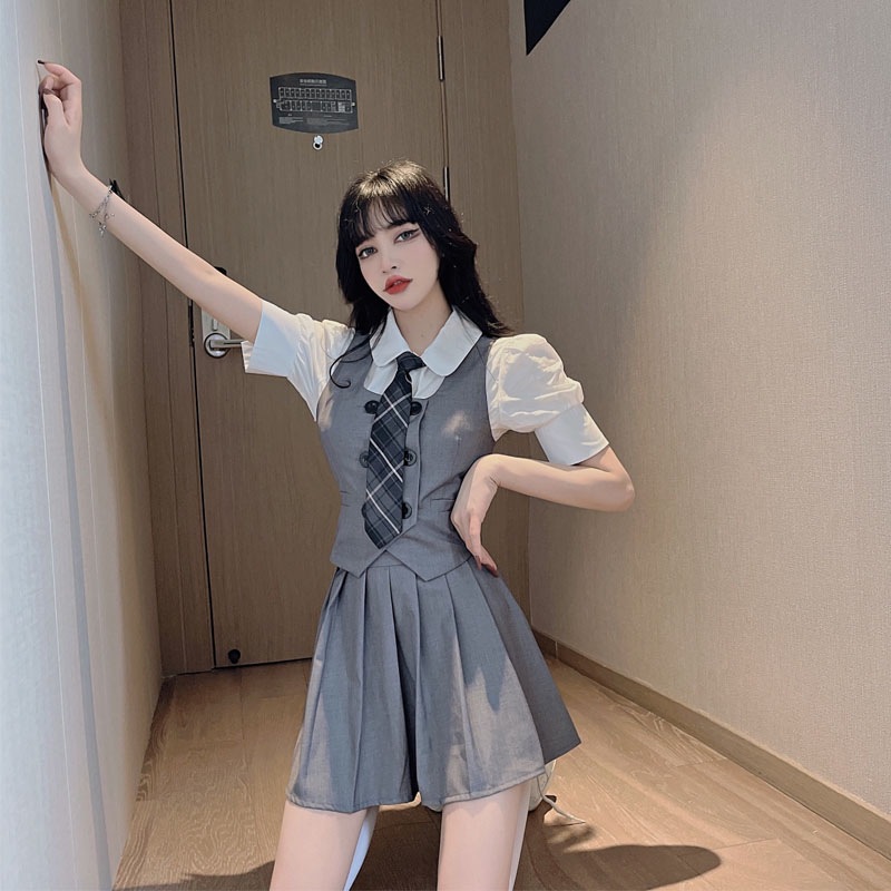 Женский костюм JK с плиссированной юбкой, летний стиль преппи, школьная форма в британском и корейском стиле, трехкомпонентный костюм с жилетом