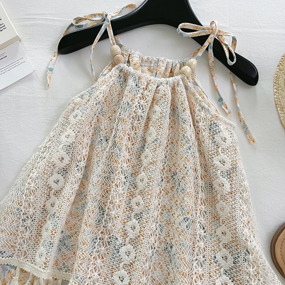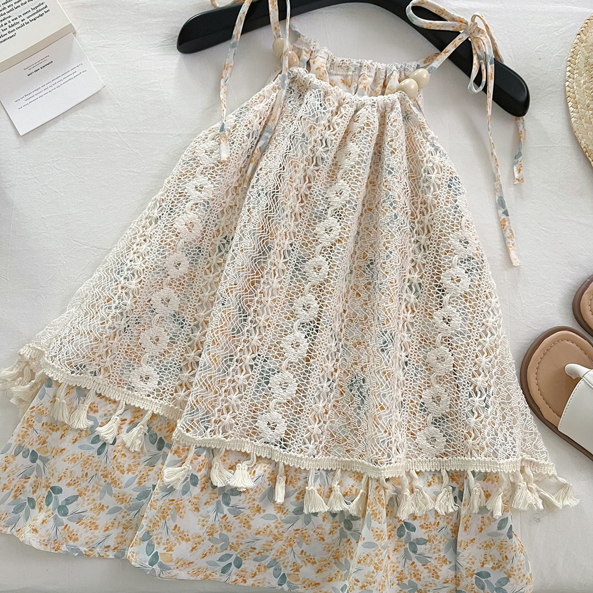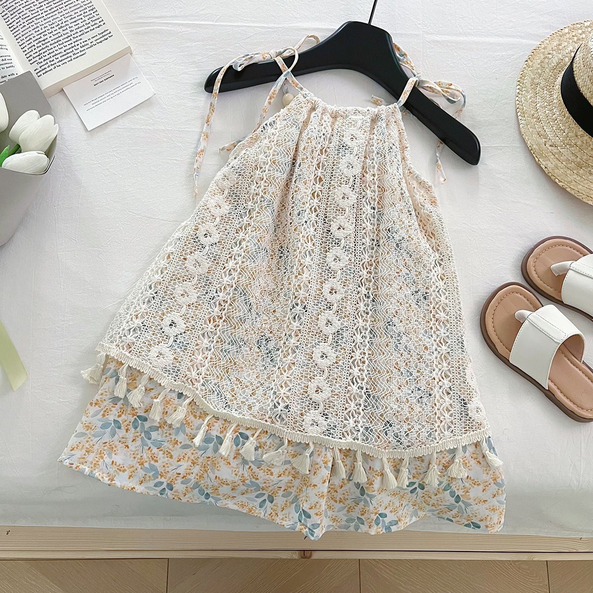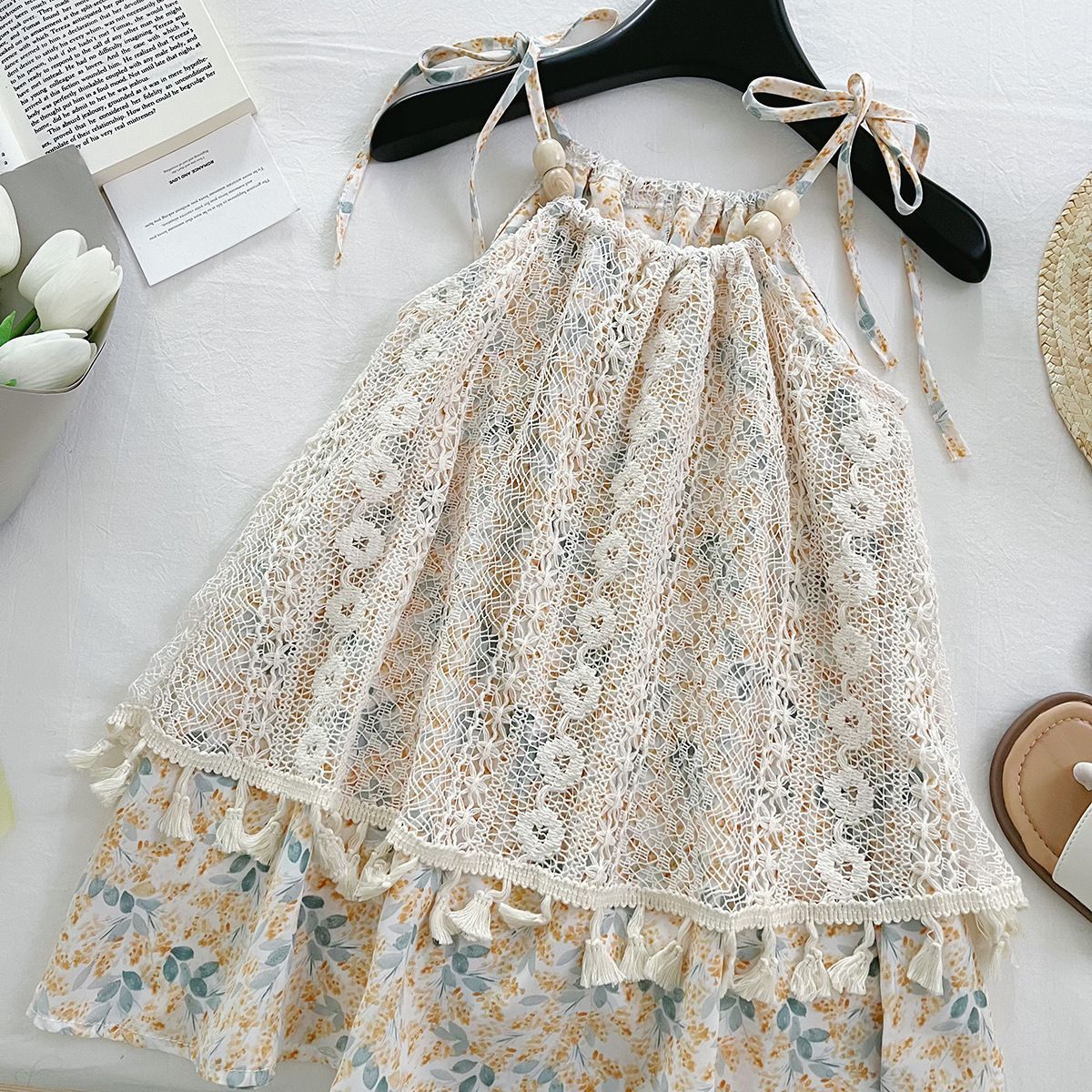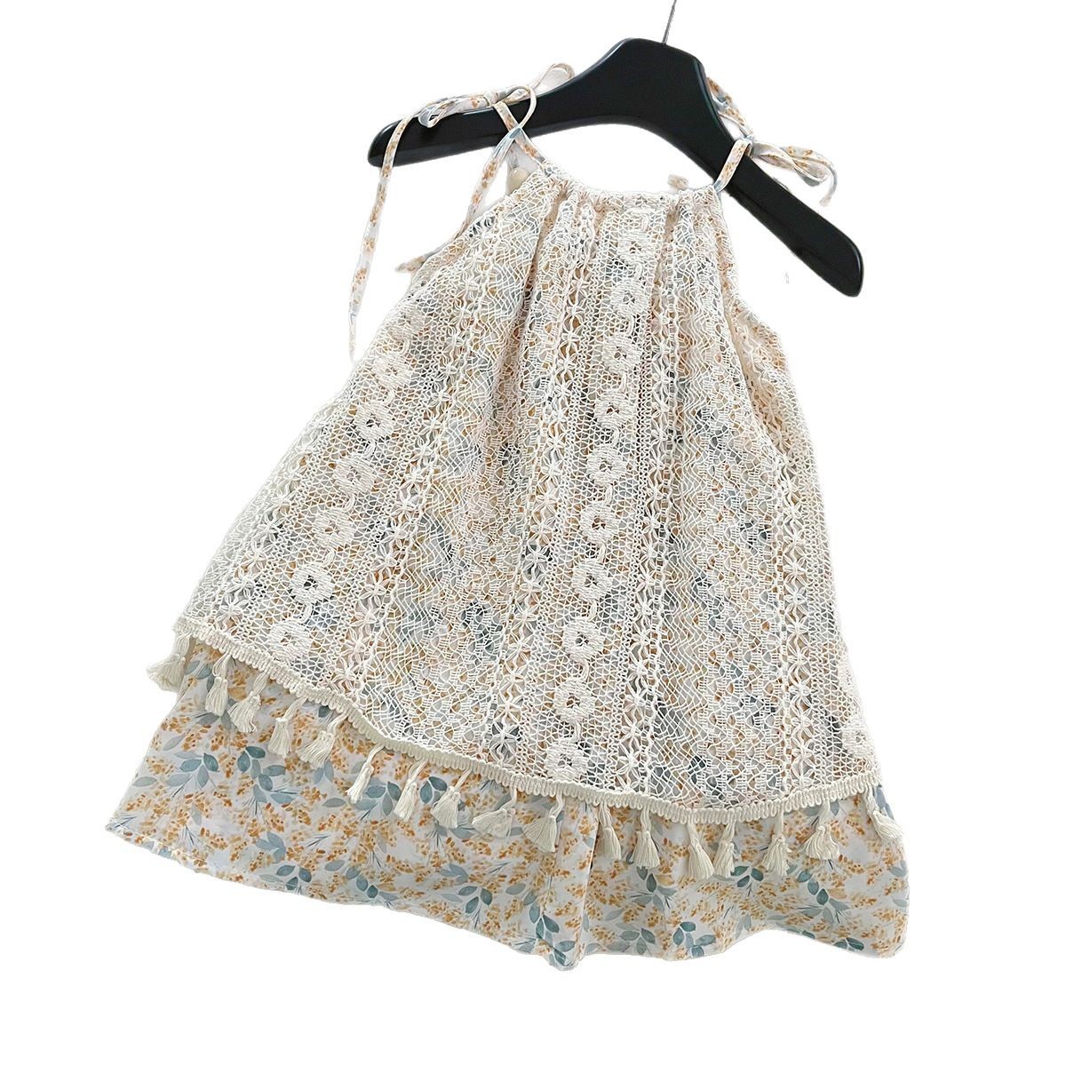 Лето 2025 года, милое платье на бретельках с цветочным принтом для девочек в корейском стиле, модное милое детское платье для девочек, модное платье трапециевидной формы.