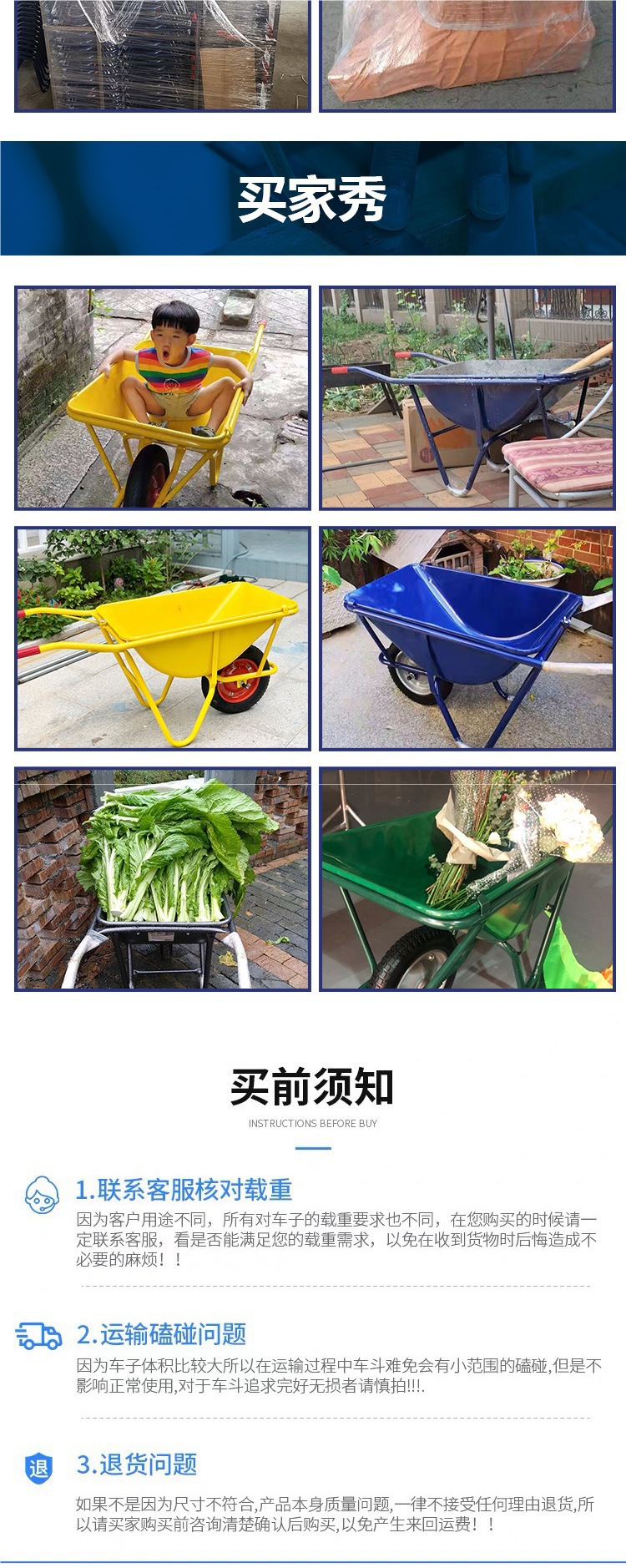 Специальная серия маленькой синей тачки с надувным колесом, грузоподъемность 100kg; Специальная серия маленькой синей тачки с твердым колесом, грузоподъемность 100kg; Модернизированное надувное колесо одноколесного велосипеда большого рамного типа с грузоподъемностью 150kg; Модернизированная тачка большого рамного типа с полезной нагрузкой на сплошное колесо 150kg; Модернизированная двухколесная тележка большого рамного типа с надувным колесом, грузоподъемность 175kg; Модернизированная двухколесная тележка большого рамного типа с цельными колесами, грузоподъемностью 175kg; Утолщенное оцинкованное надувное колесо тачки, грузоподъемность 200kg; Утолщенная оцинкованная тачка с цельным колесом, грузоподъемность 200kg; Утолщенное черное надувное колесо для одноколесного велосипеда, грузоподъемность 150kg; Утолщенное черное тачка с цельным колесом, грузоподъемность 150kg; Утолщенное и усиленное желтое надувное колесо тачки, грузоподъемность 200kg; Утолщенное и усиленное желтое колесо тачки, грузоподъемность 200kg