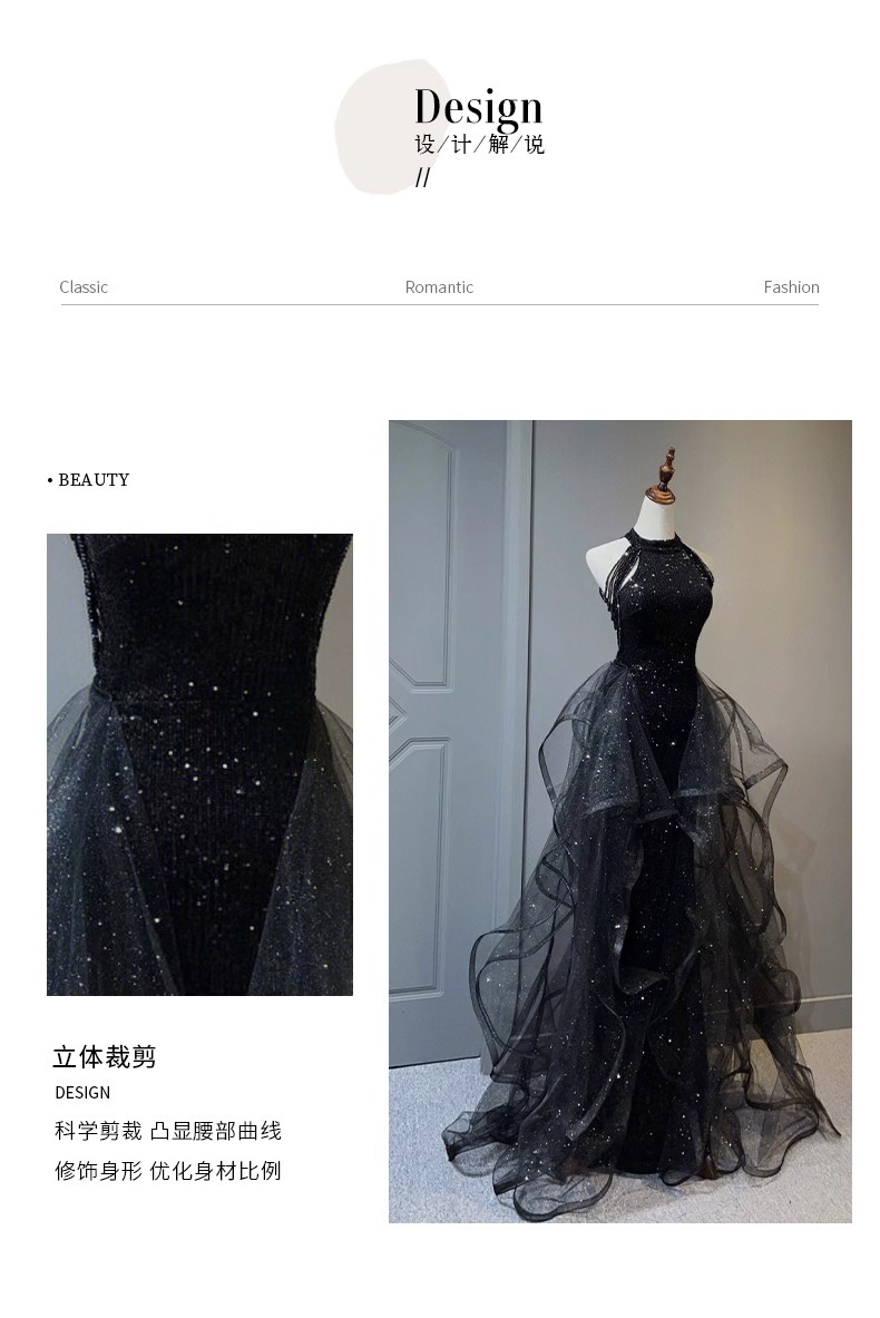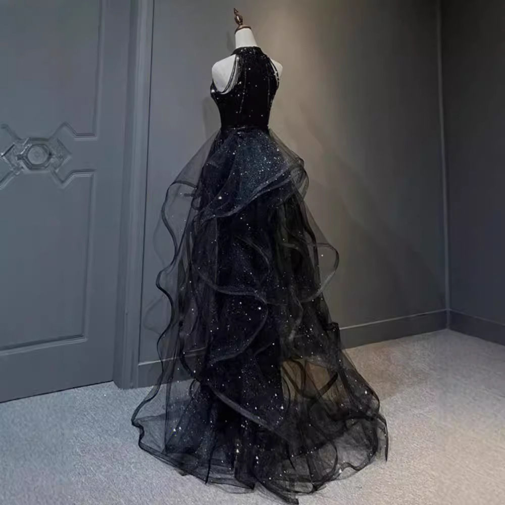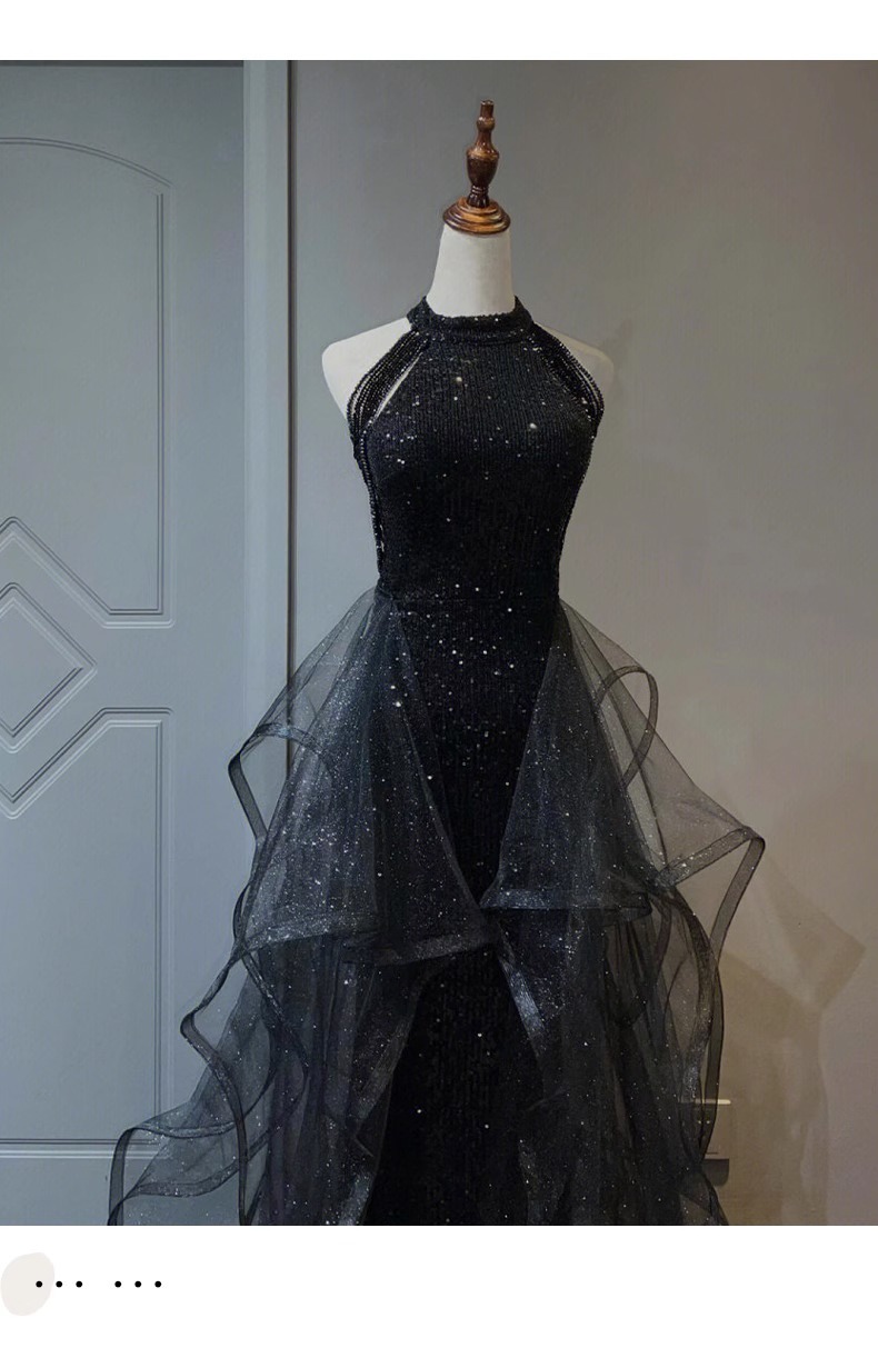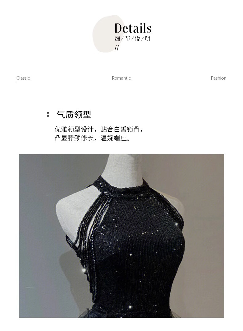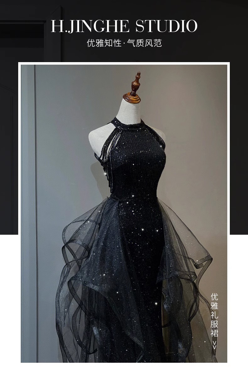 Черное вечернее платье, легкое роскошное нишевое платье с воротником-халтером, стиль ежегодной вечеринки, блестки, экзамен по вокальному искусству для женщин
