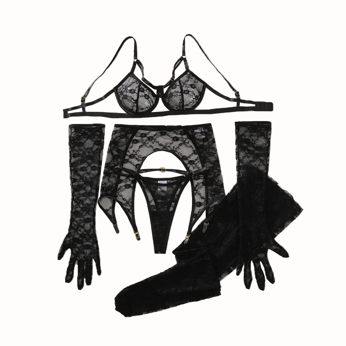 Европейский и американский трансграничный комплект нижнего белья 2025 года: новые чёрные кружевные чулки с эффектом прозрачности, корректирующее бельё, сексуальный комплект с разрезом.