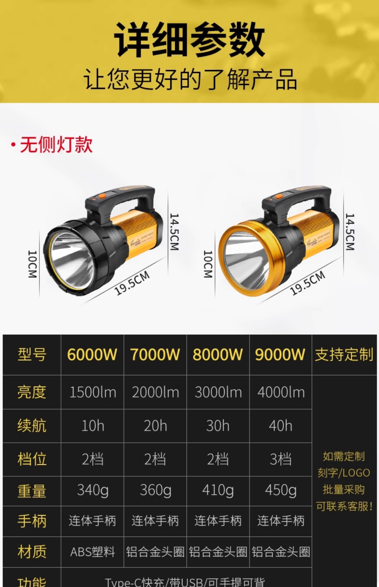 6000 Вт, срок службы батареи 10 часов, одна литиевая батарея с USB; 7000 Вт, время автономной работы 20 часов, литиевая батарея, оголовье из сплава USB; 8000 Вт, время автономной работы 30 часов, тройная литиевая батарея, оголовье из сплава USB; Рекомендовано менеджером магазина, 9000 Вт, время автономной работы 40 часов, четыре литиевых аккумулятора, оголовье из сплава с USB-дисплеем; 9800 Вт, срок службы батареи 100 часов, четыре литиевые батареи, алюминиевый сплав, электронный дисплей USB, односторонний фонарь; 9900 Вт, срок службы батареи 100 часов, четыре литиевые батареи, алюминиевый сплав с USB-дисплеем, двойные боковые фонари; Четырехъядерный процессор мощностью 12000 Вт, время автономной работы 120 часов, девять литиевых батарей, алюминиевый сплав с электронным дисплеем USB, односторонний фонарь; Четырехъядерный процессор мощностью 15000 Вт, время автономной работы 120 часов, девять литиевых батарей, алюминиевый сплав с электронным дисплеем USB, двойные боковые фонари; Верхняя часть оснащена девятикратным ядром мощностью 18000 Вт, временем автономной работы 120 часов, литиевой батареей с девятью элементами, алюминиевым сплавом с электронным дисплеем USB, двойными боковыми огнями.